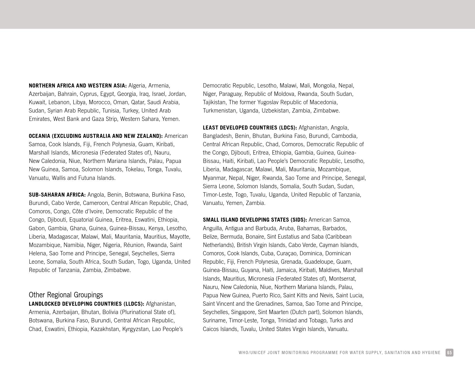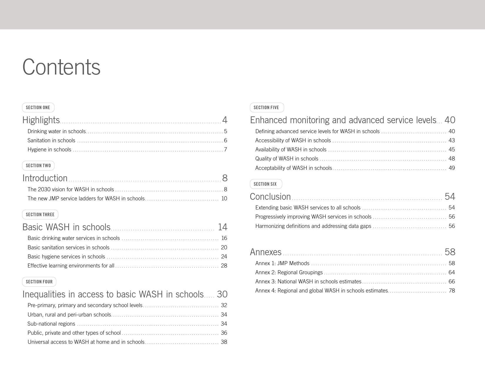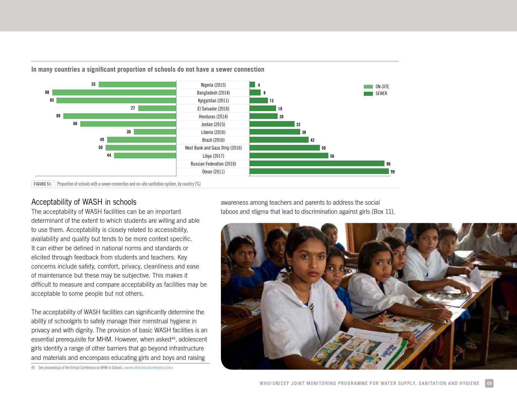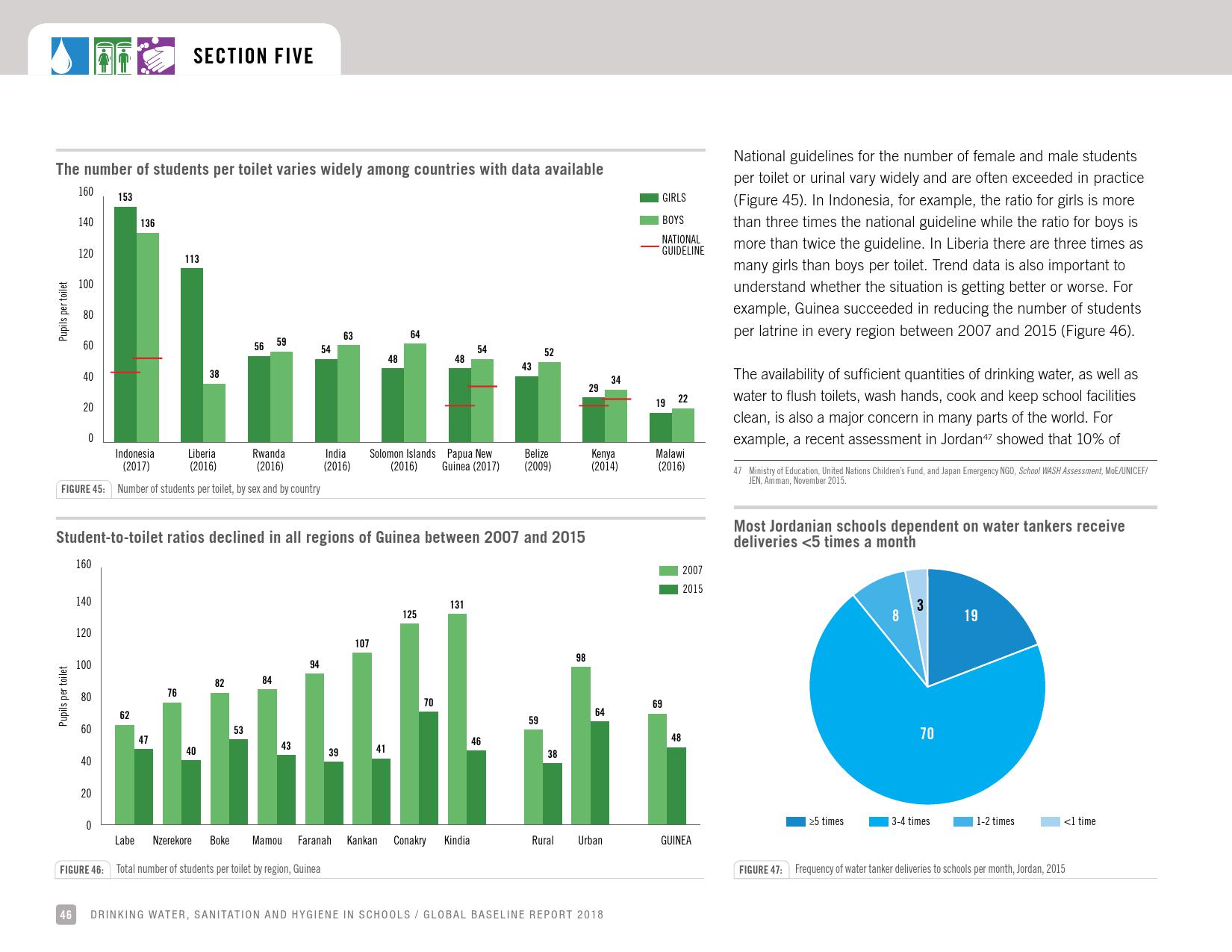 报告显示,全球只有66 %的学校有基本的如厕卫生服务;五分之一的小学和八分之一的中学没有如厕卫生服务。撒哈拉以南非洲和大洋洲三分之一的学校没有如厕卫生服务。在大多数有数据的国家,不到50 %的学校的厕所可供行动能力有限的学生使用。统计显示,全球有6亿在校儿童得不到基本的如厕卫生服务。