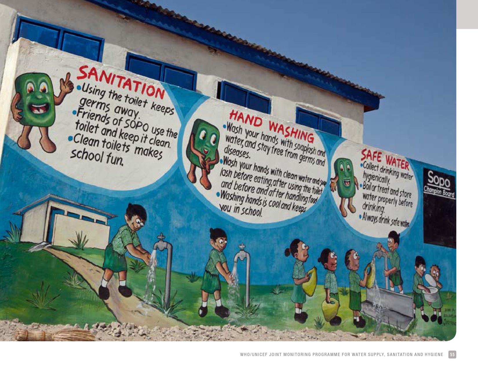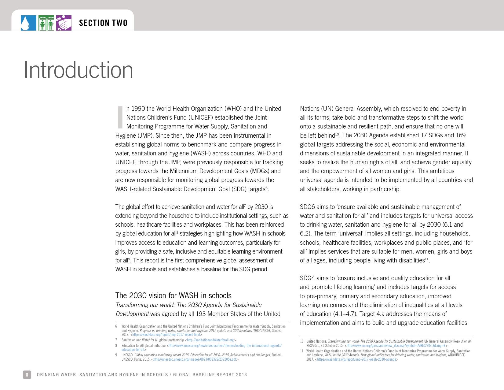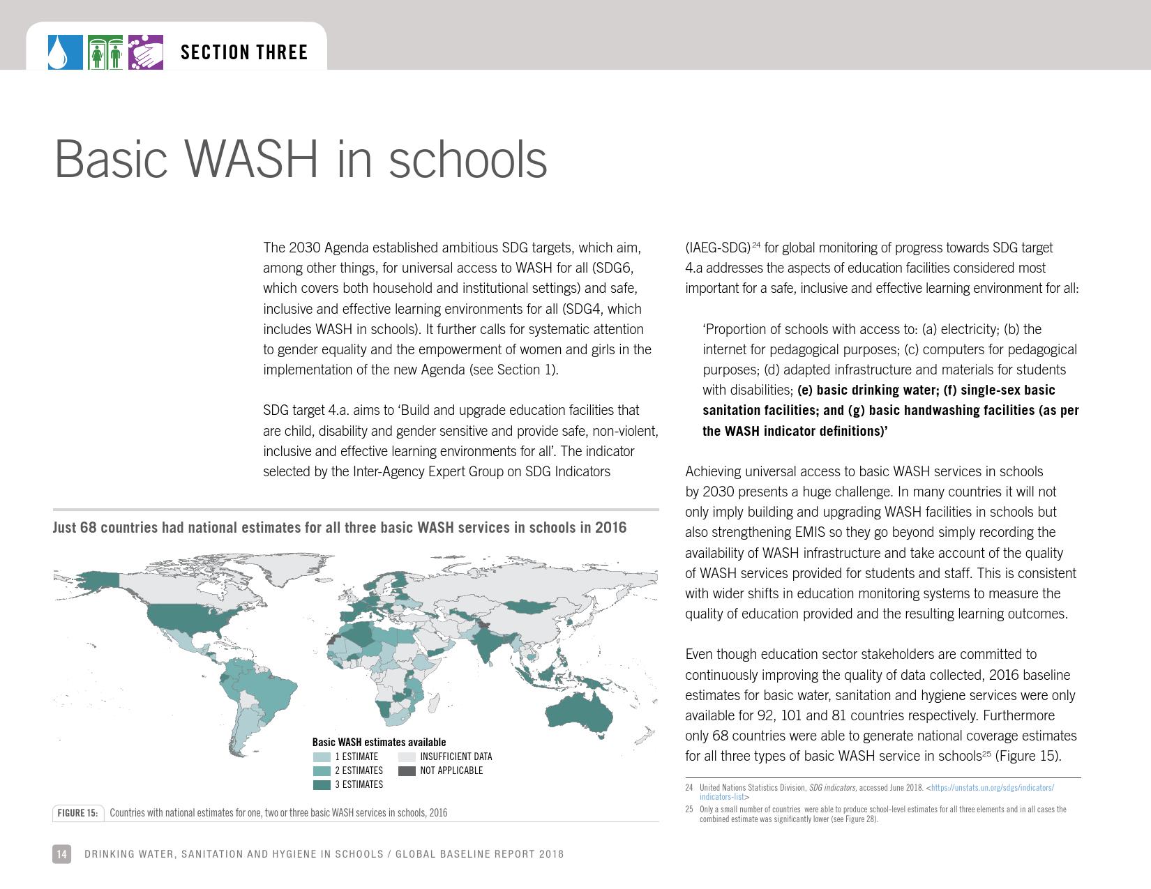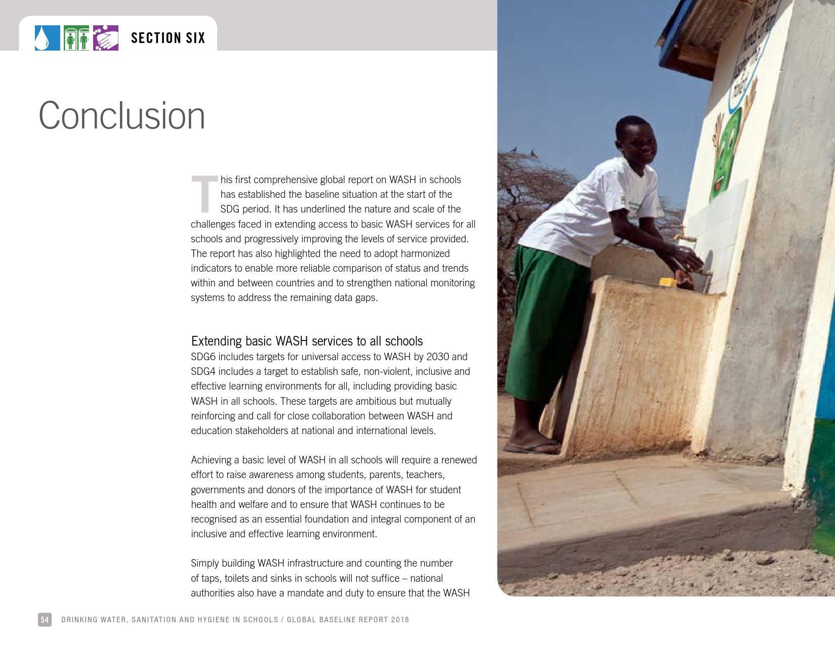 《2018年全球基线报告》表示,到2030年实现人人享有卫生设施和水的全球努力已延伸至家庭范围以外,包括学校、保健设施和工作场所等机构环境。全球全民教育战略对这一努力提供了新的支持。该战略指出,改善学校的饮用水、厕所卫生和个人卫生服务、为所有人提供安全、包容和公平的学习环境可以帮助改善获得教育和学习成果的机会,特别是女孩。