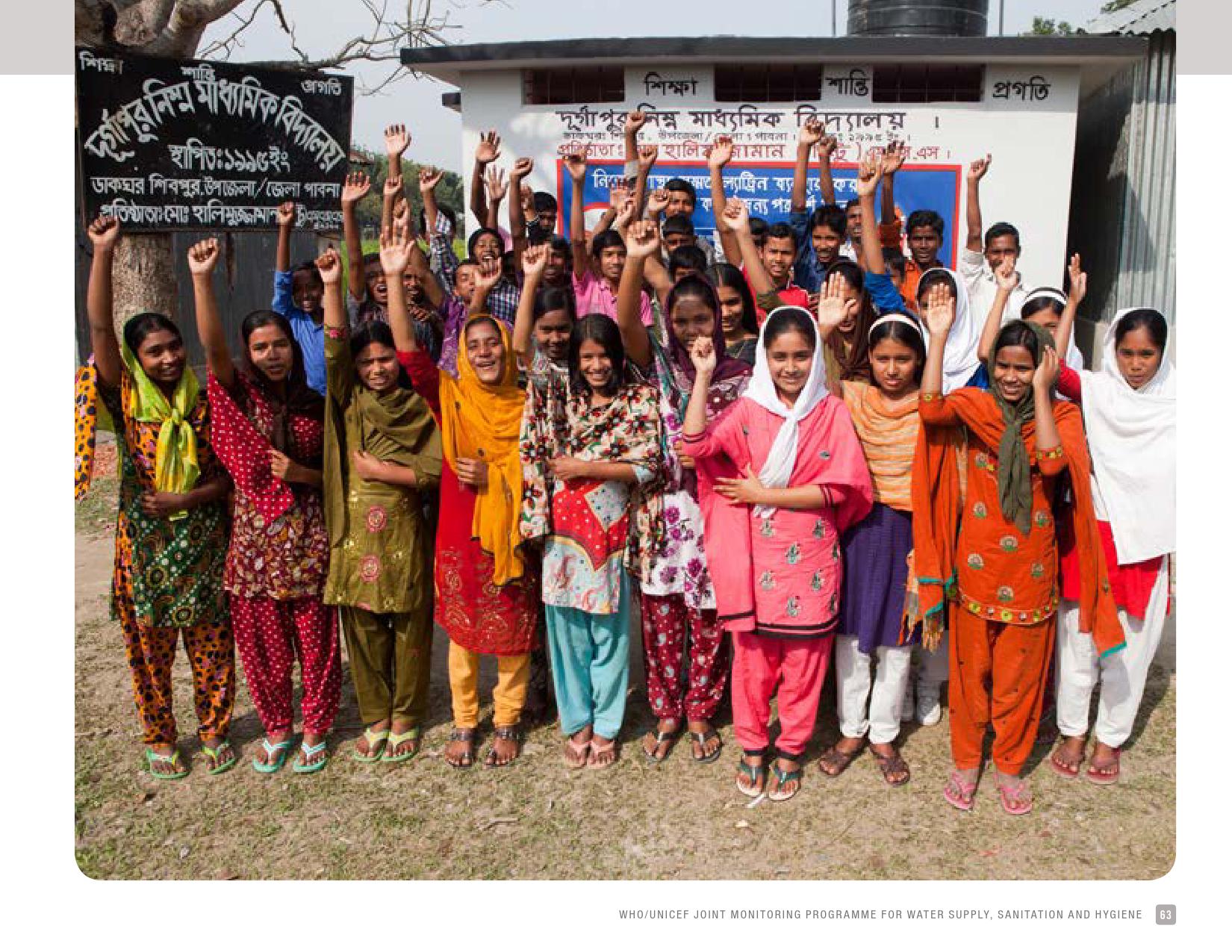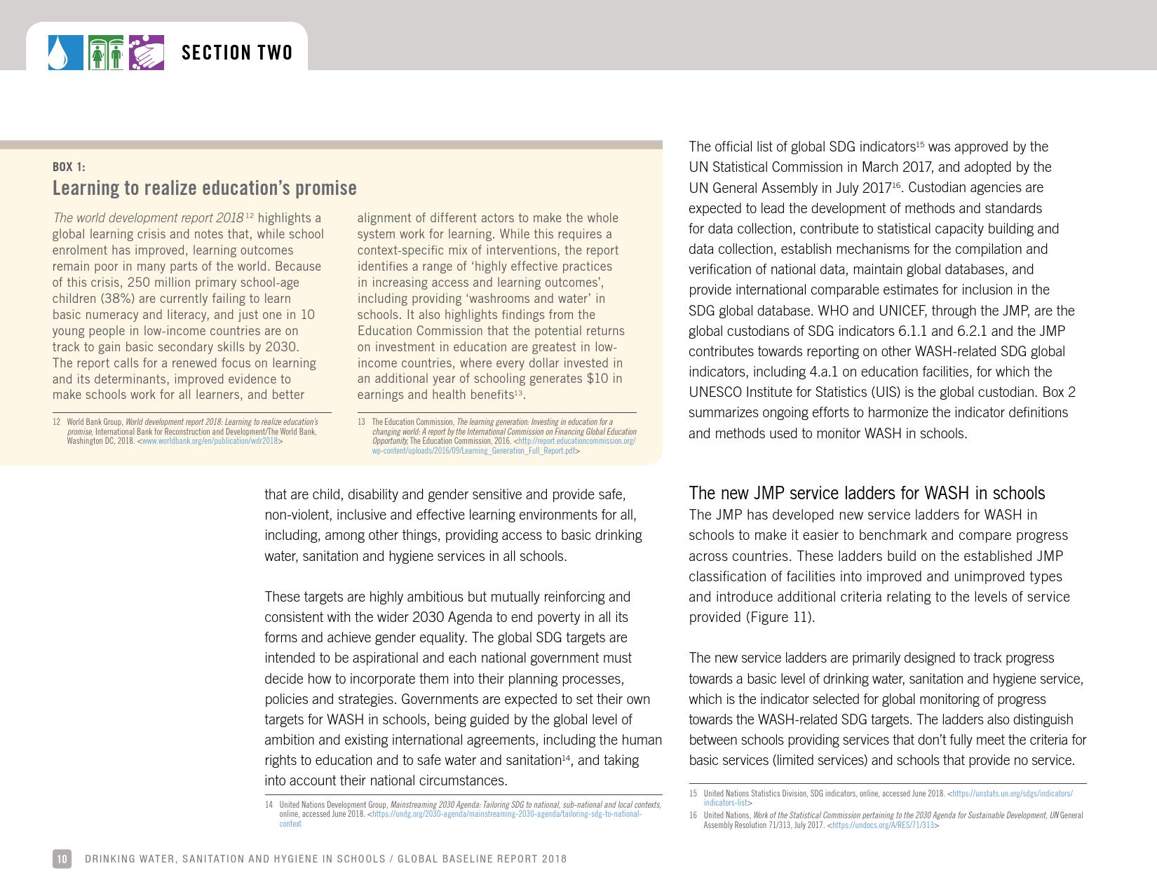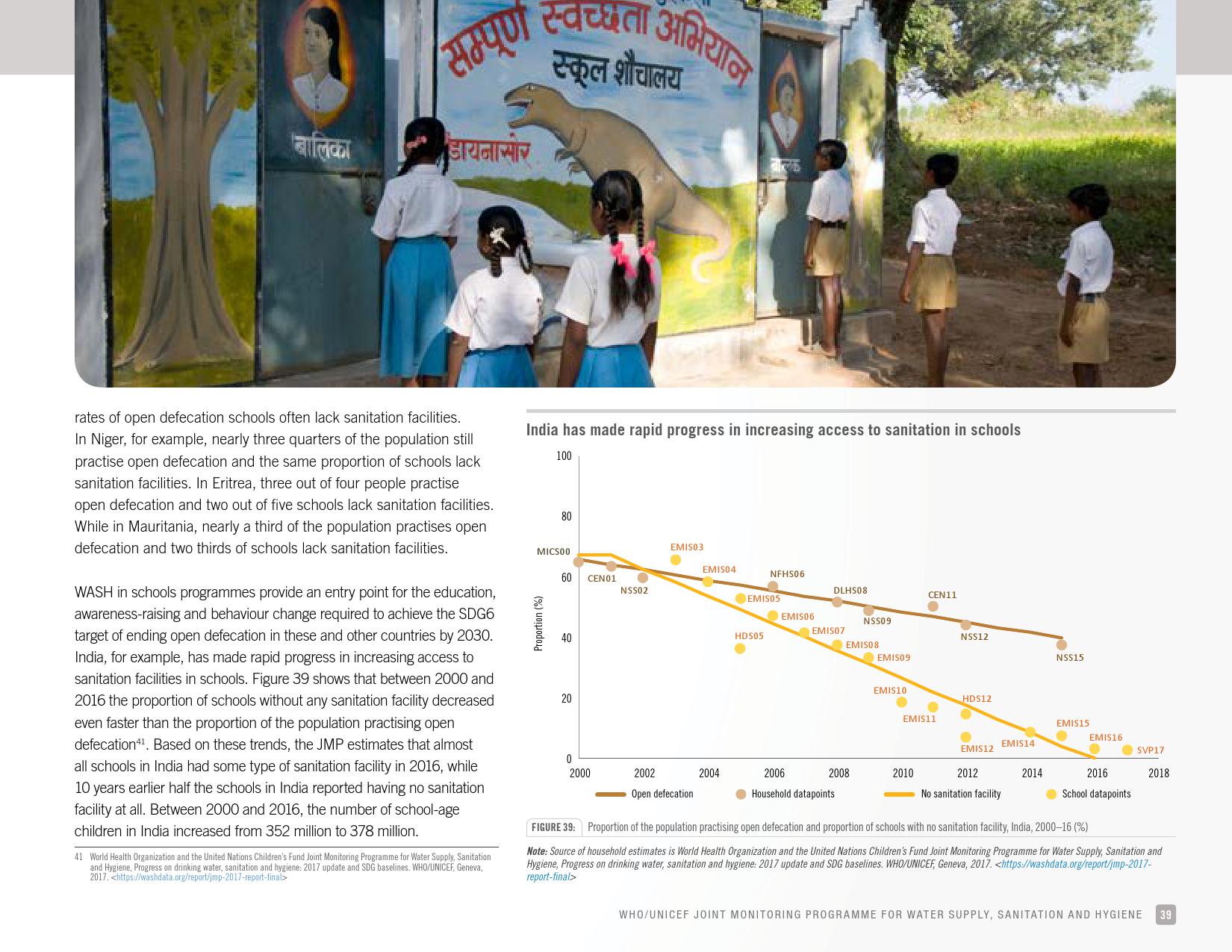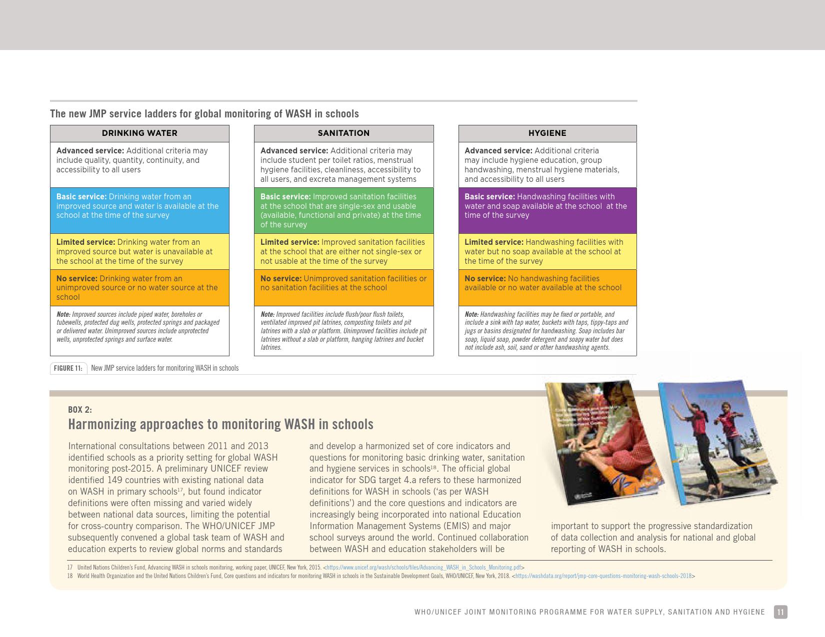 《2018年全球基线报告》表示,到2030年实现人人享有卫生设施和水的全球努力已延伸至家庭范围以外,包括学校、保健设施和工作场所等机构环境。全球全民教育战略对这一努力提供了新的支持。该战略指出,改善学校的饮用水、厕所卫生和个人卫生服务、为所有人提供安全、包容和公平的学习环境可以帮助改善获得教育和学习成果的机会,特别是女孩。