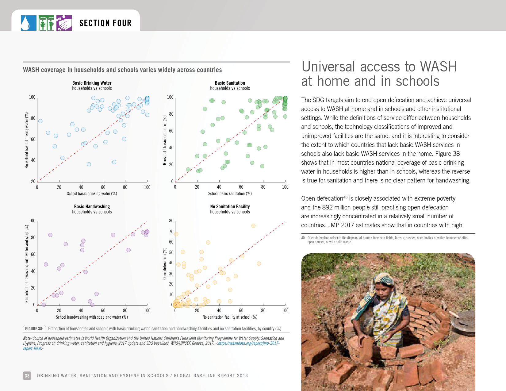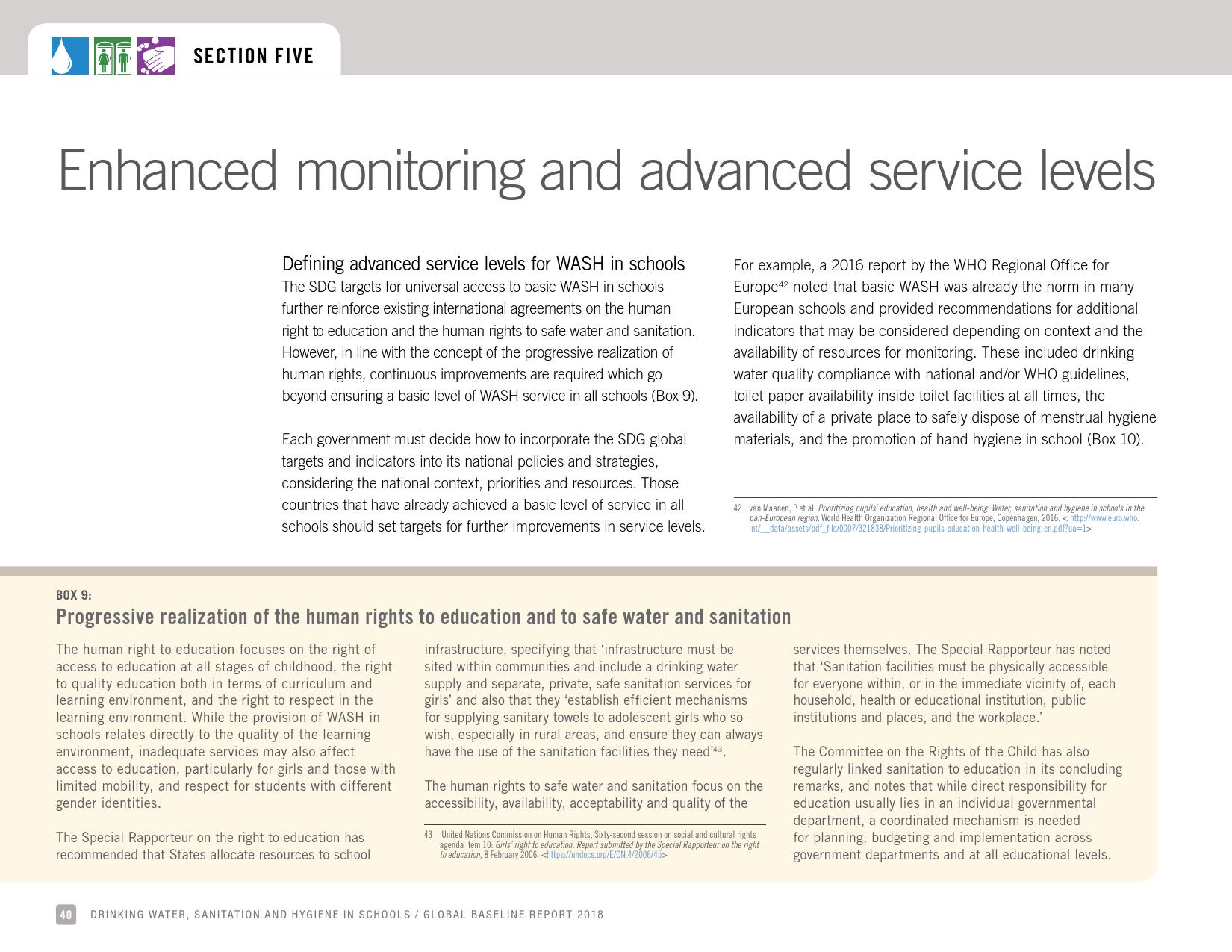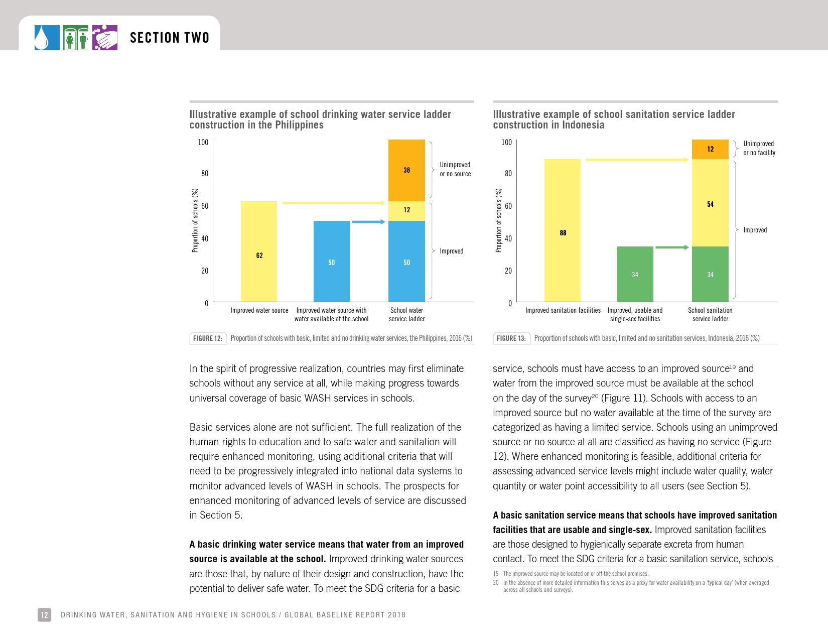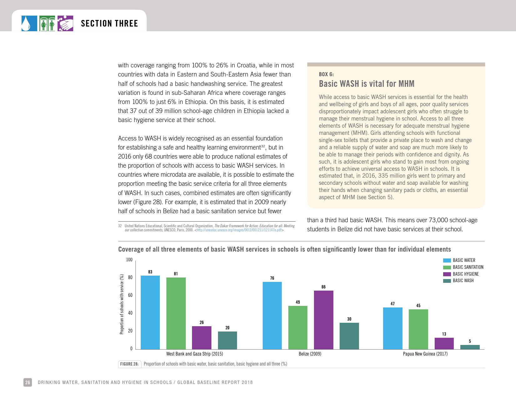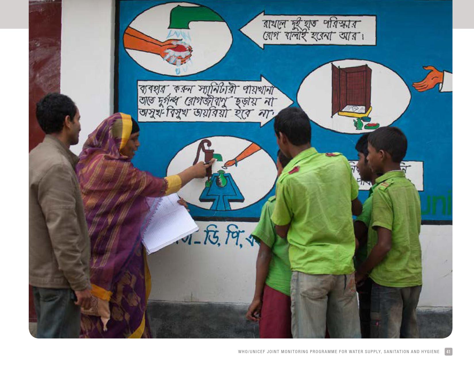 《2018年全球基线报告》表示,到2030年实现人人享有卫生设施和水的全球努力已延伸至家庭范围以外,包括学校、保健设施和工作场所等机构环境。全球全民教育战略对这一努力提供了新的支持。该战略指出,改善学校的饮用水、厕所卫生和个人卫生服务、为所有人提供安全、包容和公平的学习环境可以帮助改善获得教育和学习成果的机会,特别是女孩。