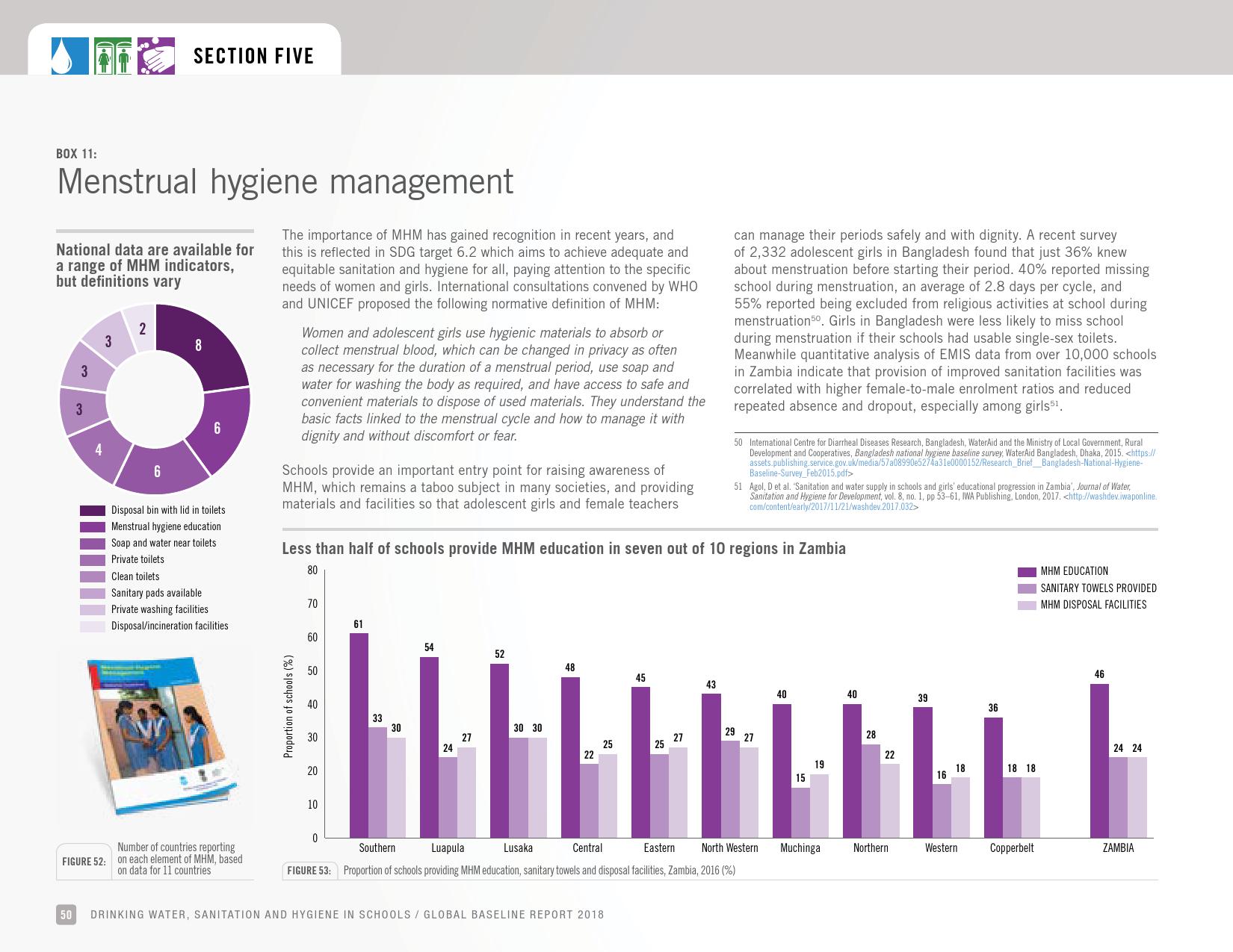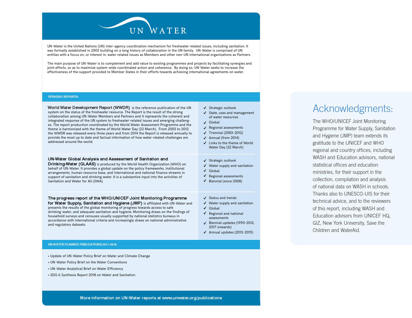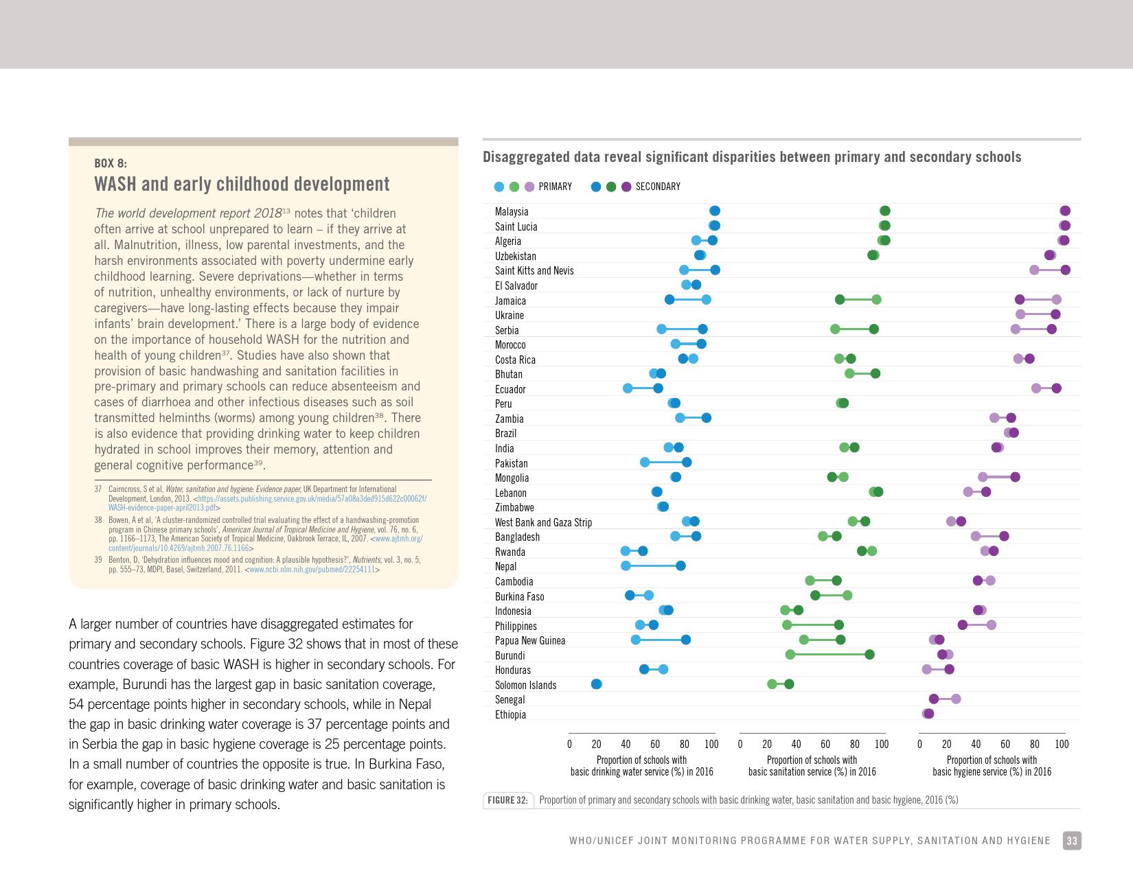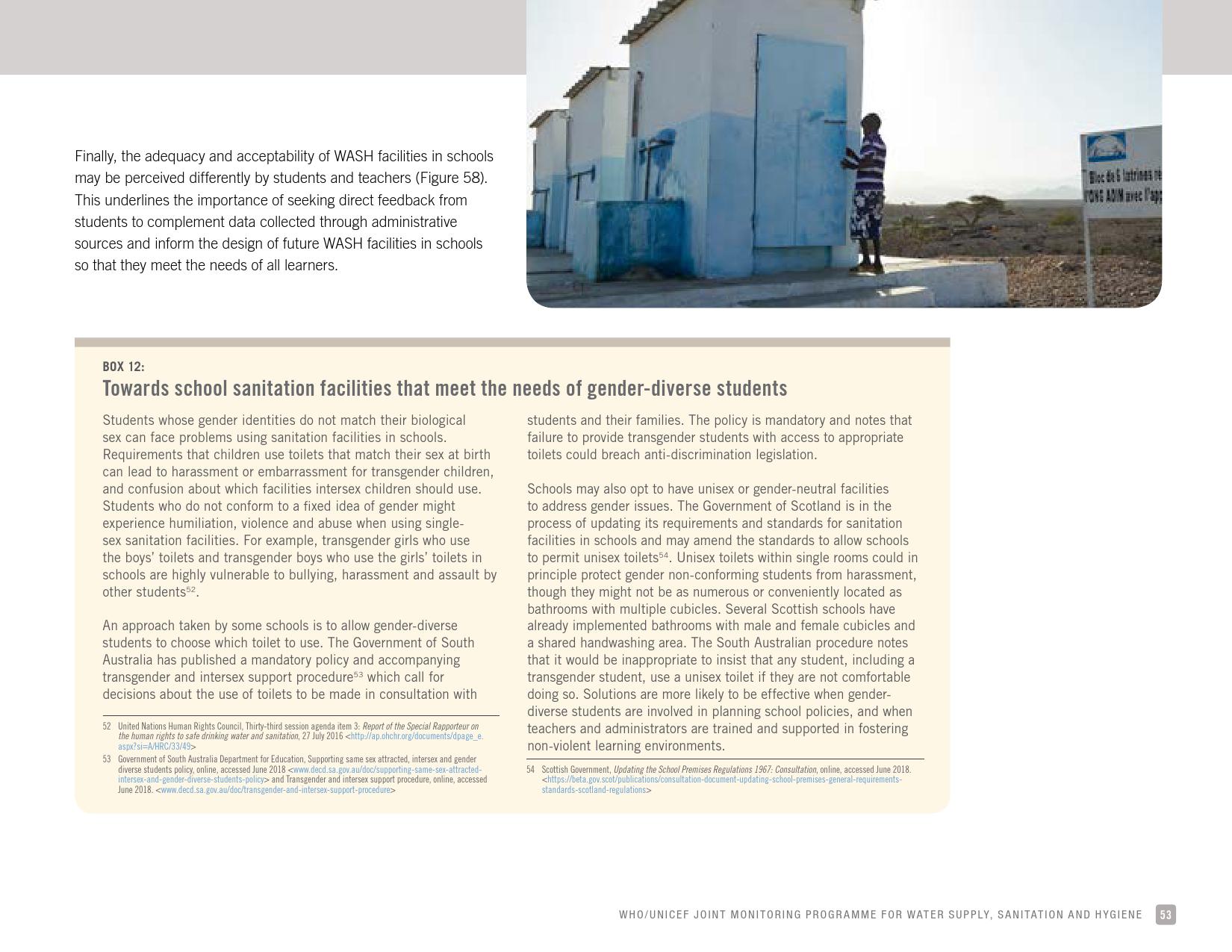 《2018年全球基线报告》表示,到2030年实现人人享有卫生设施和水的全球努力已延伸至家庭范围以外,包括学校、保健设施和工作场所等机构环境。全球全民教育战略对这一努力提供了新的支持。该战略指出,改善学校的饮用水、厕所卫生和个人卫生服务、为所有人提供安全、包容和公平的学习环境可以帮助改善获得教育和学习成果的机会,特别是女孩。