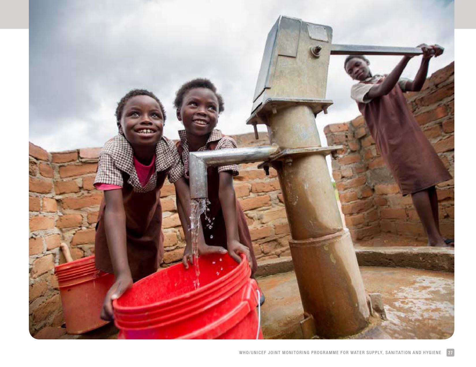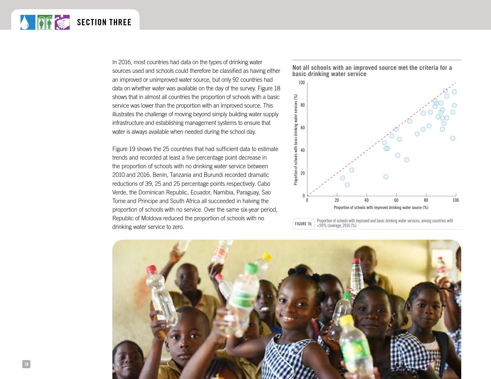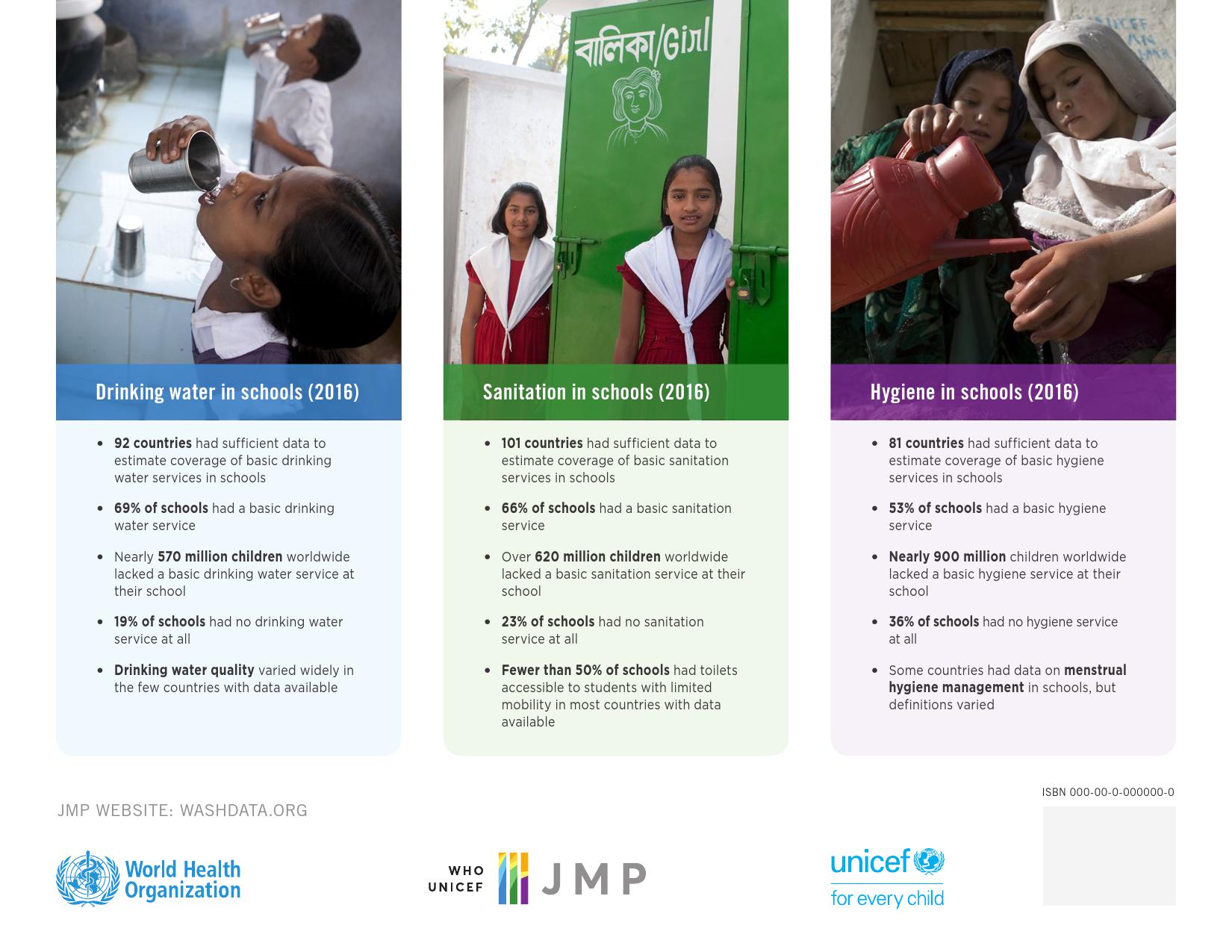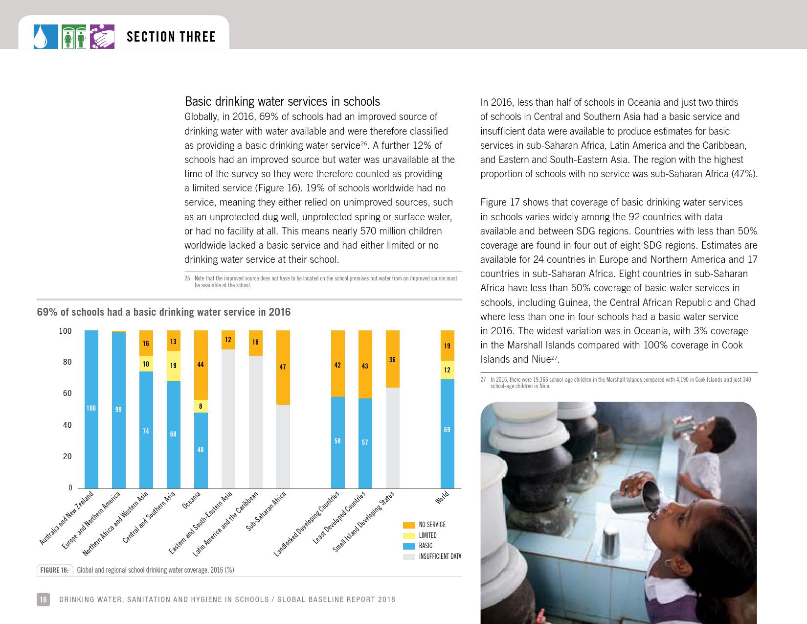 报告表示, 2016年,69 %的学校改善了饮用水的供应来源;19 %的学校没有服务,这意味着它们要么依赖未经改进的水源,如未受保护的井水和未受保护的泉水或地表水,要么根本没有饮水设施。