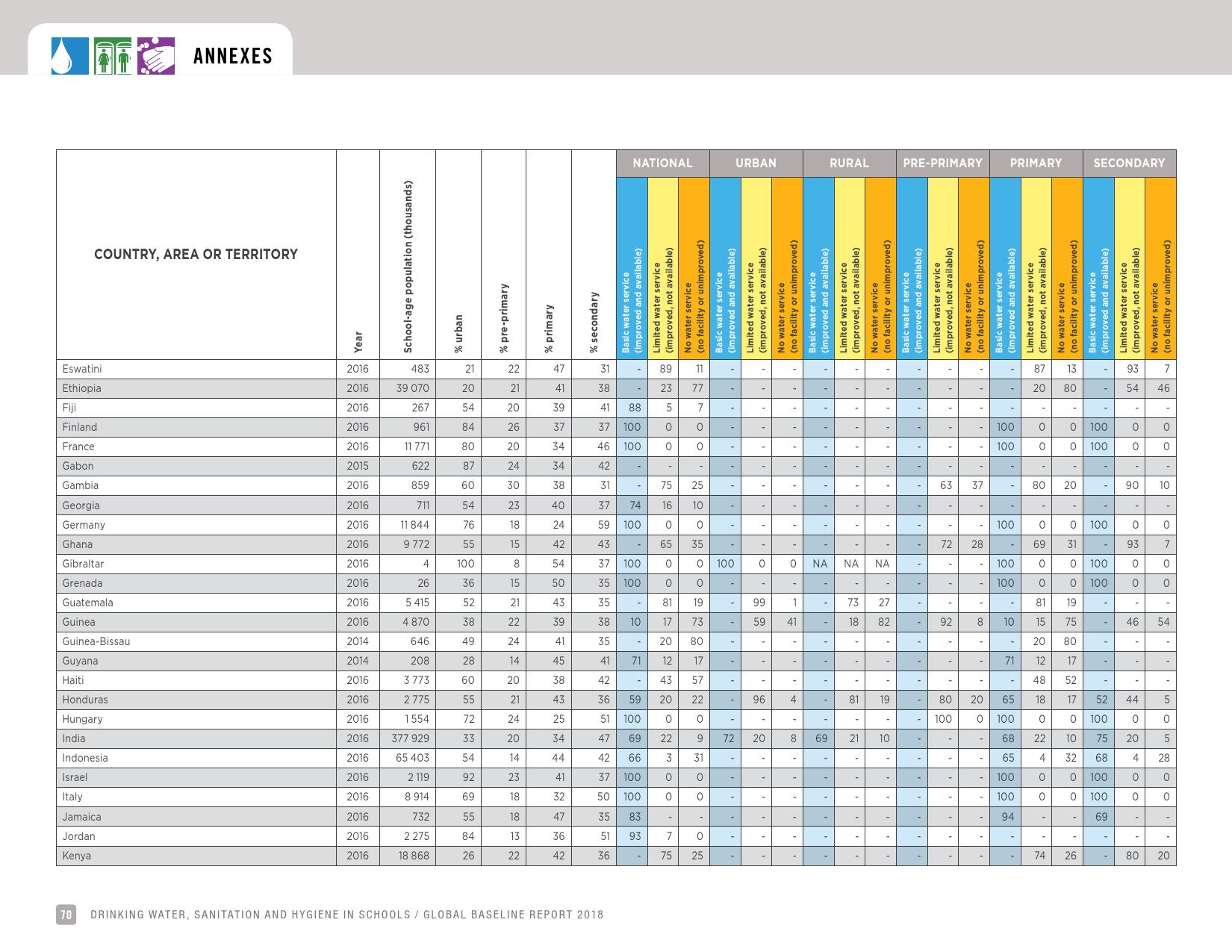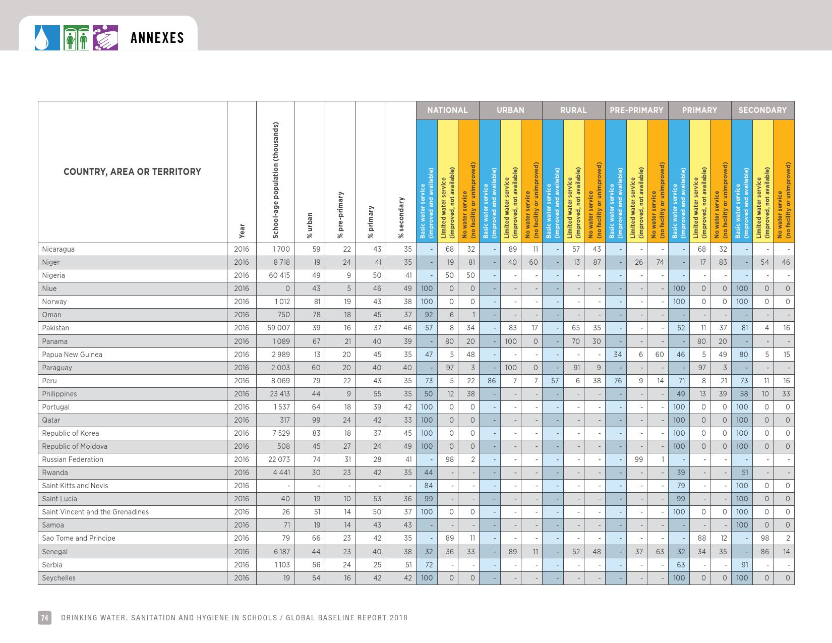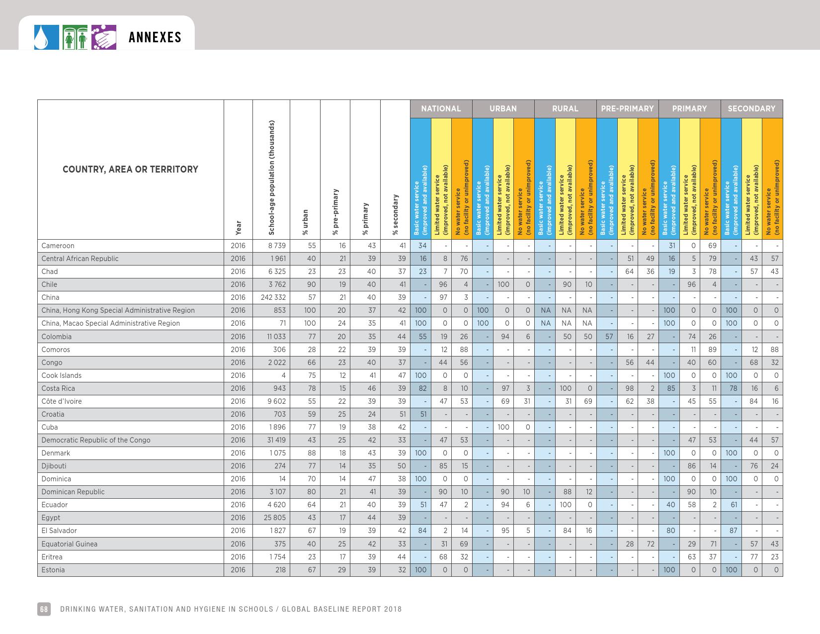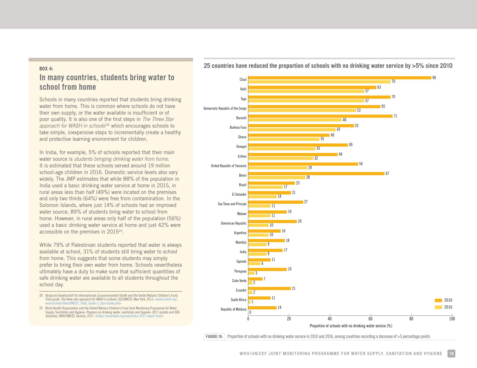 报告表示, 2016年,69 %的学校改善了饮用水的供应来源;19 %的学校没有服务,这意味着它们要么依赖未经改进的水源,如未受保护的井水和未受保护的泉水或地表水,要么根本没有饮水设施。