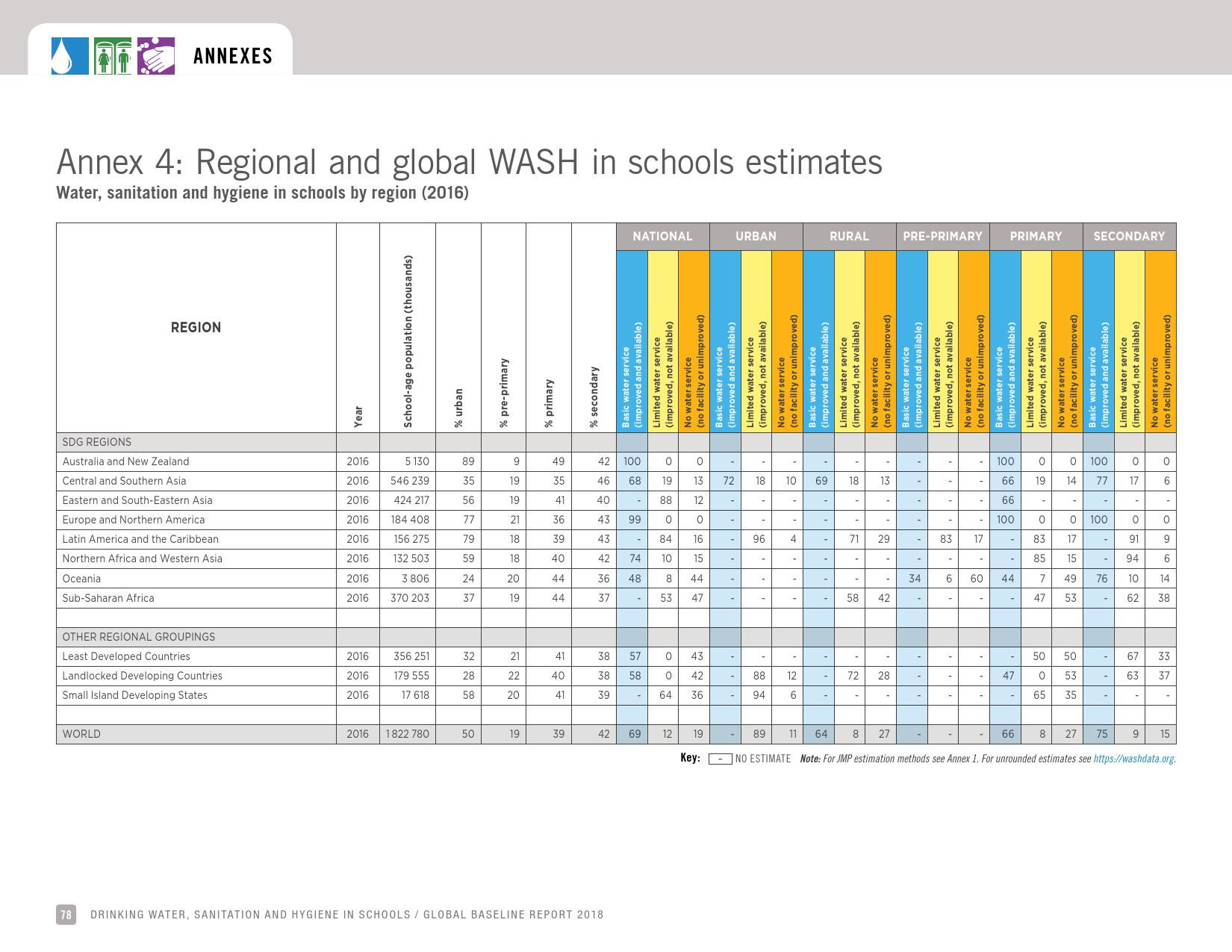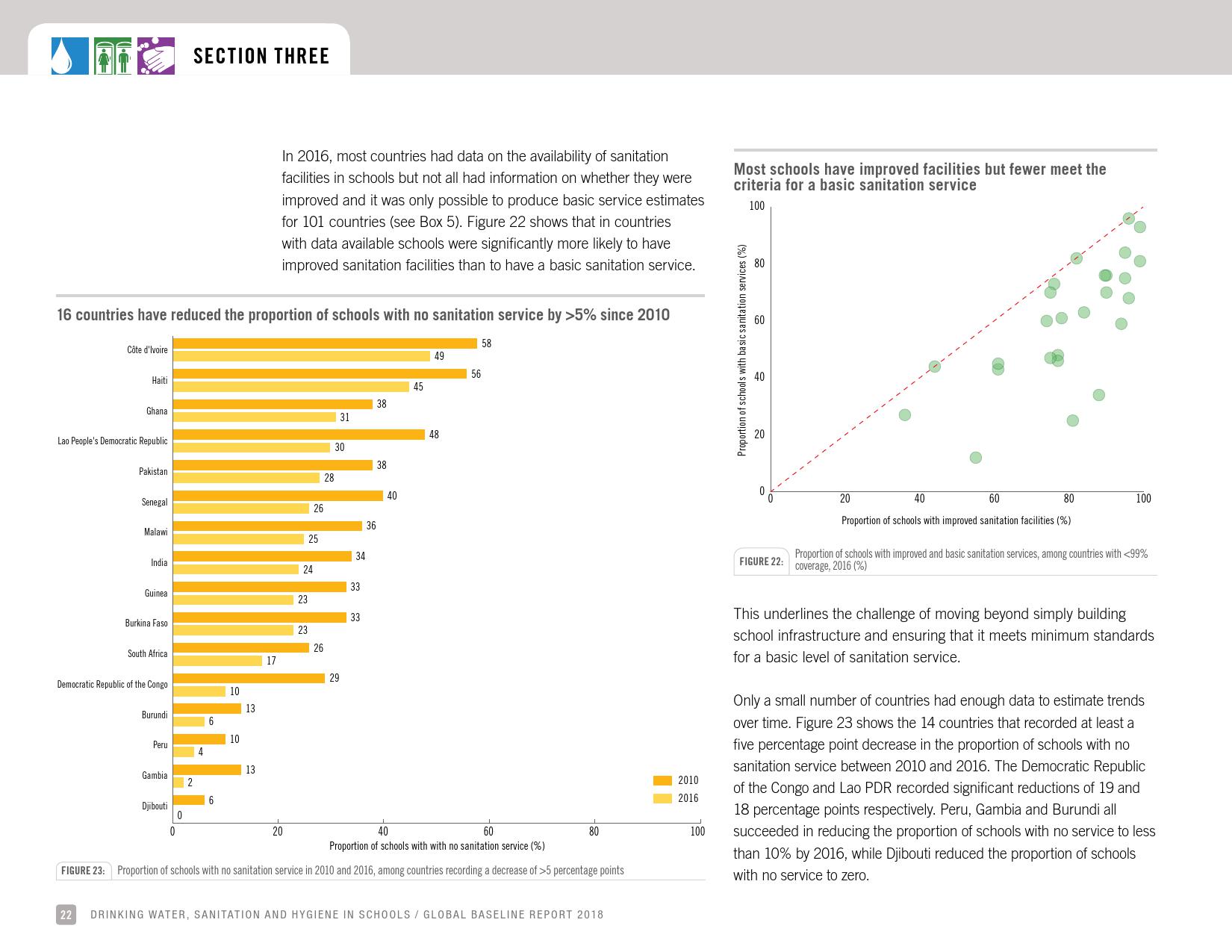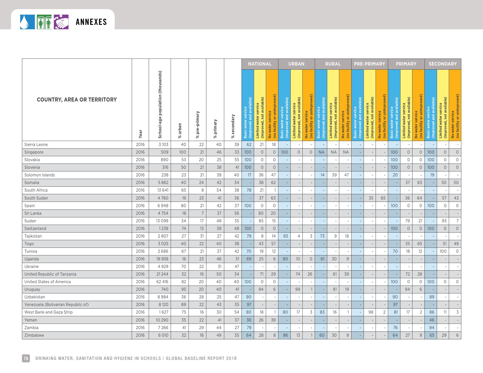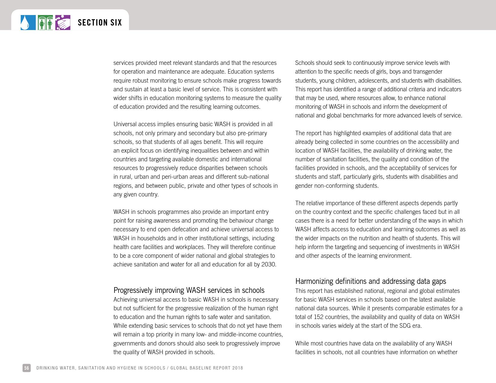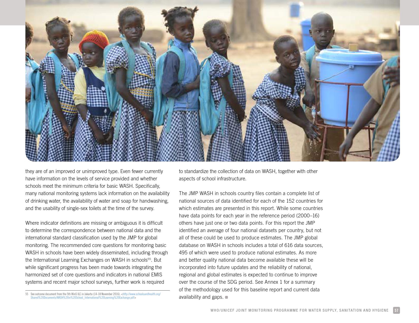 报告认为,到2030年实现学校普及基本的人人享有饮水、环卫和个人卫生服务是一个巨大的挑战。在许多国家,这不仅意味着在学校建设和更新各种卫生设施,还意味着加强教育信息管理系统,使其不仅仅记录卫生基础设施的完备性,还要考虑到为学生和工作人员提供的卫生服务的质量。2016年,就水、环境卫生和个人卫生服务方面具有基线评估的国家分别只有92个、101个和81个。此外,只有68个国家能够就学校的所有三种基本卫生服务提出全国覆盖率估计。