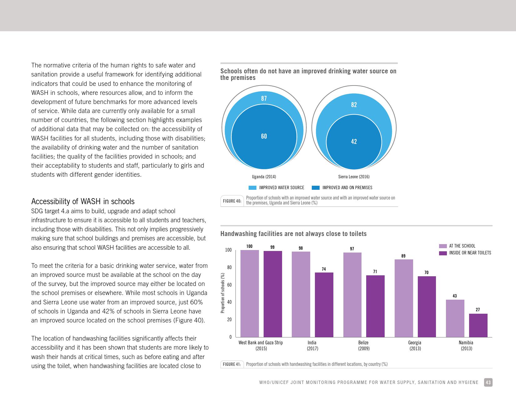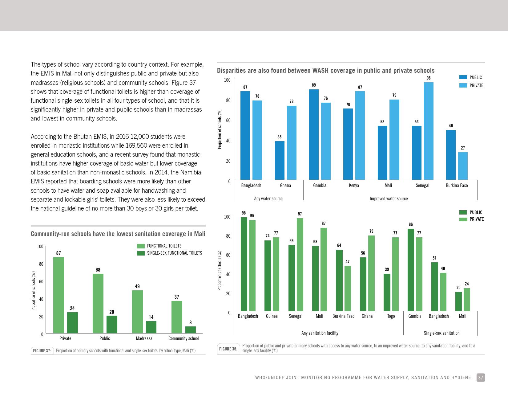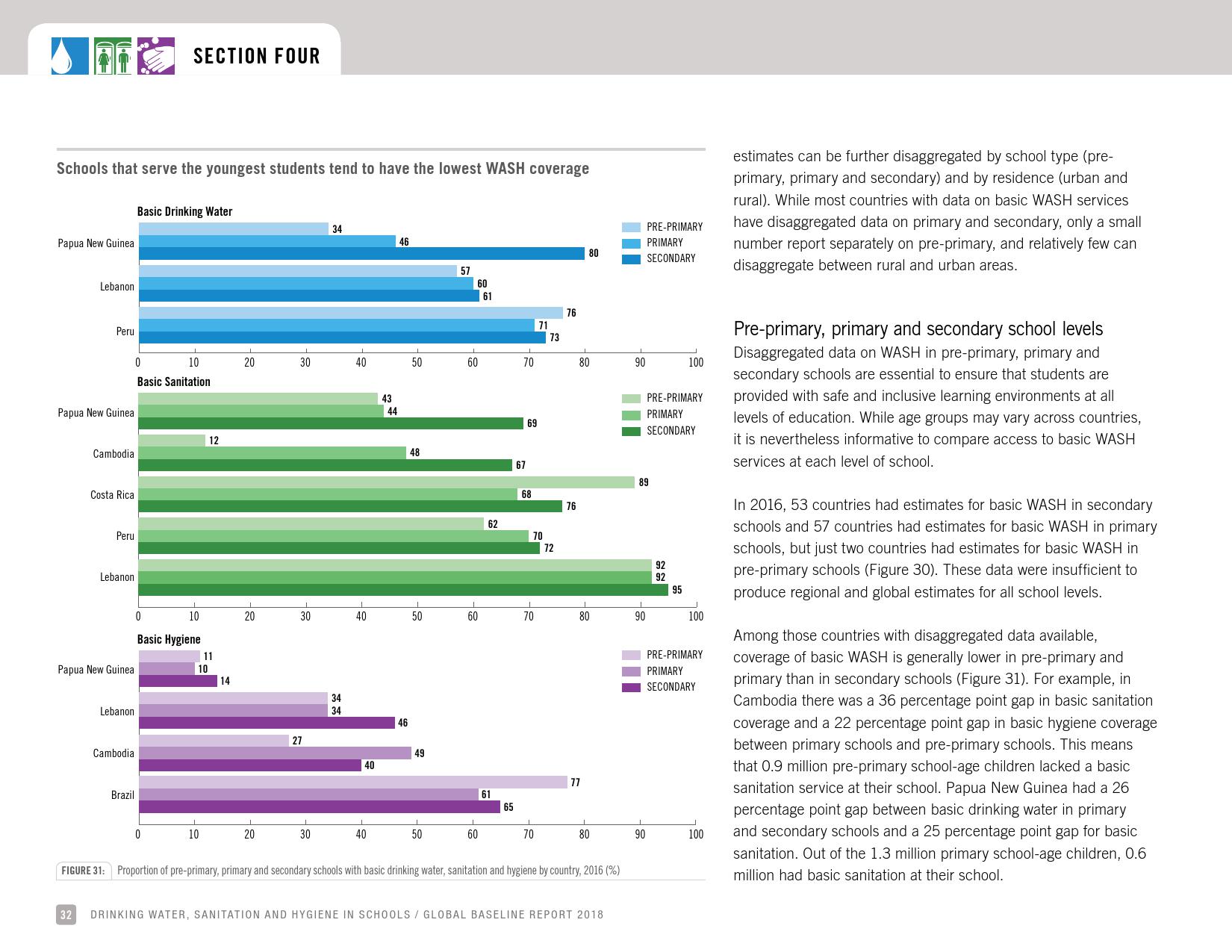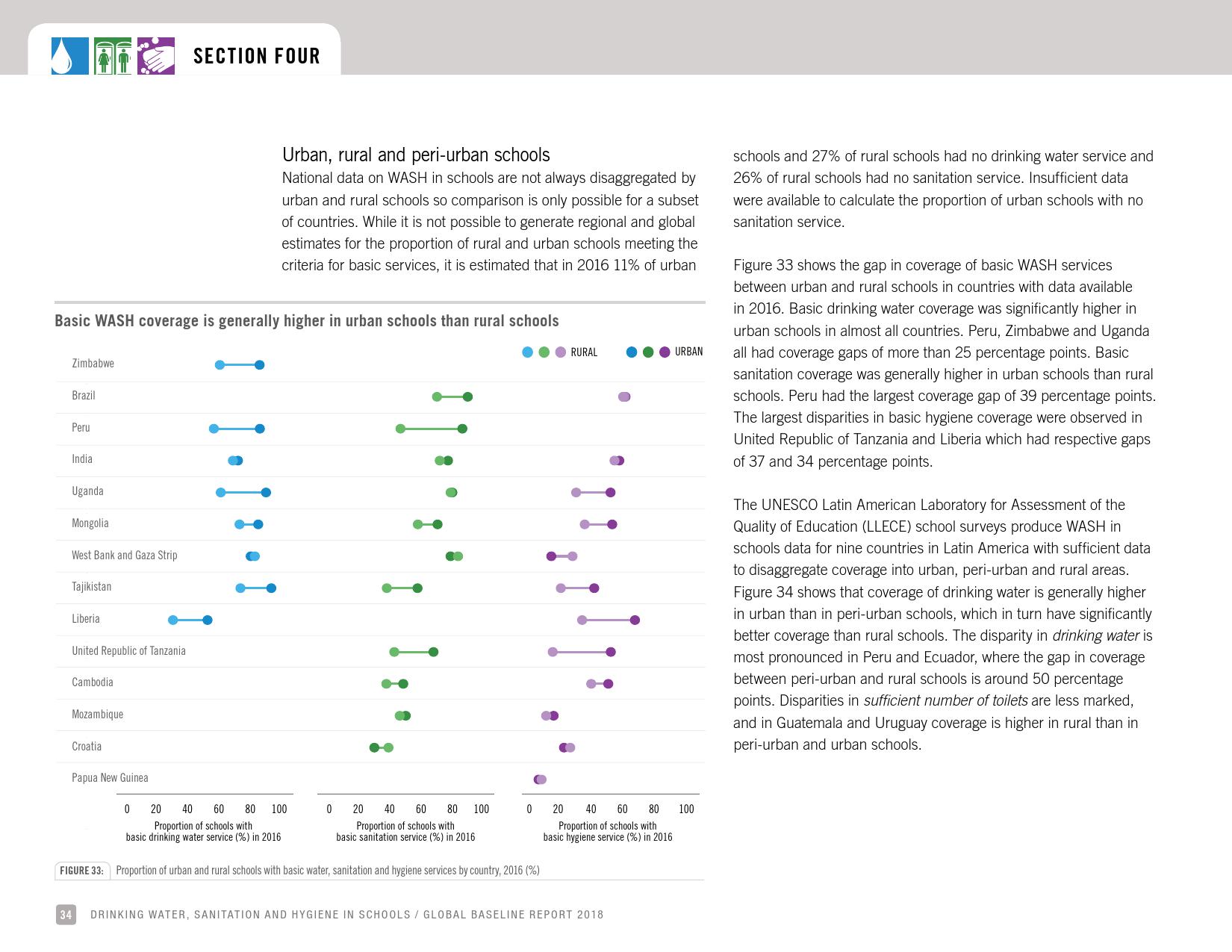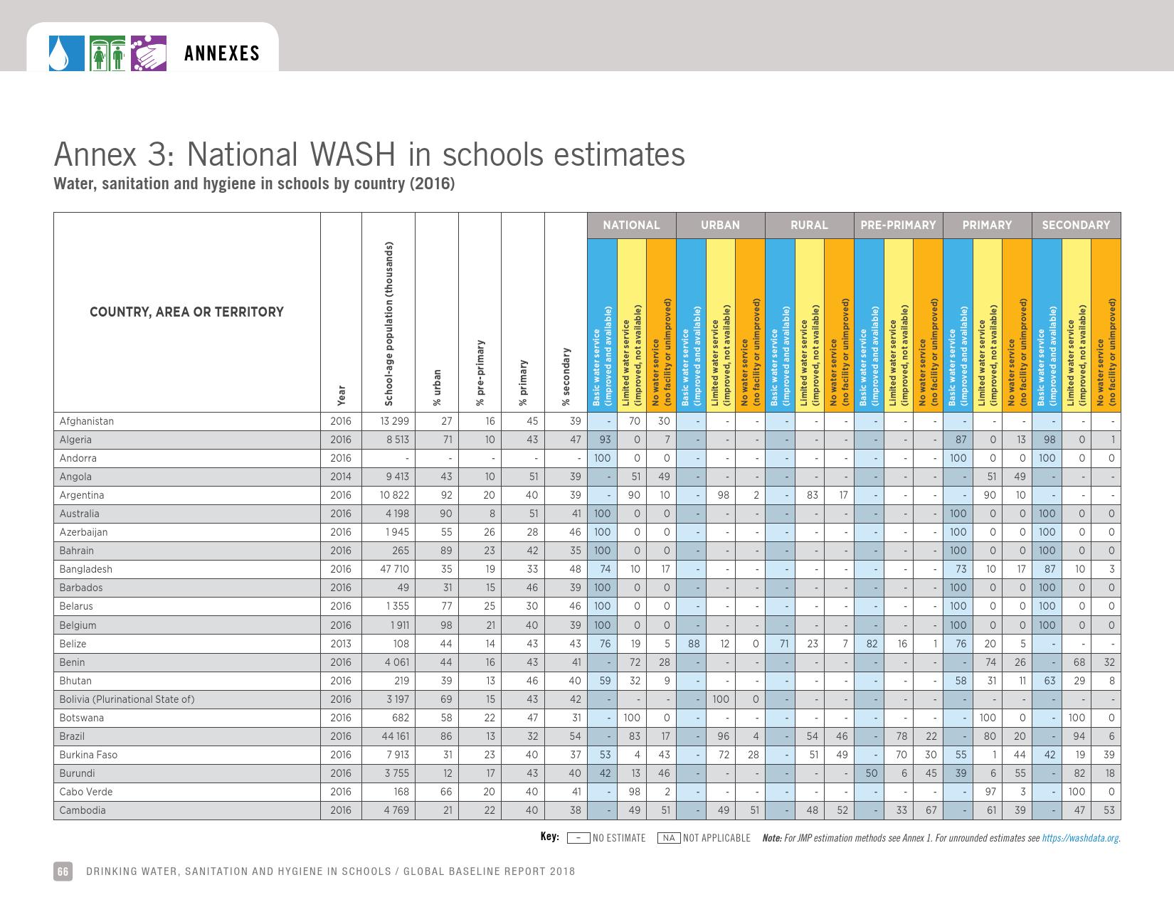 报告认为,到2030年实现学校普及基本的人人享有饮水、环卫和个人卫生服务是一个巨大的挑战。在许多国家,这不仅意味着在学校建设和更新各种卫生设施,还意味着加强教育信息管理系统,使其不仅仅记录卫生基础设施的完备性,还要考虑到为学生和工作人员提供的卫生服务的质量。2016年,就水、环境卫生和个人卫生服务方面具有基线评估的国家分别只有92个、101个和81个。此外,只有68个国家能够就学校的所有三种基本卫生服务提出全国覆盖率估计。