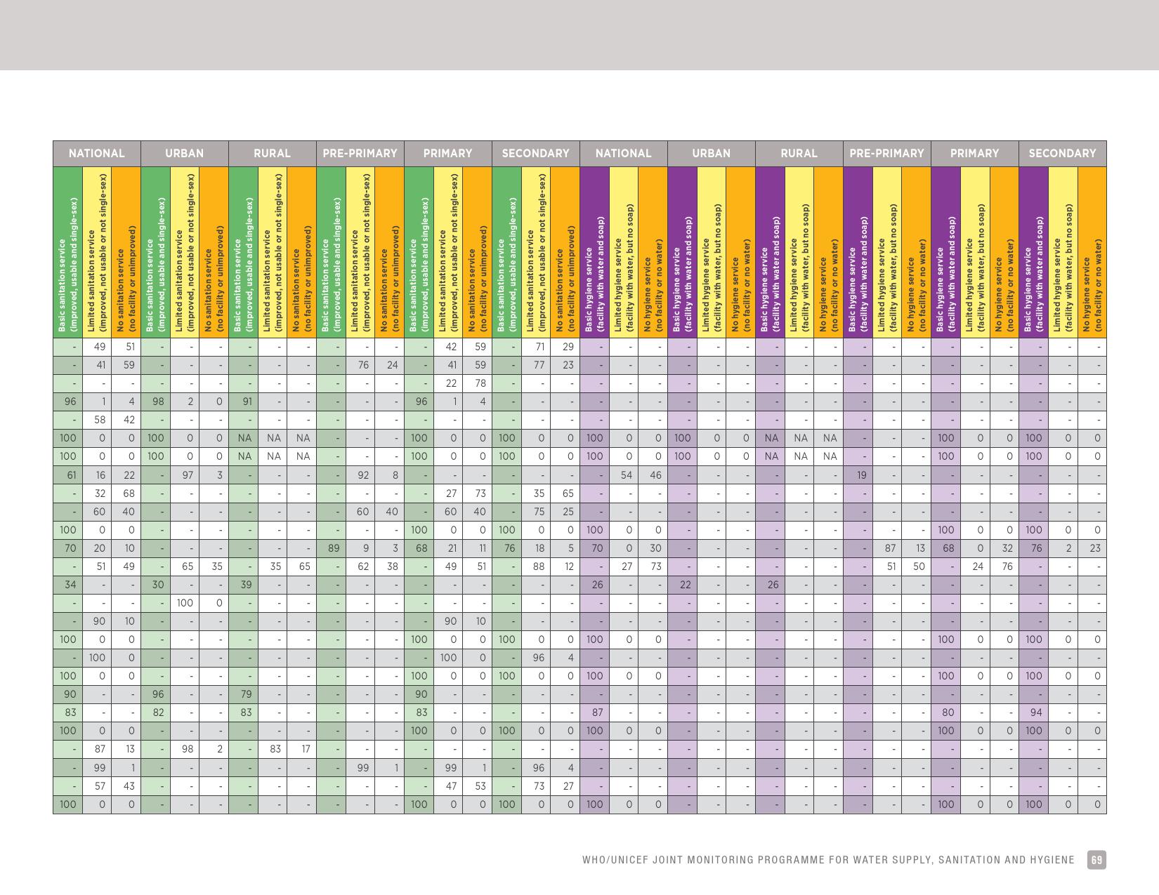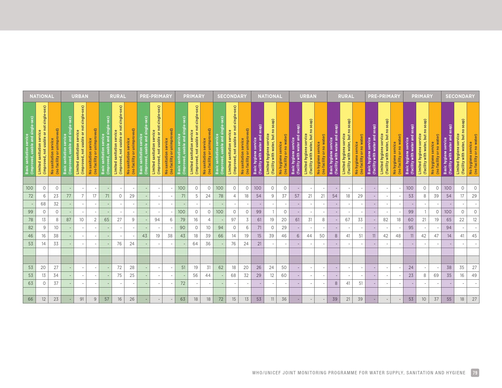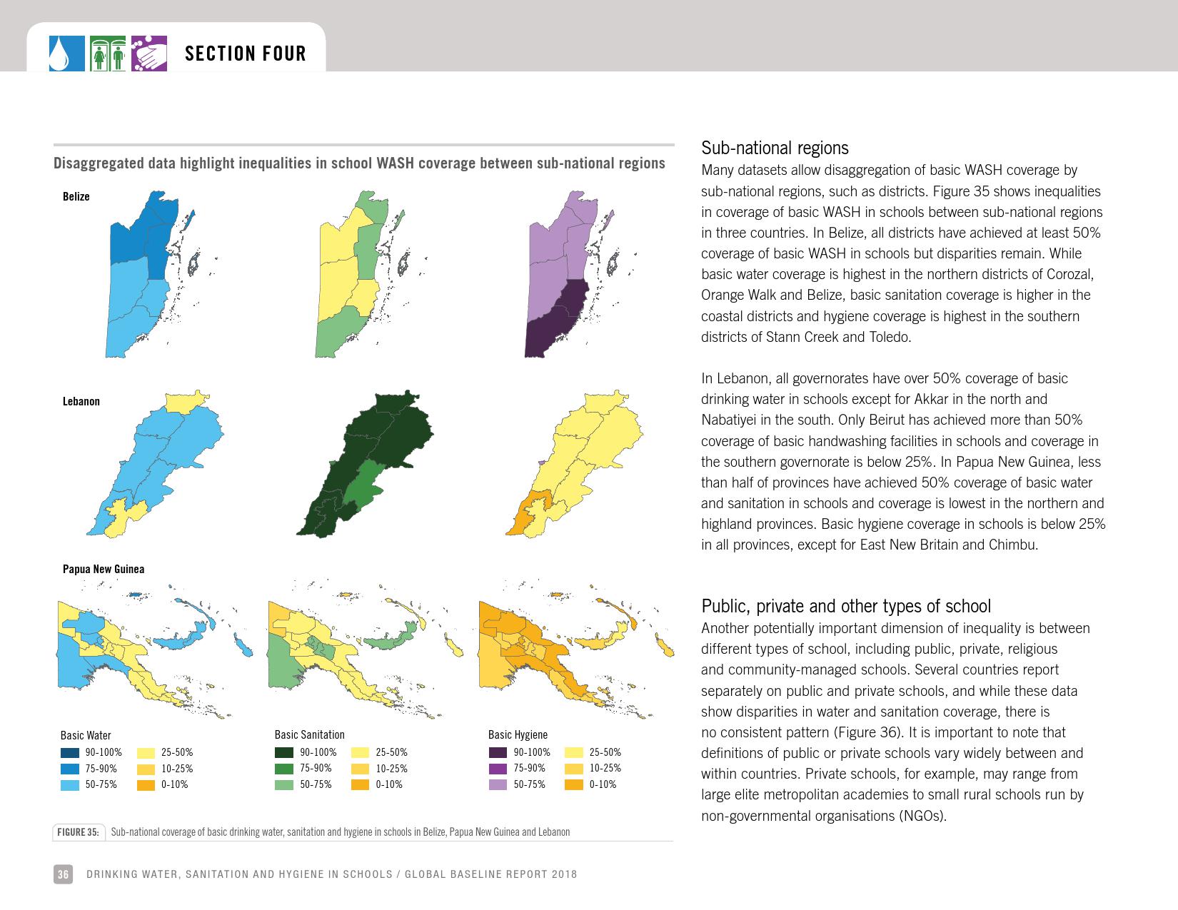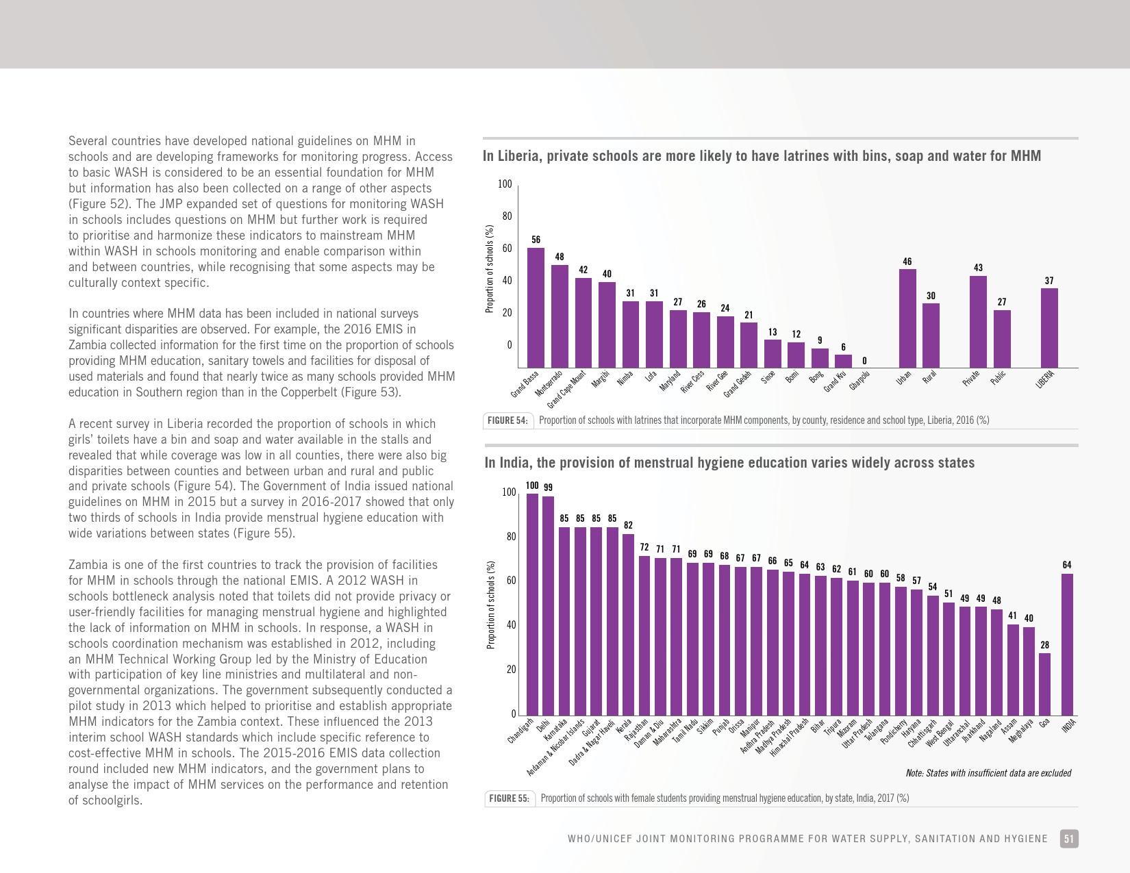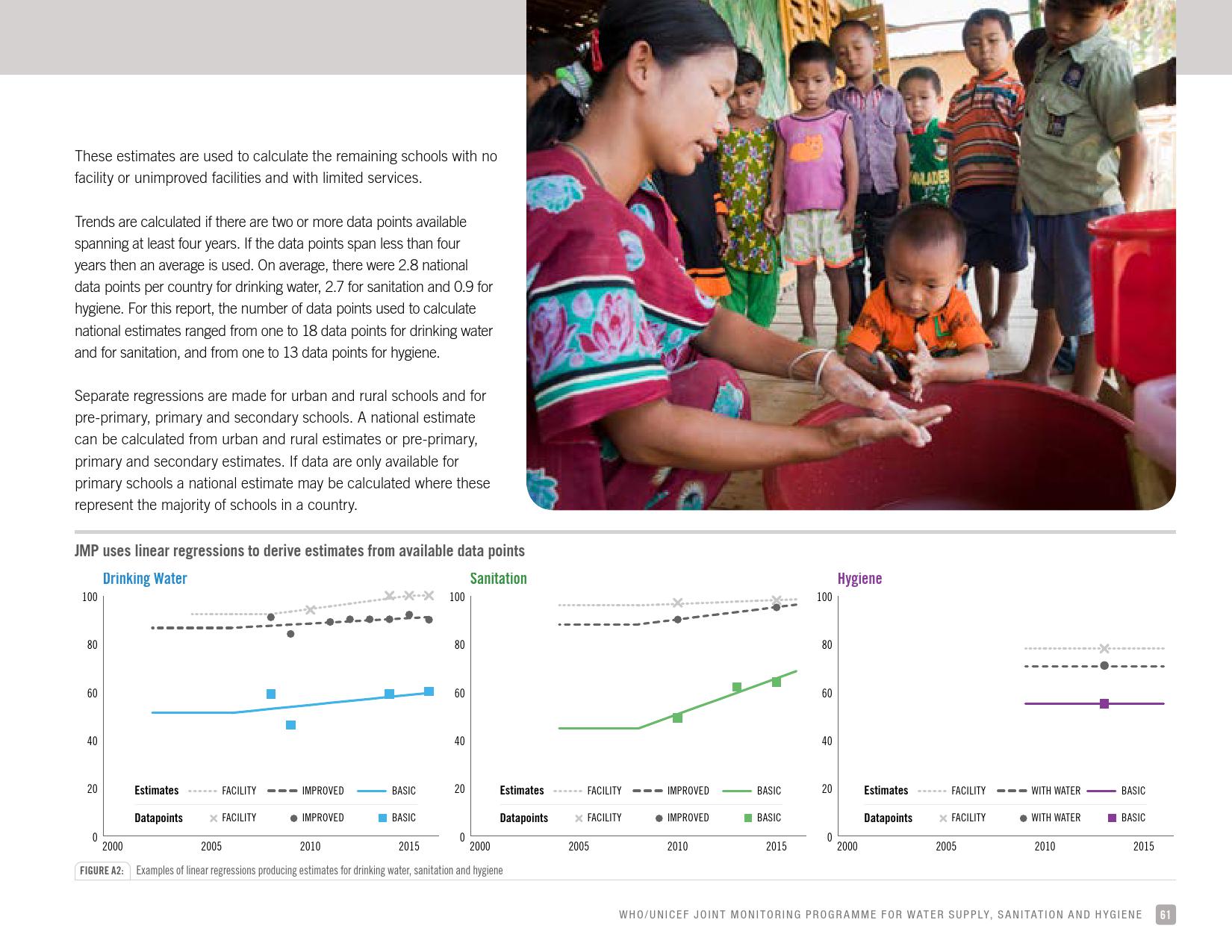 报告认为,到2030年实现学校普及基本的人人享有饮水、环卫和个人卫生服务是一个巨大的挑战。在许多国家,这不仅意味着在学校建设和更新各种卫生设施,还意味着加强教育信息管理系统,使其不仅仅记录卫生基础设施的完备性,还要考虑到为学生和工作人员提供的卫生服务的质量。2016年,就水、环境卫生和个人卫生服务方面具有基线评估的国家分别只有92个、101个和81个。此外,只有68个国家能够就学校的所有三种基本卫生服务提出全国覆盖率估计。