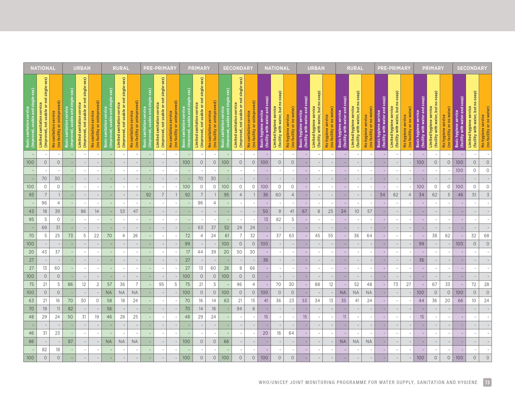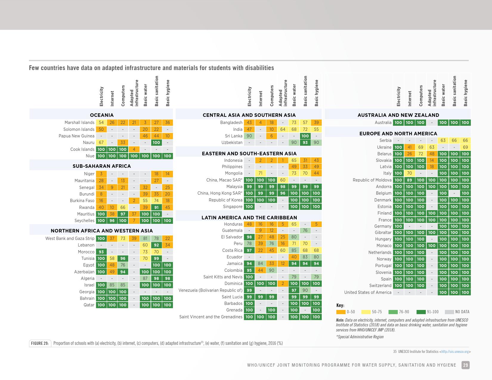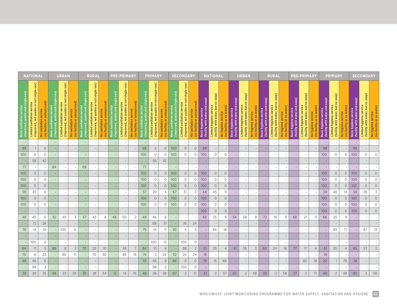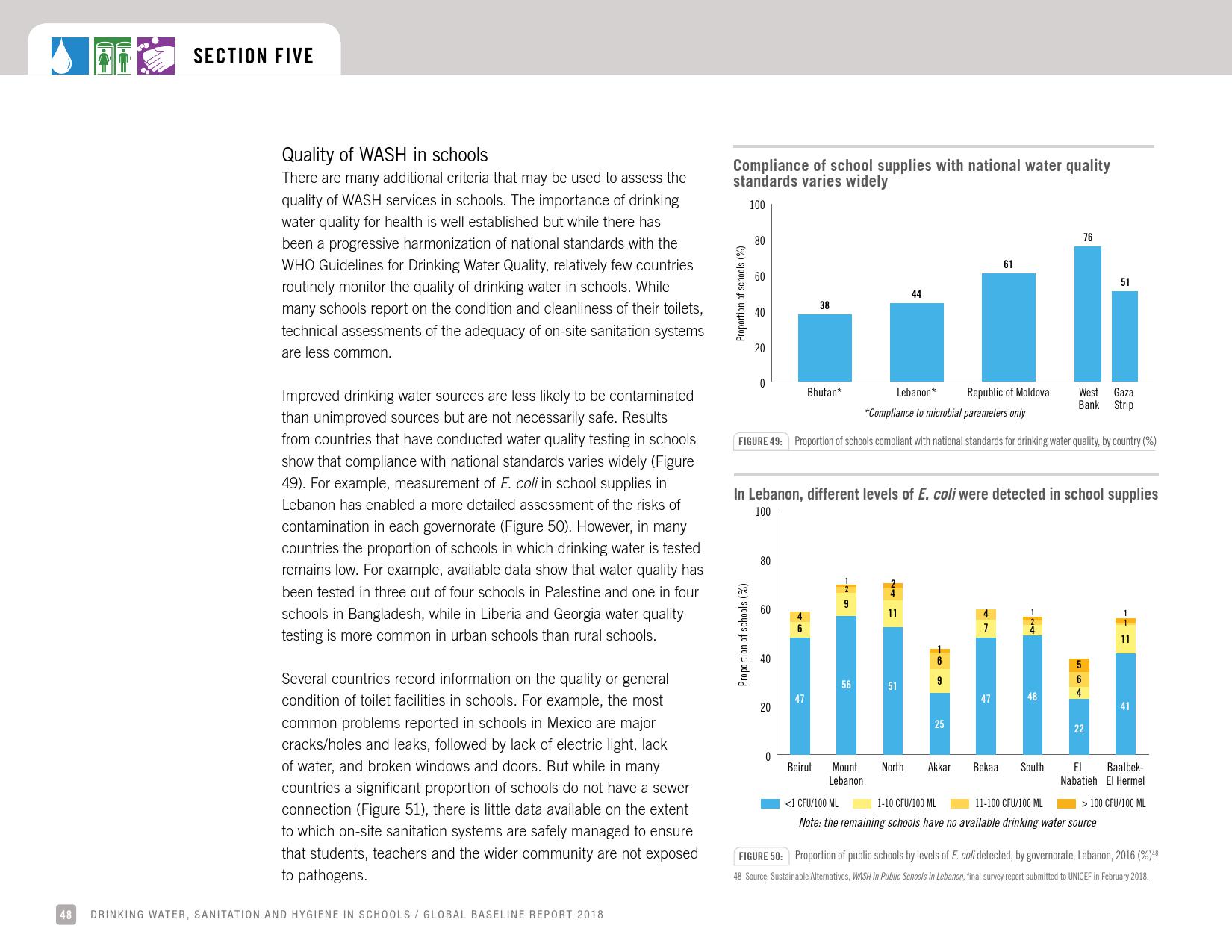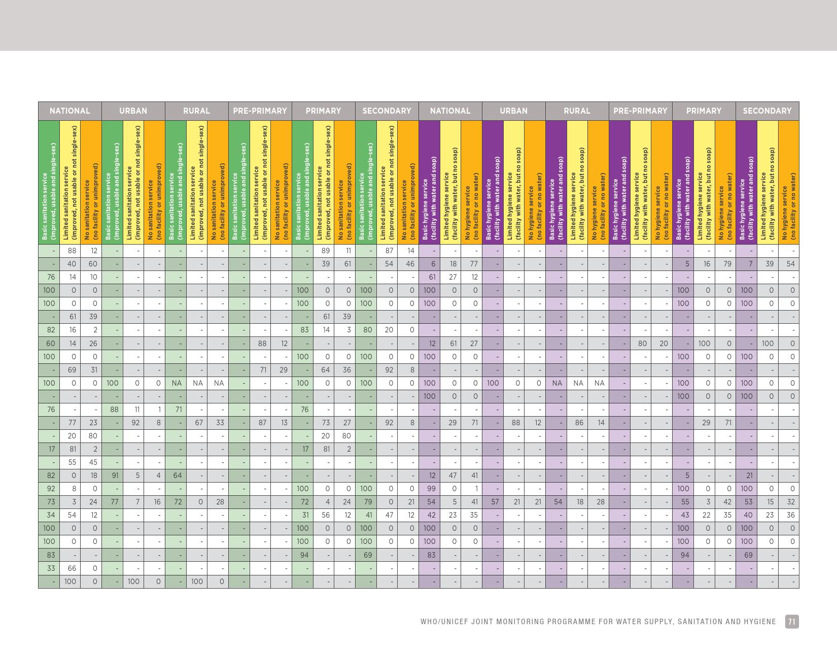 报告认为,到2030年实现学校普及基本的人人享有饮水、环卫和个人卫生服务是一个巨大的挑战。在许多国家,这不仅意味着在学校建设和更新各种卫生设施,还意味着加强教育信息管理系统,使其不仅仅记录卫生基础设施的完备性,还要考虑到为学生和工作人员提供的卫生服务的质量。2016年,就水、环境卫生和个人卫生服务方面具有基线评估的国家分别只有92个、101个和81个。此外,只有68个国家能够就学校的所有三种基本卫生服务提出全国覆盖率估计。