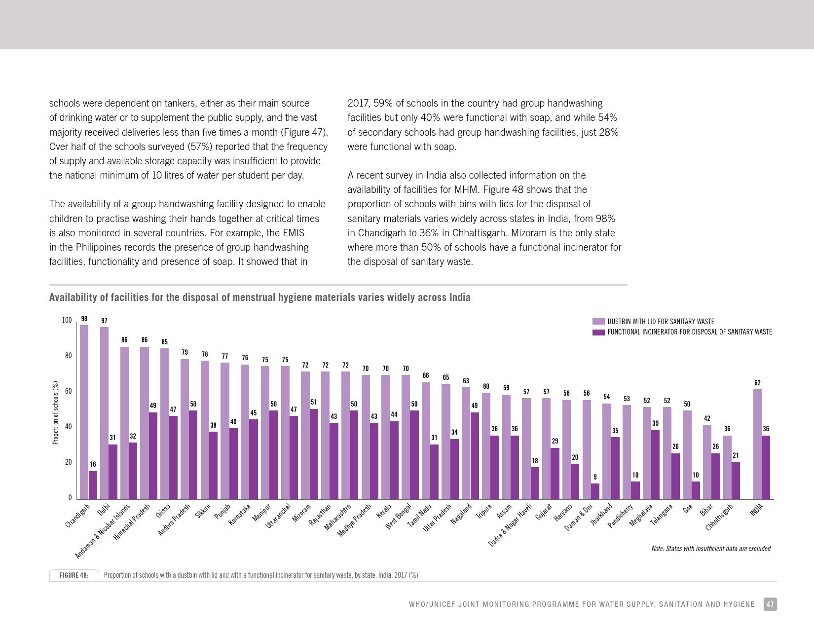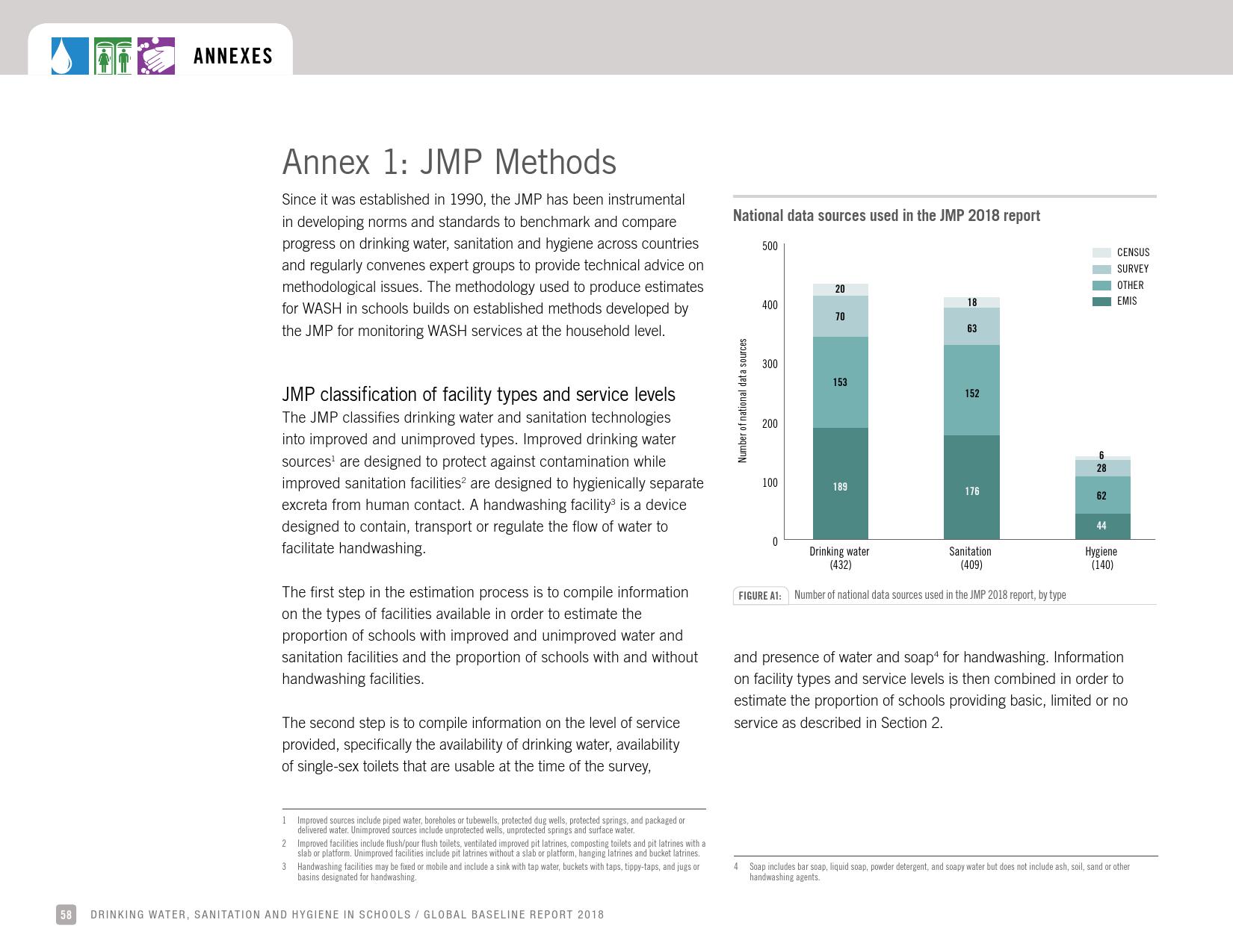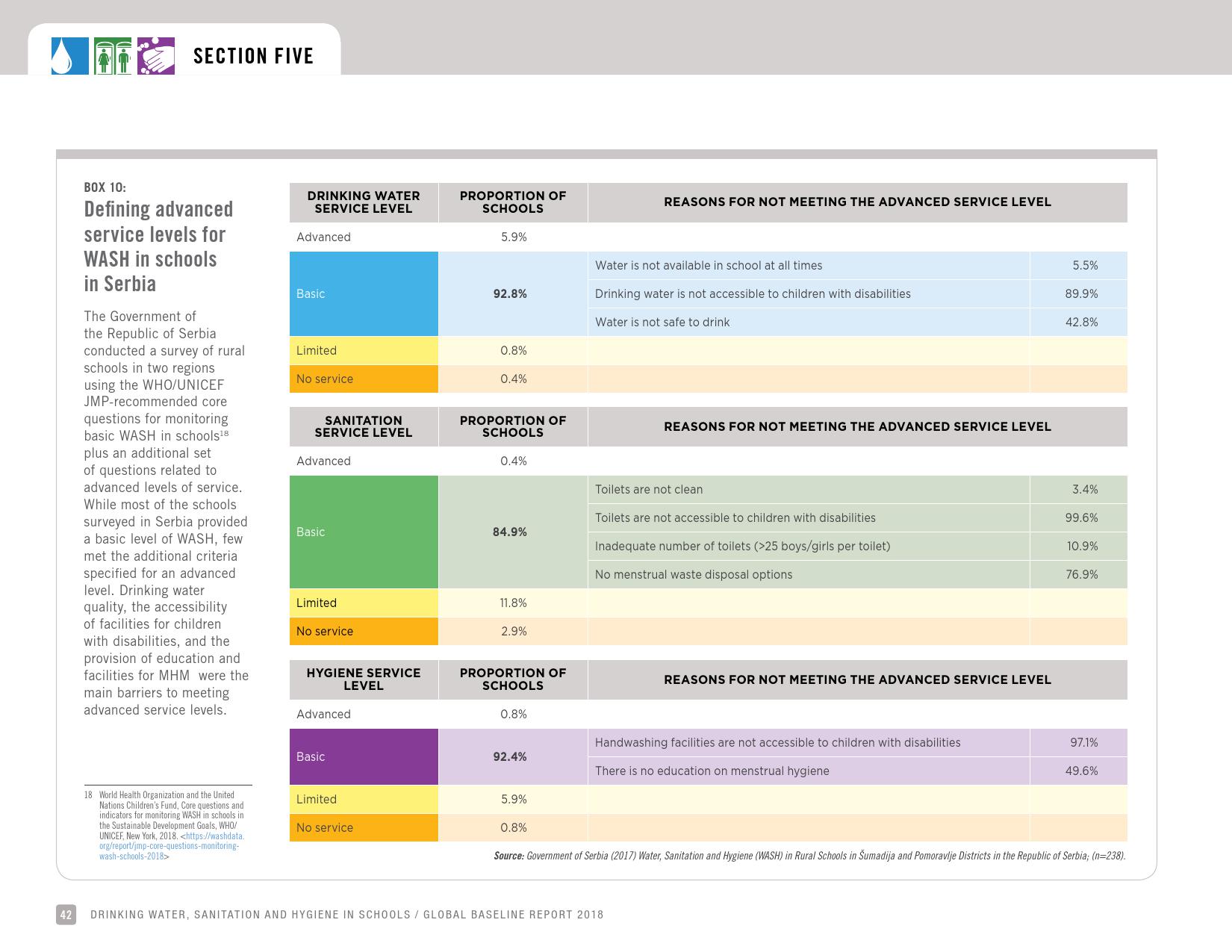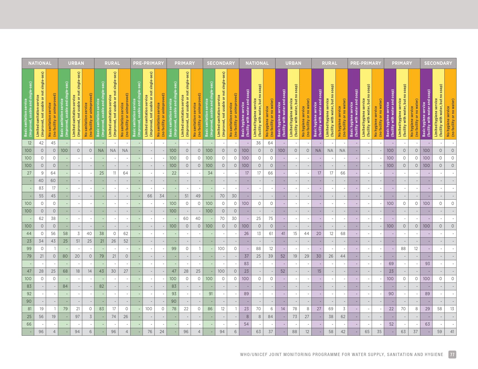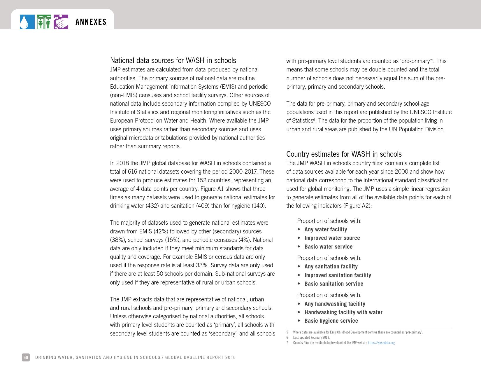 报告认为,到2030年实现学校普及基本的人人享有饮水、环卫和个人卫生服务是一个巨大的挑战。在许多国家,这不仅意味着在学校建设和更新各种卫生设施,还意味着加强教育信息管理系统,使其不仅仅记录卫生基础设施的完备性,还要考虑到为学生和工作人员提供的卫生服务的质量。2016年,就水、环境卫生和个人卫生服务方面具有基线评估的国家分别只有92个、101个和81个。此外,只有68个国家能够就学校的所有三种基本卫生服务提出全国覆盖率估计。