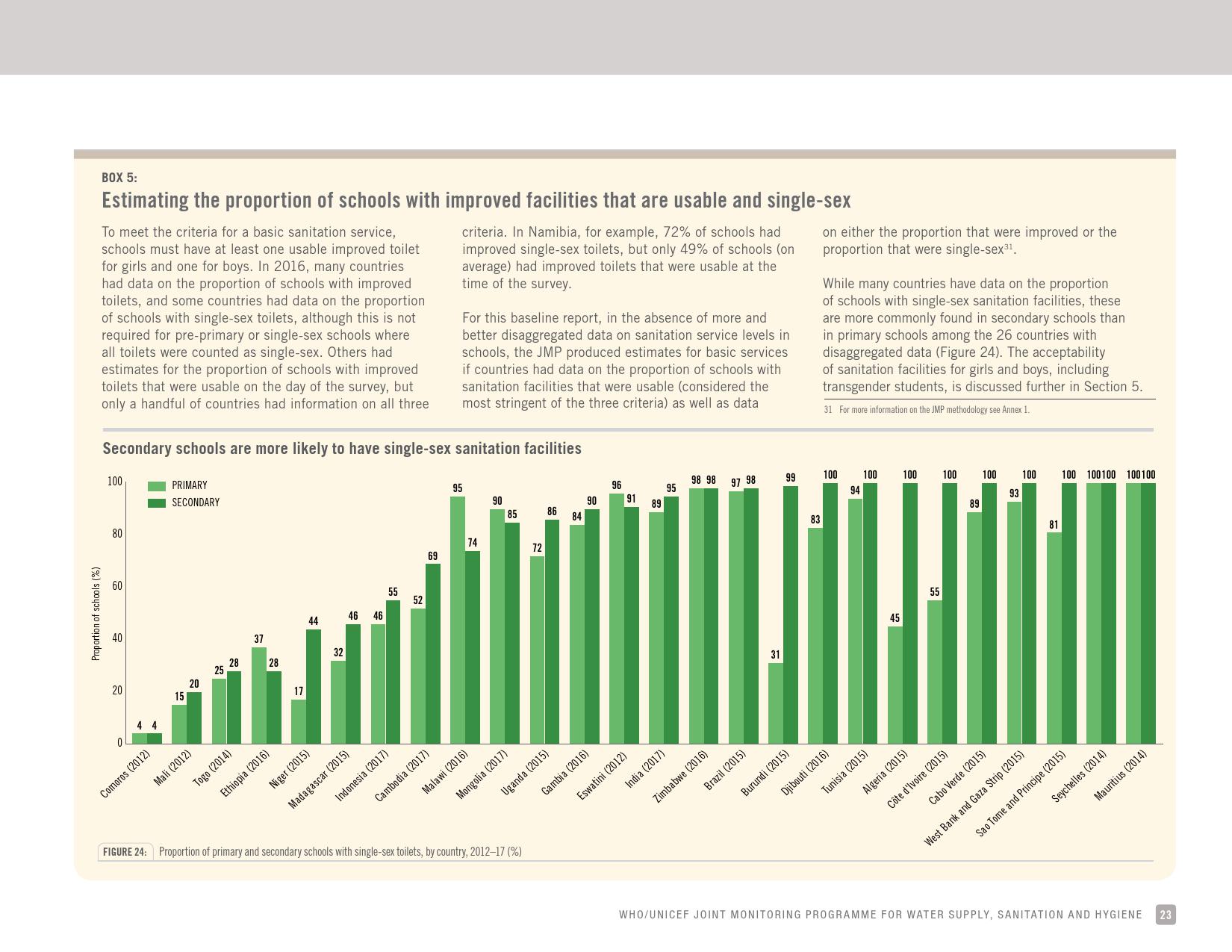报告指出,2016年,66 %的学校改善了可用的单一性别卫生设施;23 %的学校没有任何厕所卫生服务,如平板或平台的坑式厕所、悬挂式厕所或桶式厕所。
