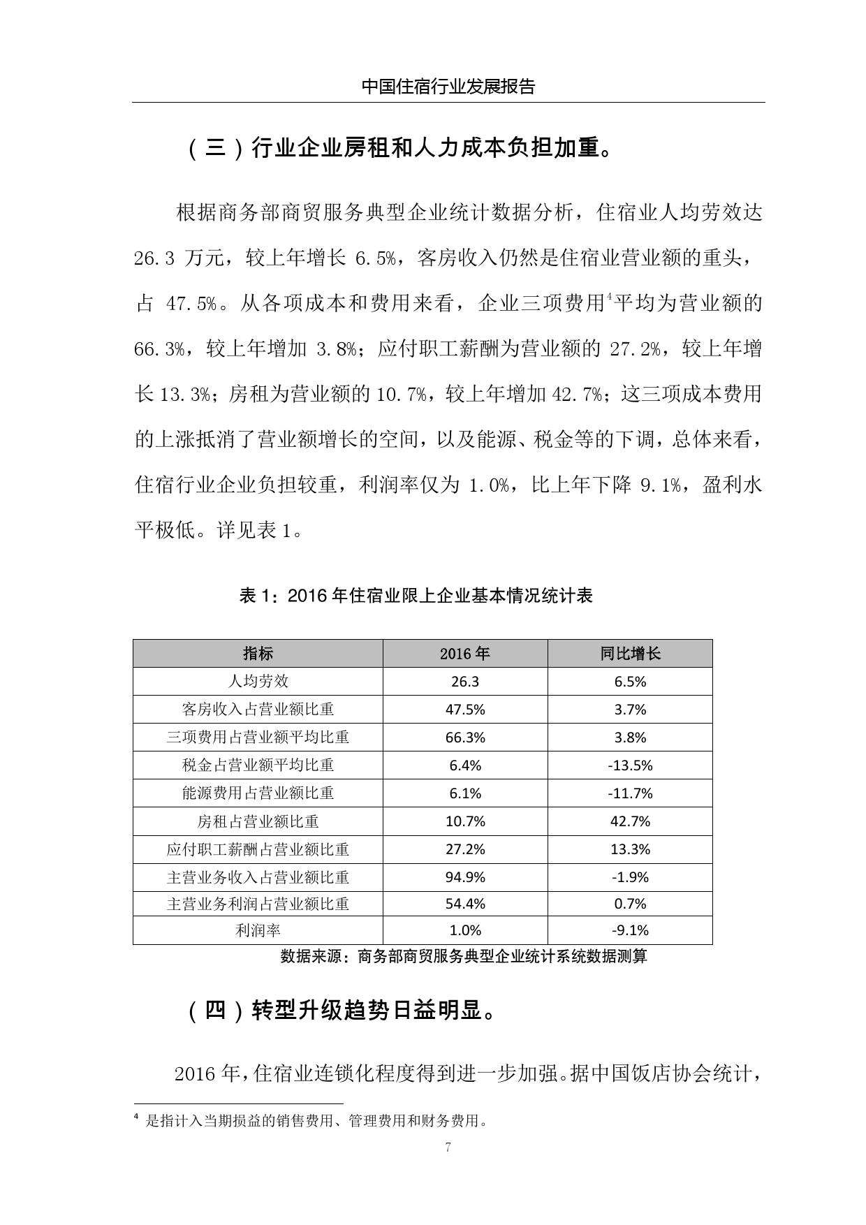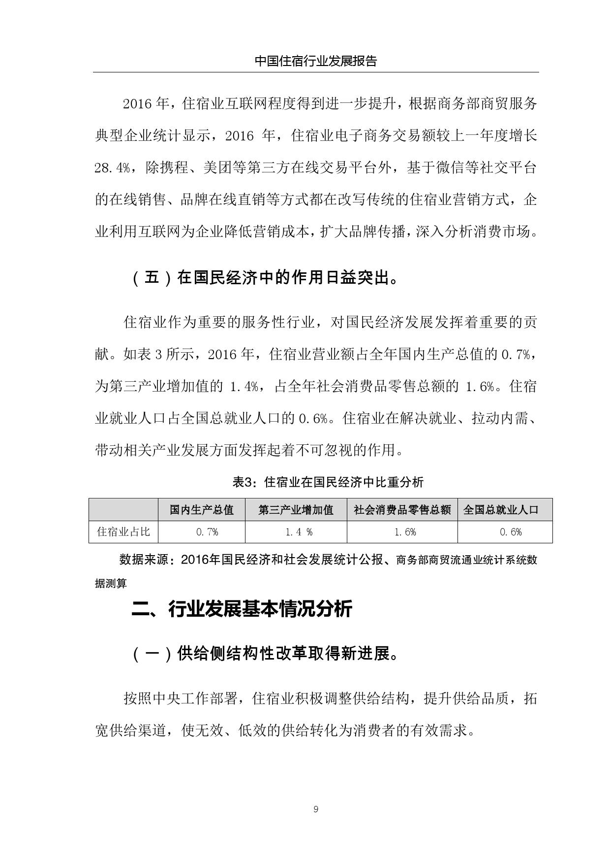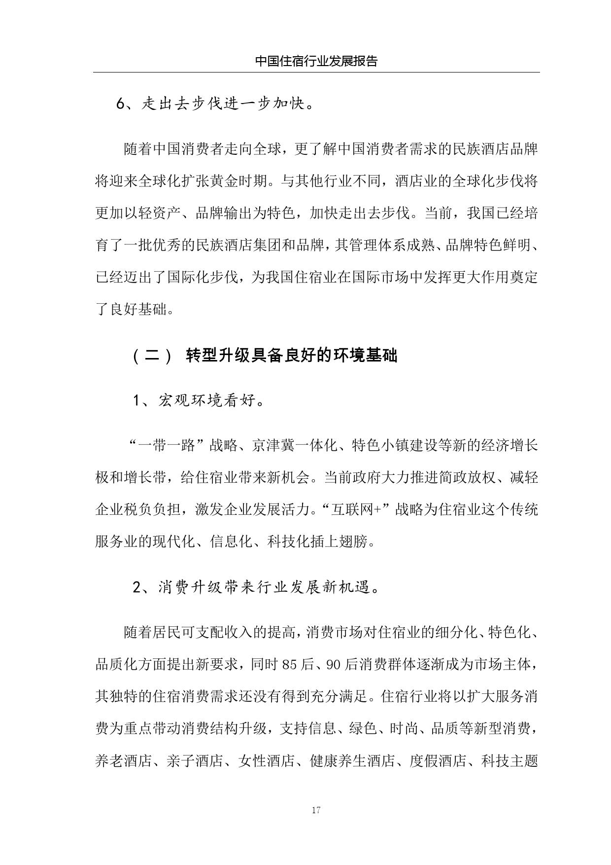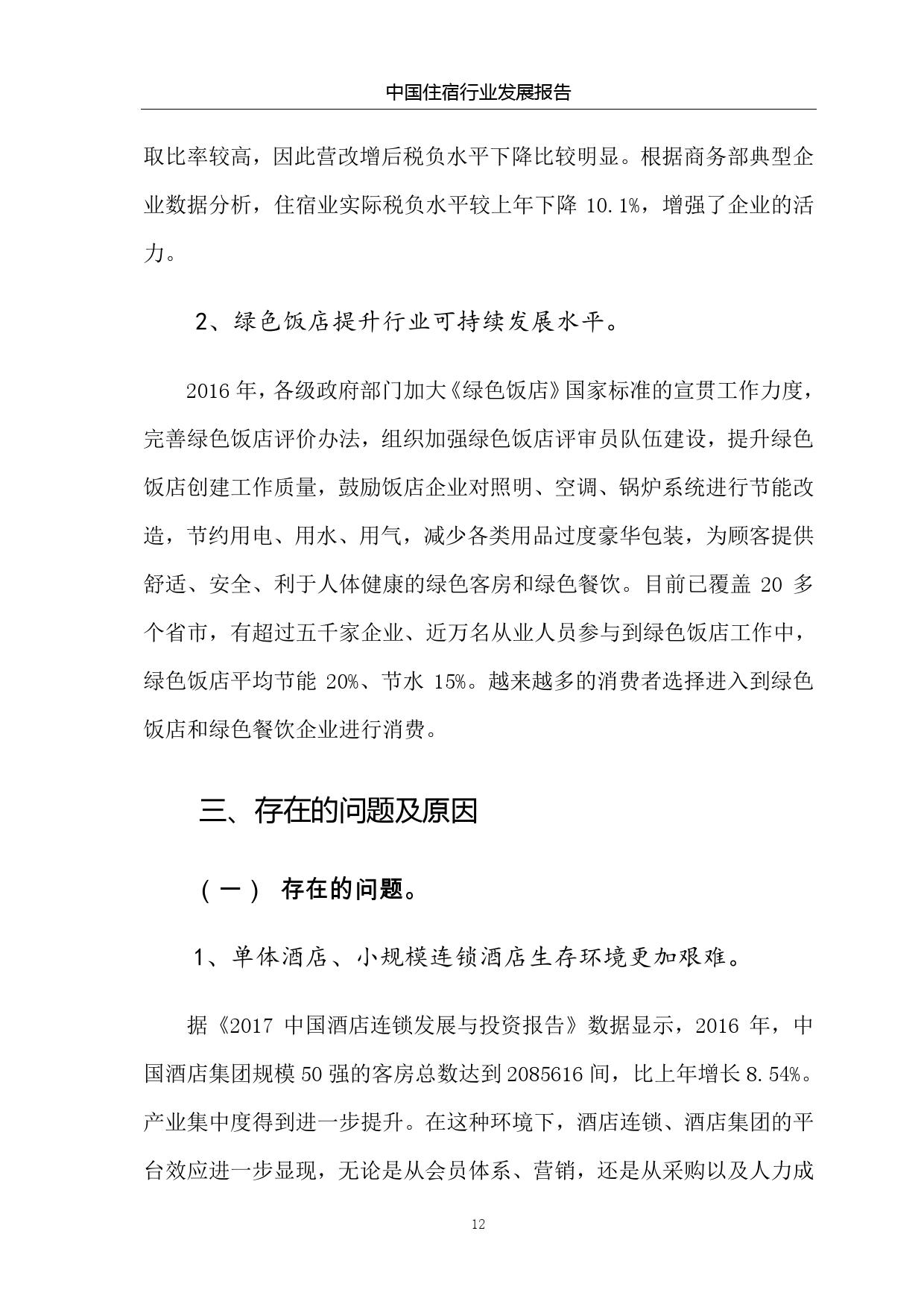 商务部:2017中国住宿行业发展报告 本报告主要依据2016年商务部商贸服务典型企业统计数据进行测算,鉴于典型企业统计方法的局限性,考虑到行业非法人经营单位、从业人员的流动性和不宜统计等因素,相关统计数据可能存在偏差。本报告由中国饭店协会起草,力求准确反映2016年住宿业发展现状、存在问题,并结合行业发展趋势,提出相关政策建议。 PDF版本将分享到199IT交流群,支持我们发展可加入! 更多阅读:CCG:2017中国留学发展报告商务部:2017年全年全国吸收外资情况商务部:2017-2018年中国百货零售业发展报告(中文版)商务部:2019中国电子商务报告(182页)商务部:2018中国电子商务报告商务部:2017-2018年中国零售行业发展报告商务部:2016-2017年中国零售行业发展报告商务部:2017年中国电视购物行业发展报告商务部:2017年Q3中国购物中心发展指数商务部:2020年1-5月我国汽车出口37.3万辆商务部:中国数字服务贸易发展报告 2018在中国,只抓一个权健是不够的国际唱片业协会:2017全球音乐报告美国电影协会:2017年电影市场报告GSMA:2017移动经济产业报告