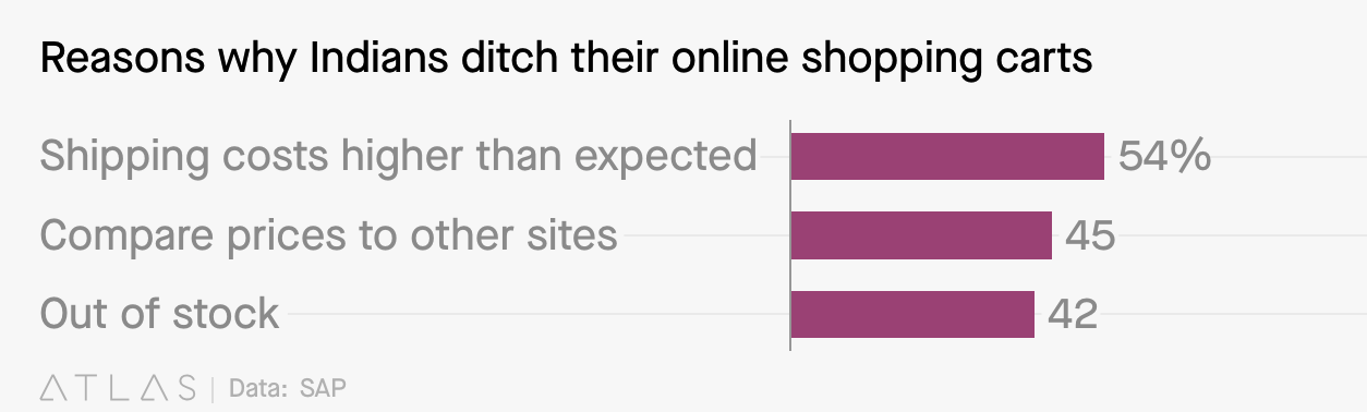 该研究由科技公司SAP完成,该公司对印度1000名线上消费者的购物习惯进行调查,发现56%的消费者在加满购物车后又会把商品一件件删除。究其原因,大部分消费者认为价格超过了预期,也有近半数人表示会在不同平台比价。而且印度消费者们也会经常延迟完成订单交易。