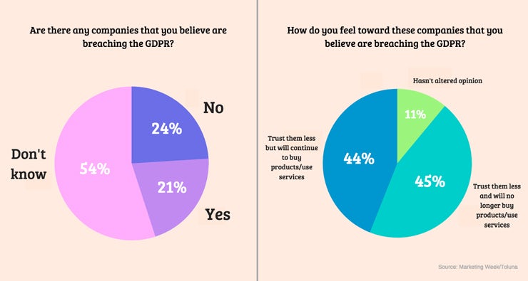 54%的受访者表示他们不确定品牌是否违反了新法规,这表明消费者仍然不完全清楚他们的权利,尽管有92%的人知道GDPR。