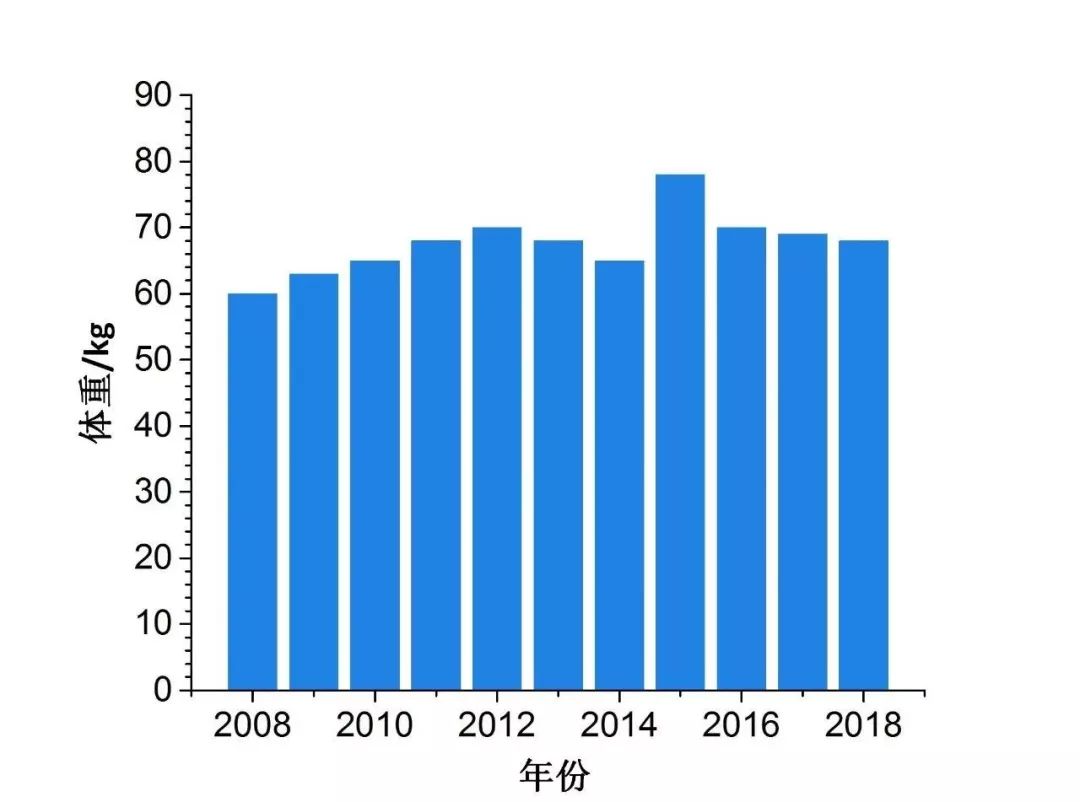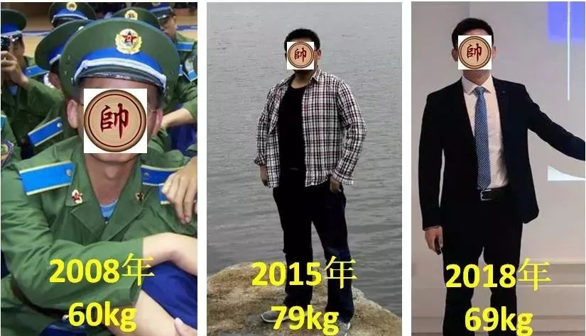 图1给出了作者大学十年间的体重变化趋势,显然,从入学开始体重即开始上涨,且一发而不可收,至2015年达到峰值(79kg)。随后,出国留学一年内体重突降至70kg左右,至今稳定在68kg。整体身材效果如图2所示: