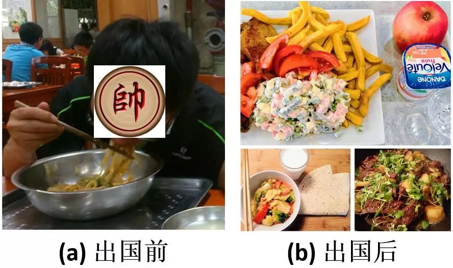 图三给出了作者出国前后的饮食结构图,可以看出,本科硕士阶段,食物摄入主要以面条为主。面条是含糖量极高的碳水化合物,长期单一地、海量地吃面导致摄入能量过剩;加之这一阶段作者运动量极小(主要以走路为主),故而体重持续增加。博士阶段,身在国外无面可吃,午饭以学校供应西餐为主,晚饭以自己烹饪的各式家常炒菜为主,糖类摄入量大量减少,加之这一阶段经常参加篮球运动,故体重迅速降低。