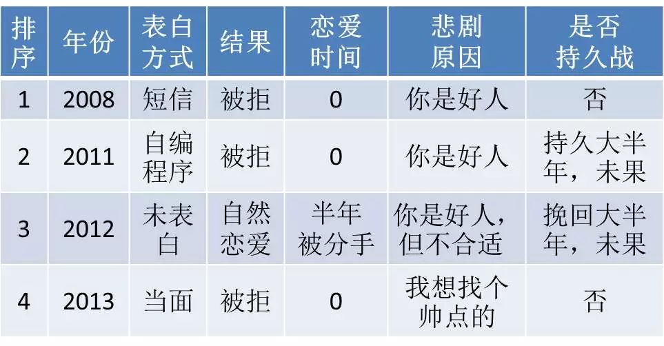 作者的表白即恋爱经历全部集中在本科及硕士阶段,具体情况在表1中给出: