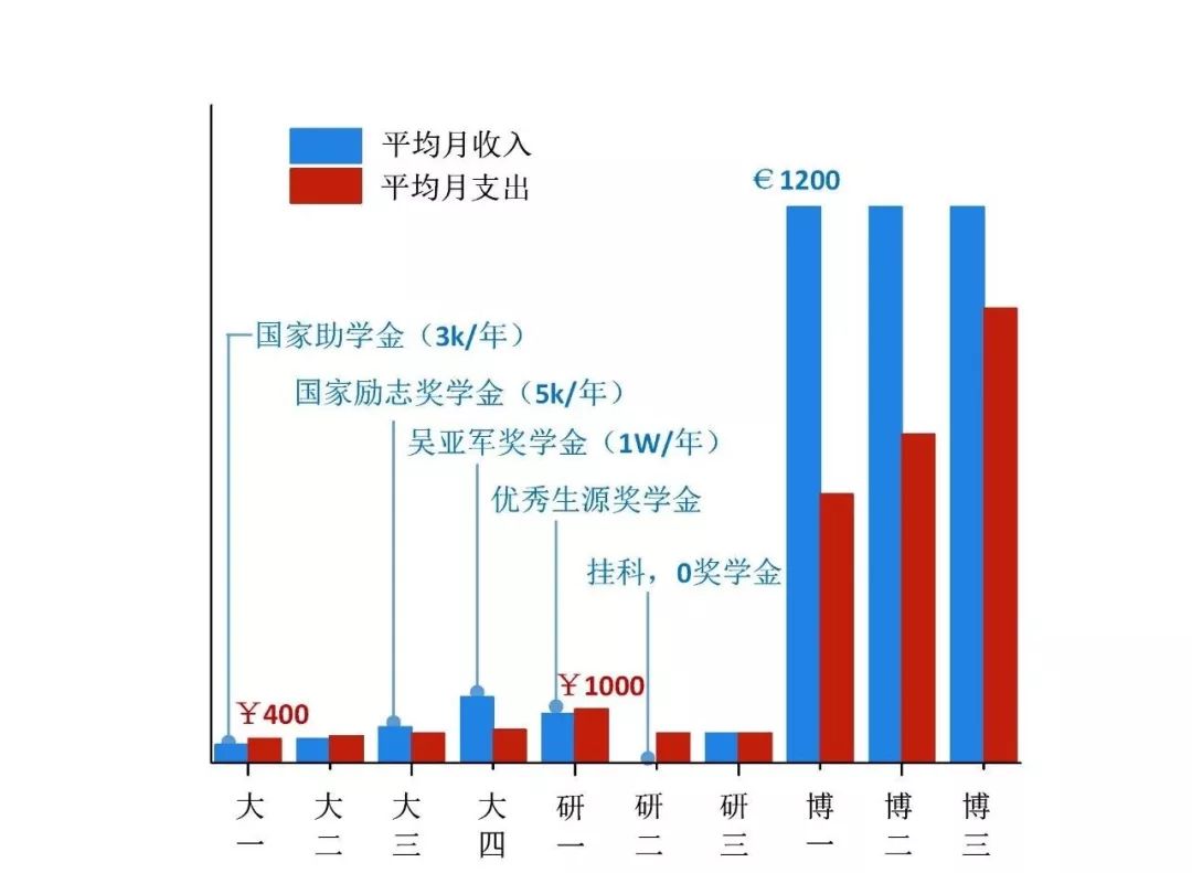 从收支情况对学业的影响上来看,本科较为简单,上好课考好试即可,与个人经济状况关系不是很大。研究生阶段各方压力聚集,然而科研最需要心无旁骛,个人经济状况对科研事业影响较大,所以出现了硕士阶段一事无成、博士阶段科研尚可的结果。