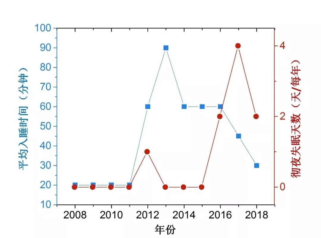 显然,作者睡前活动的变化真实地反映了智能手机领域突飞猛进的发展,并最终达到了一种无招胜有招的睡前状态。从实践经验来看,睡前看书,越看越瞌睡;睡前看手机,越看越清醒;睡前什么都不看,则思绪万里,睡得着睡不着,就随机了。图6给出了大学十年间的失眠状况统计,失眠原因则在图7中给出。