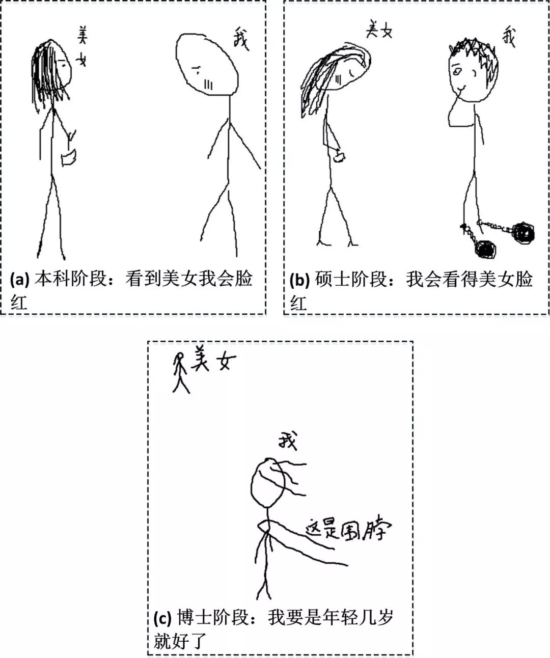 本科、硕士、博士阶段见到美女的反应总结如图8所示: