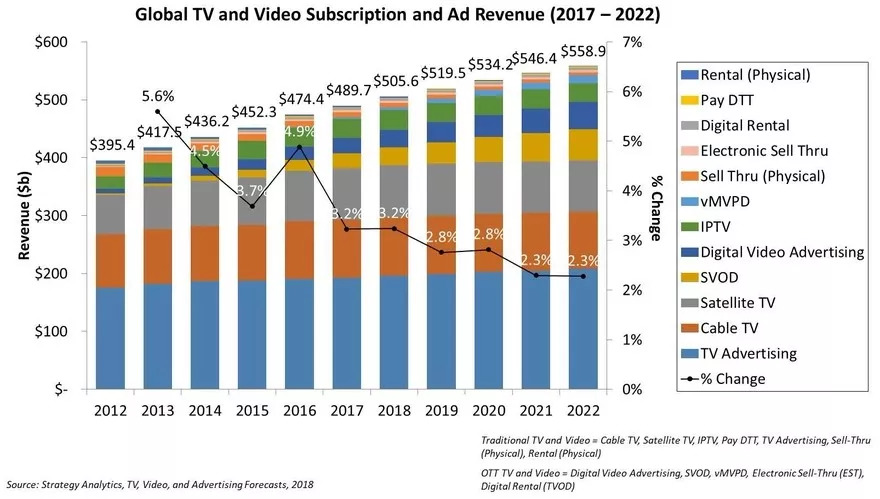 Strategy Analytics电视与媒体战略报告显示,未来几年,全球电视视频订阅和广告营收将持续增长,OTT将在其中扮演重要的角色。