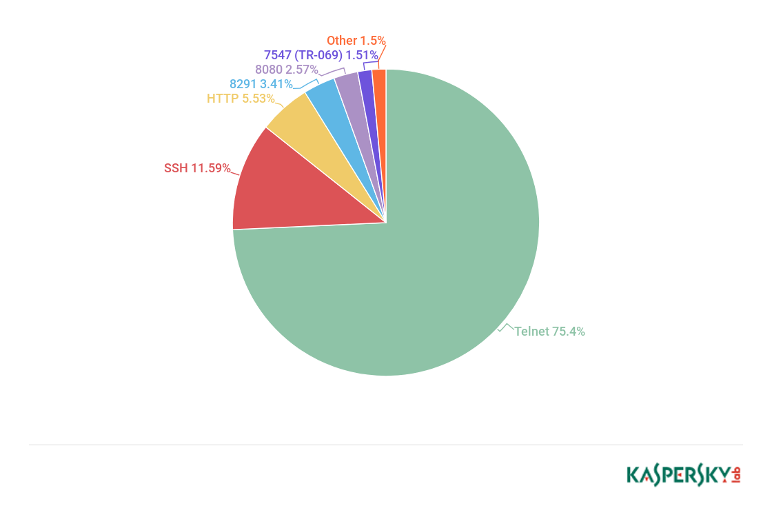 暴力破解Telnet密码是最常见的物联网恶意软件自我传播方法。但是,最近针对其他服务的攻击数量有所增长,例如通过端口8291和端口7547发起对物联网设备的攻击。