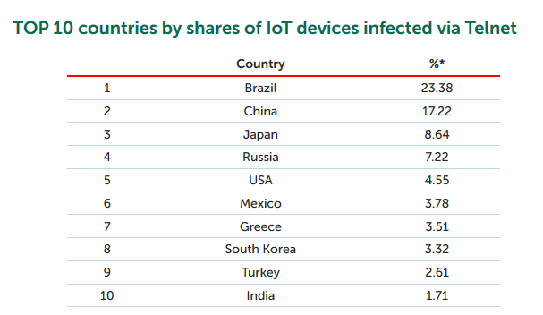 在第二季度,巴西(23.38%)在受感染物联网设备数量方面处于领先地位,因此在Telnet攻击数量方面也处于领先地位。其次是中国(17.22%),有小幅上涨;第三名是日本(8.64%)。