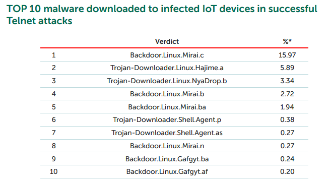 在这些攻击中最常见的是Backdoor.Linux.Mirai.c(15.97%)。