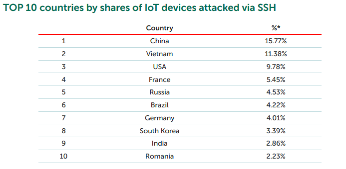此类攻击的启动类似于Telnet攻击,唯一的区别是它们需要机器人在其上安装SSH客户端以暴力破解凭证。SSH协议受密码保护,因此强制破解密码需要大量计算资源。因此,来自物联网设备的自我传播效率低下。SSH攻击的成功取决于设备所有者或制造商的故障。换句话说,这些又是制造商分配给整个设备系列的弱密码或预设密码导致的。中国是最容易通过SSH攻击受感染的国家。