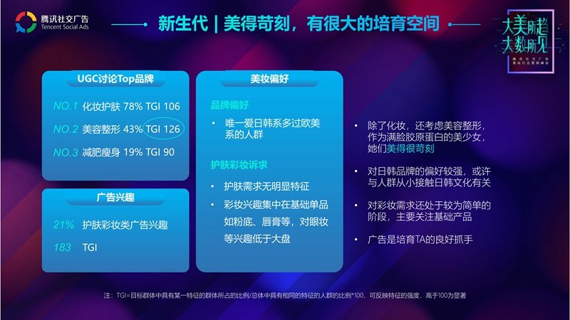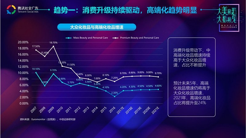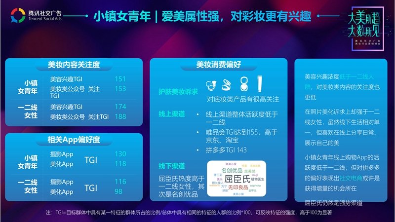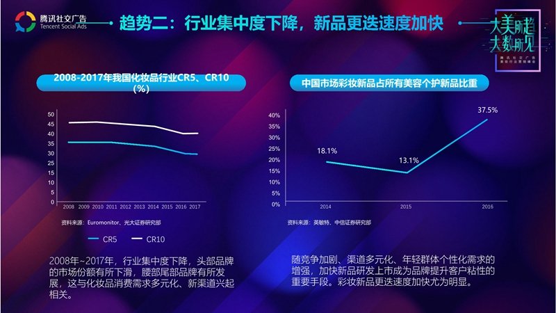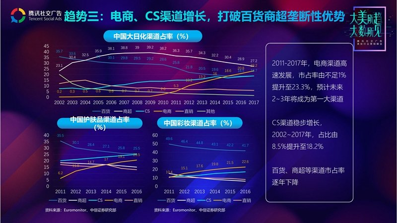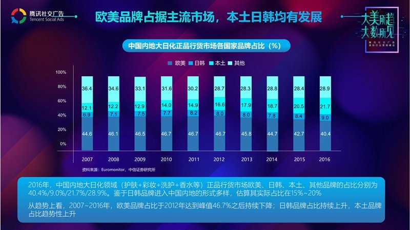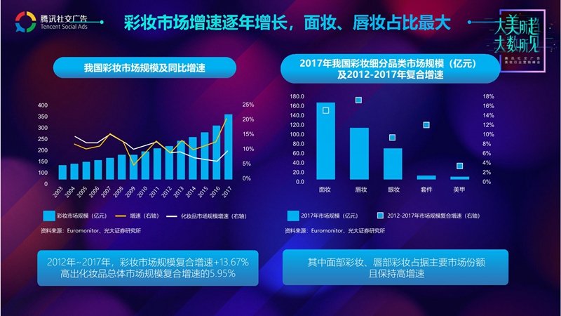 腾讯社交广告:美妆行业数据洞察报告 8月30日,2018“大美所趋 大数所见”腾讯社交广告美妆行业营销峰会在上海举行。会上,腾讯发布了“腾讯社交广告美妆行业趋势解读”,从美妆行业发展概览、美妆行业主要趋势、美妆品类社交洞察、寻找新的消费人群4个板块解读最新趋势。 彩妆市场哪个细分品类增长最快?欧美日韩的进口品各自有哪些独特竞争优势?电商、CS渠道的市场占比增长了多少?当下消费者对化妆品有哪些最新诉求?腾讯用大数据给你答案。以下为报告全文: 赞( 更多阅读:有赞&C2CC:2020美妆行业发展趋势洞察报告腾讯社交广告:2016-2017旅游行业出境游市场研究报告很快:2016年海淘新规微信公众号数据洞察报告TalkingData:2015年Q2 Apple Watch数据洞察报告社交+程序化:腾讯社交广告在程序化交易市场的布局与探索2018微信广告美妆行业产品解决方案世界各城市60平米房屋成本Nature:携带相同基因组的癌细胞或许会表现出不同的行为!自如研究院:2021年10城毕业生租房报告国际顶刊《PNAS》:爱发朋友圈的人,更容易长寿SNE Research:2024年宁德时代动力电池装车量339.3GWh居全球首位今日数据行业日报(2021.03.09)『城镇就业女性平均薪酬是男性的75.9%』Demand Gen :2019年B2B买家报告OPPO营销平台打造“新奇青年”,垂直受众进行年轻化营销中汽协会:2021年1-4月汽车商品前十国出口金额排名