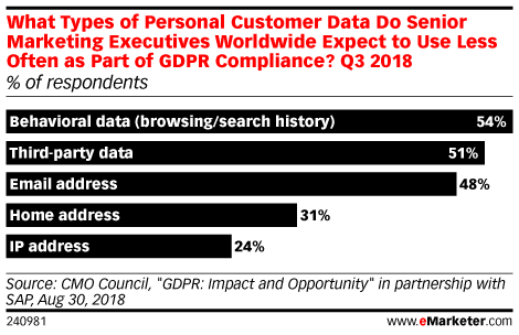 有一些数据更容易受到欧盟通用数据保护法规(GDPR)的影响。CMO Council和SAP在2018年第三季度调查了全球227位高级营销主管,54%的受访者预计如果他们想要保持合规,将无法再使用网页浏览和搜索历史等行为数据。大约一半的受访者表示第三方数据和电子邮件地址在GDPR下可能无法安全使用。