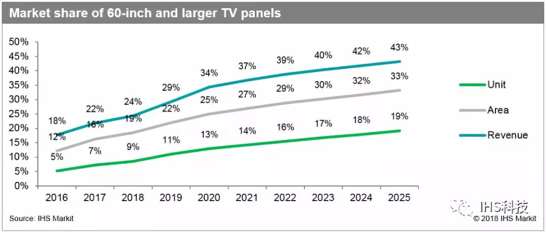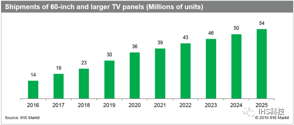 包括液晶显示器(LCD)和有机发光二极管(OLED)在内的60英寸及更大尺寸电视面板年度发货量预计在2018年将超过2000万片,2025年达到5400万片,占整个电视面板需求的19%。从2016年到2025年期间,从出货面积来看其总份额预计大约会增长三倍,达到33%。