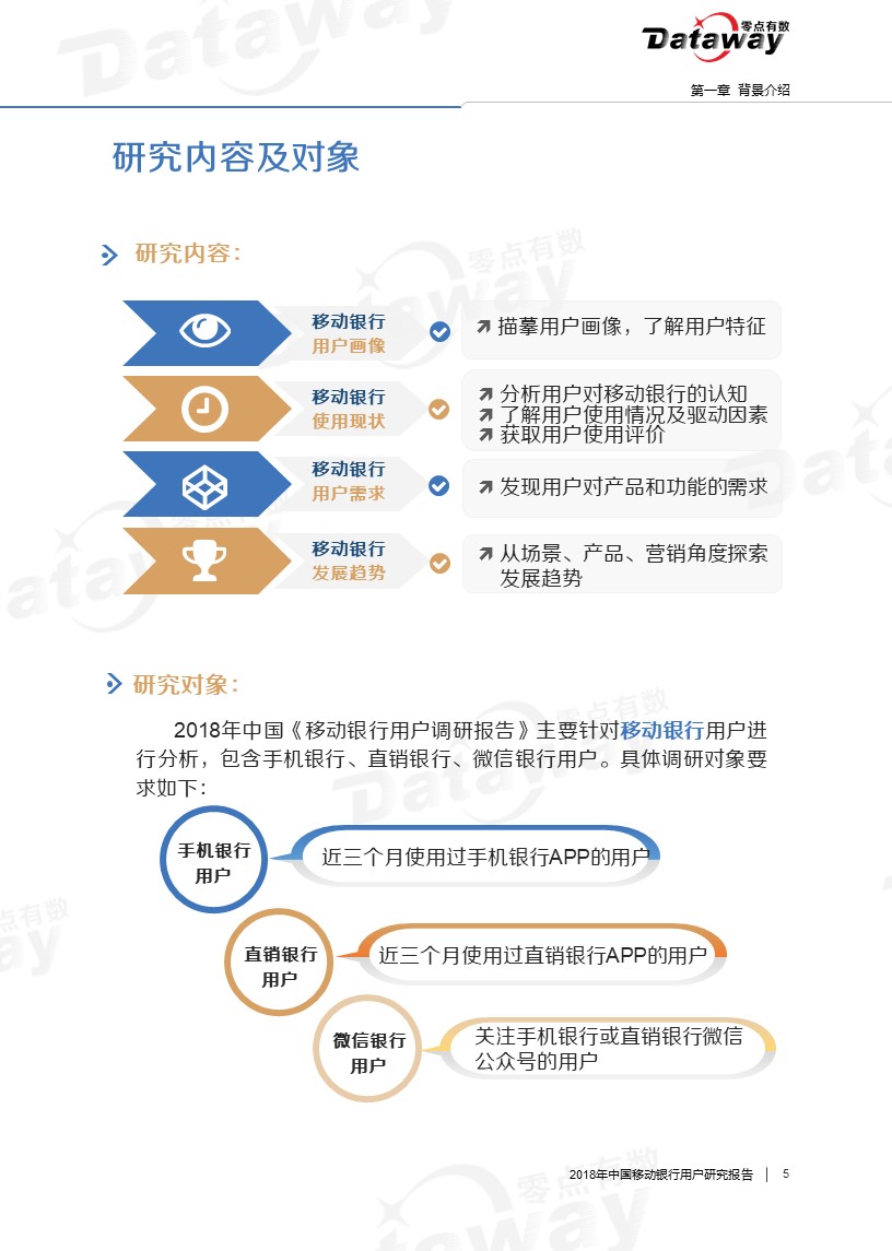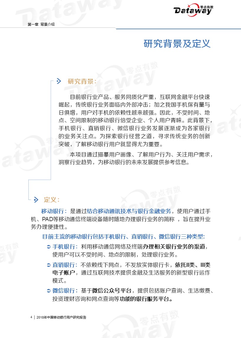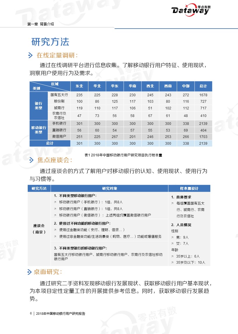 本次调研中,我们将移动银行用户(即使用手机银行、直销银行、微信银行的群体)作为主要关注对象,运用在线定量调研、焦点座谈会和桌面研究三种研究方法,来了解移动银行用户的特征、使用行为、使用需求等。