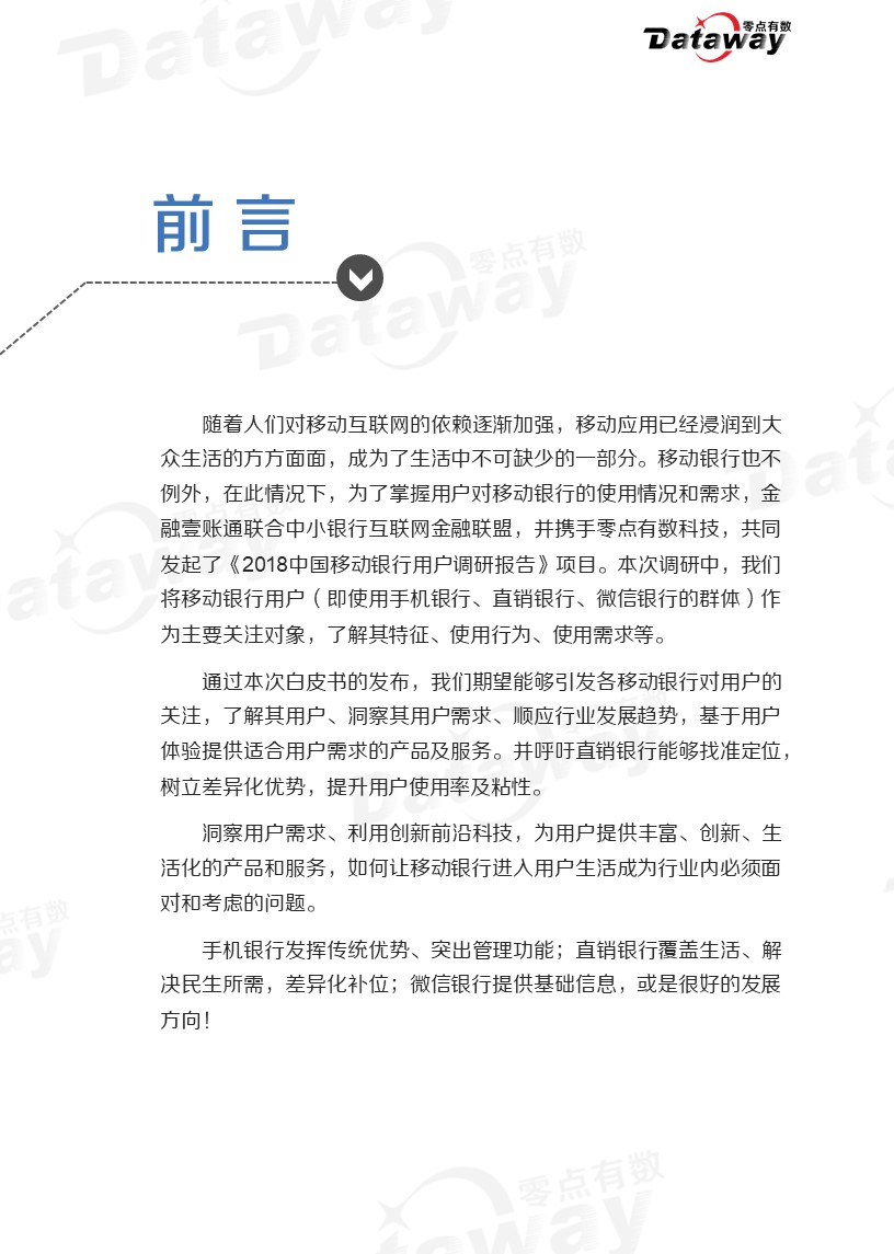 在此情况下,为了掌握用户对移动银行的使用情况和需求,金融壹账通联合中小银行互联网金融联盟,并携手零点有数科技,共同发起了《2018中国移动银行用户调研报告》项目。
