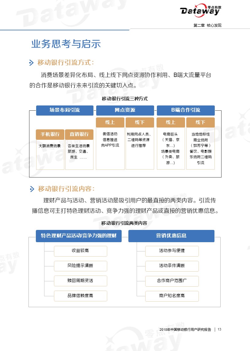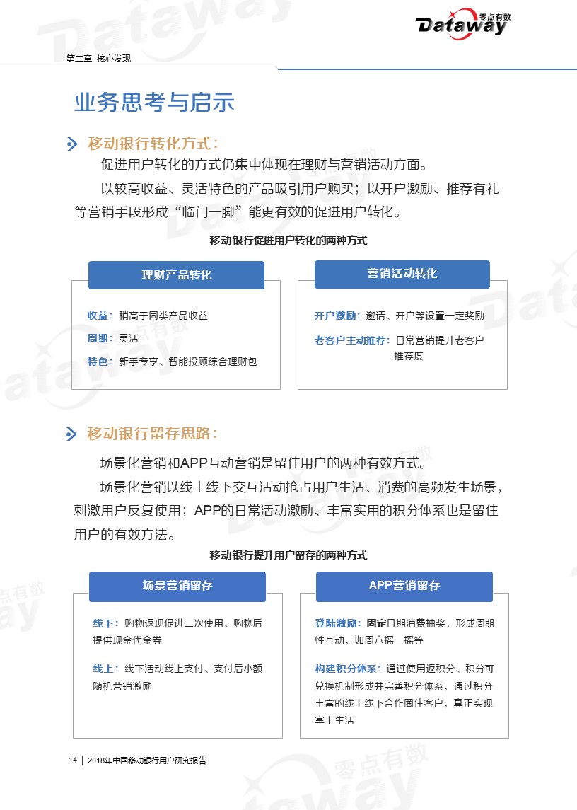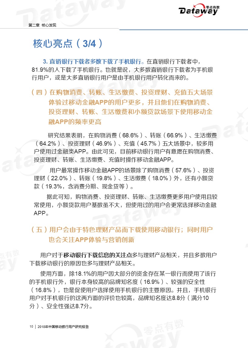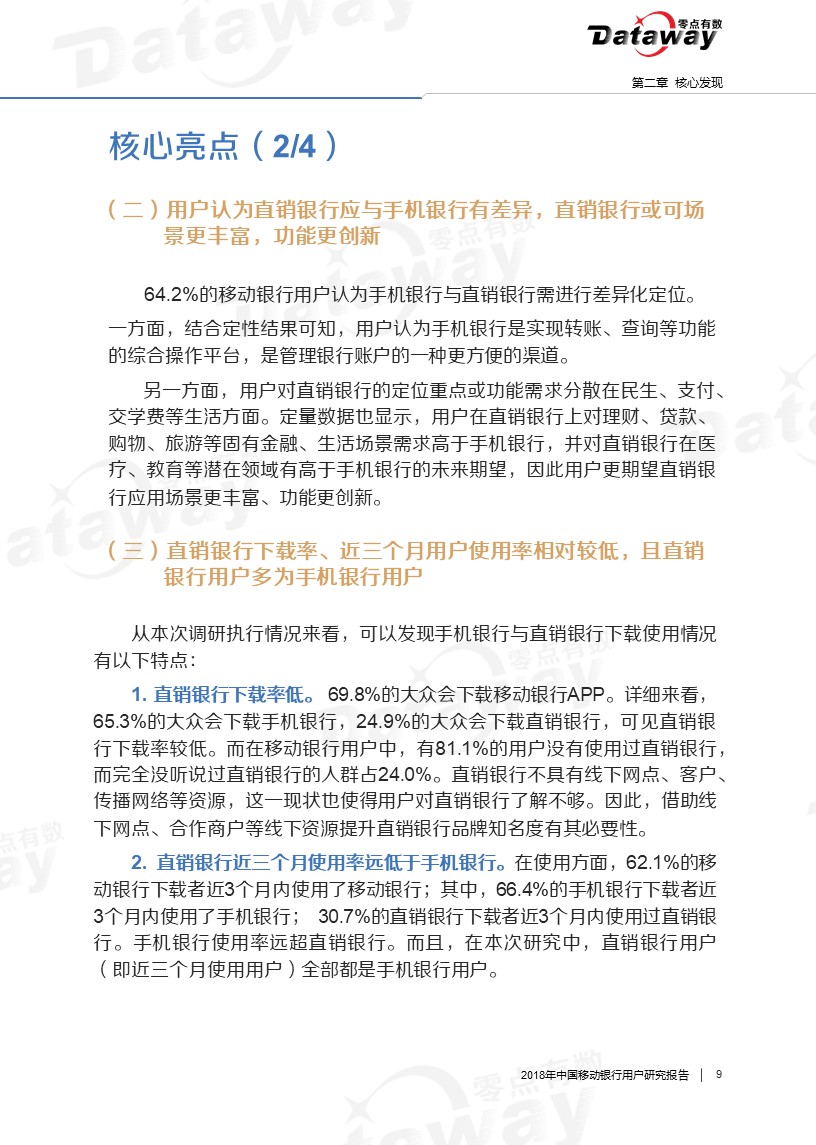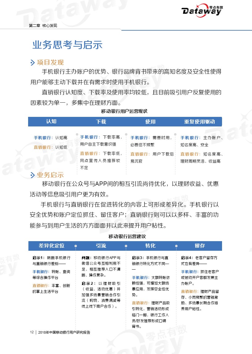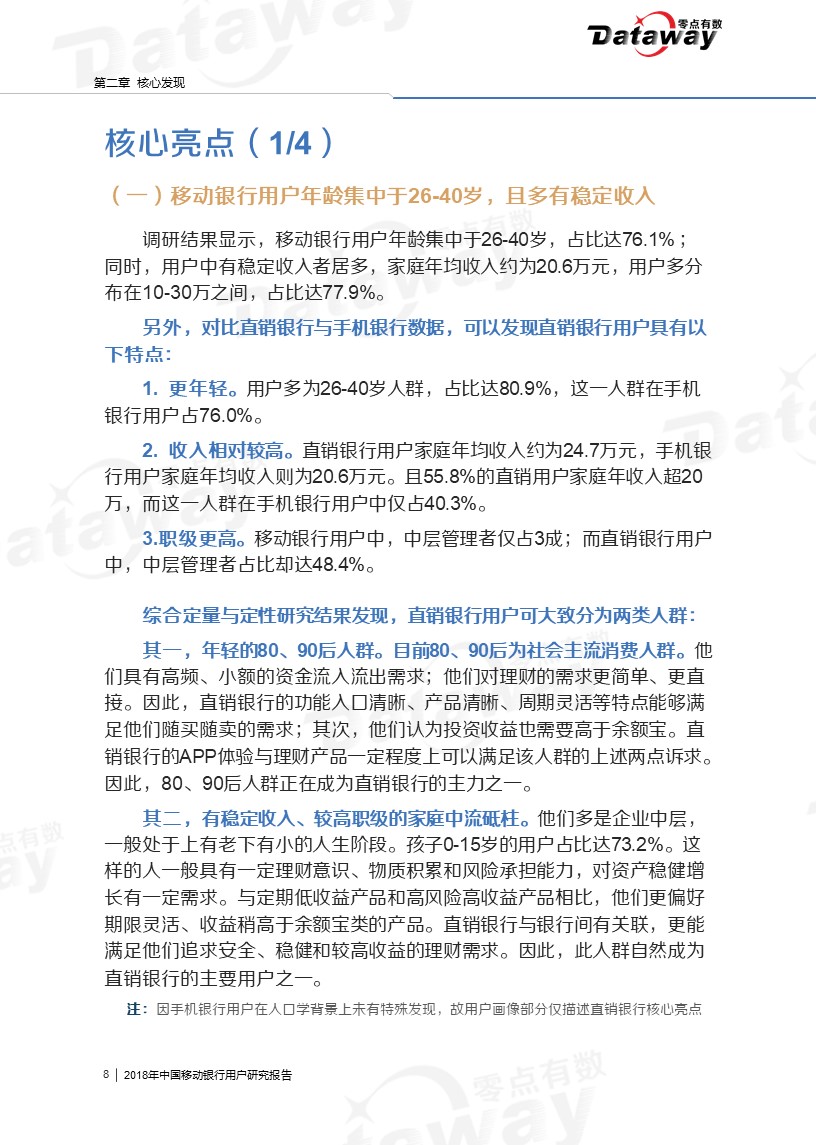 通过调研,我们发现六大核心亮点:移动银行用户年龄集中于26-40岁,且多有稳定收入;直销银行下载率、近三个月用户使用率相对较低;用户会由于特色理财产品而下载使用移动银行等等。这些发现给移动银行的留存提供了思路,为移动银行产业的发展带来了更多的启发。