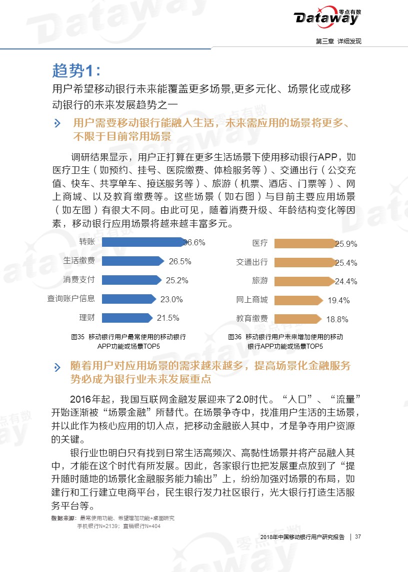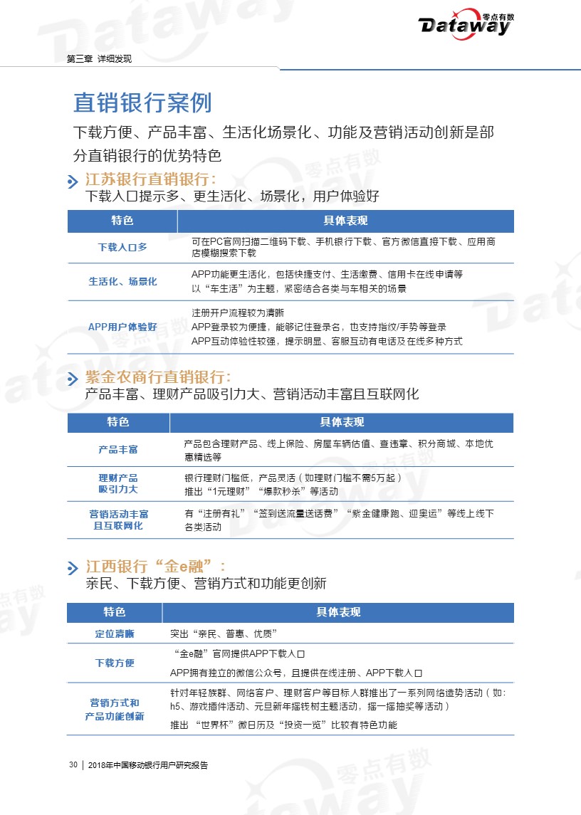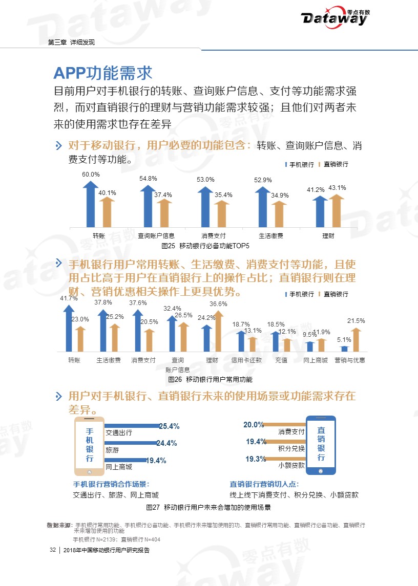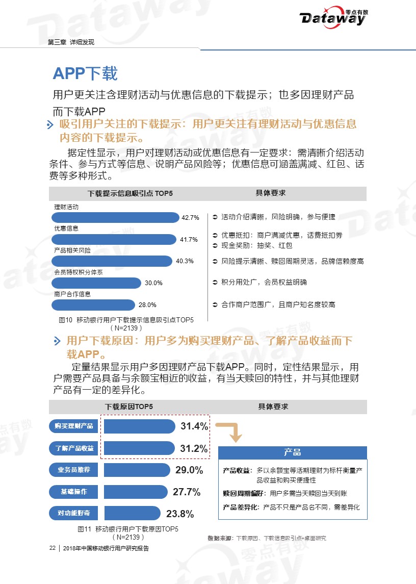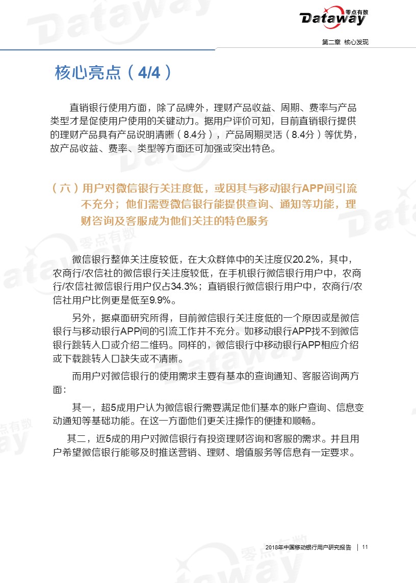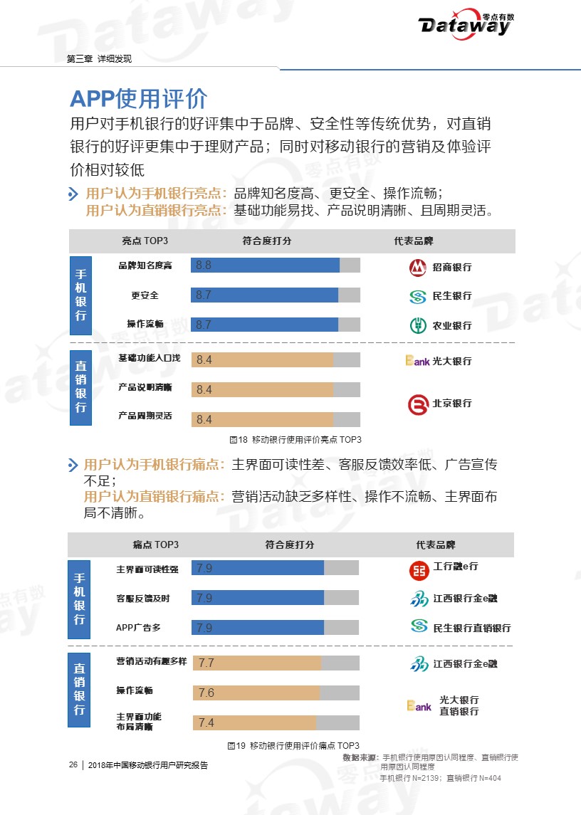 通过调研,我们发现六大核心亮点:移动银行用户年龄集中于26-40岁,且多有稳定收入;直销银行下载率、近三个月用户使用率相对较低;用户会由于特色理财产品而下载使用移动银行等等。这些发现给移动银行的留存提供了思路,为移动银行产业的发展带来了更多的启发。