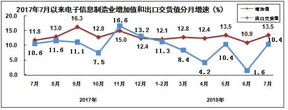 1-7月,规模以上电子信息制造业增加值同比增长12.6%,快于全部规模以上工业增速6个百分点,其中7月份增长13.5%。
