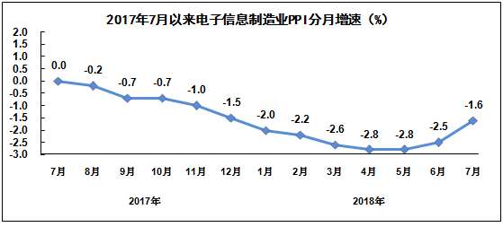 1-7月,电子信息制造业生产者出厂价格同比下降2.4%。7月份,电子信息制造业生产者出厂价格同比下降1.6%,延续去年三季度以来的下降趋势。