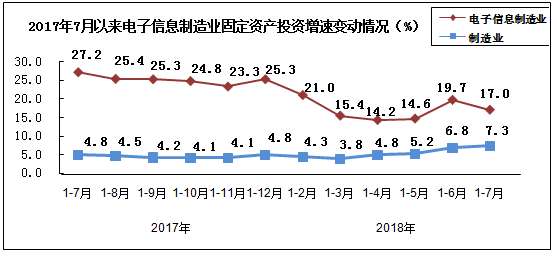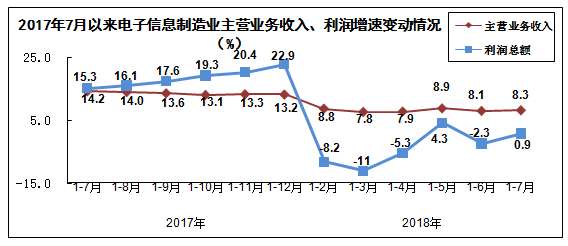 2018年前7个月,电子信息制造业继续保持平稳增长态势,生产增速在工业各行业中保持领先水平,投资增速保持较高水平,受成本压力上升等因素影响,利润增长低于主营业务收入增长,电子产品出厂价格下降。