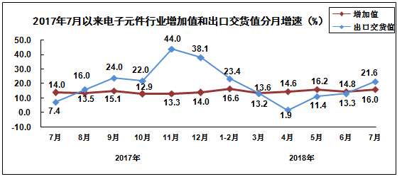 1-7月,电子元件及电子专用材料制造业增加值同比增长15.5%。出口交货值同比增长11.8%。主要产品中,电子元件产量同比增长21%。