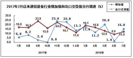 1-7月,通信设备制造业增加值同比增长13.2%,出口交货值同比增长11%。主要产品中,手机产量同比增长2%;其中智能手机产量同比增长2.8%。