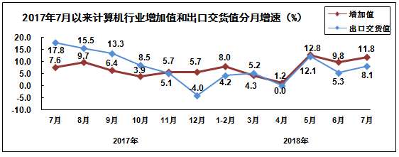 1-7月,计算机制造业实现主营业务收入同比增长8.2%,实现利润同比增长20.5%,分行业中计算机外围设备制造业利润增长50.4%。