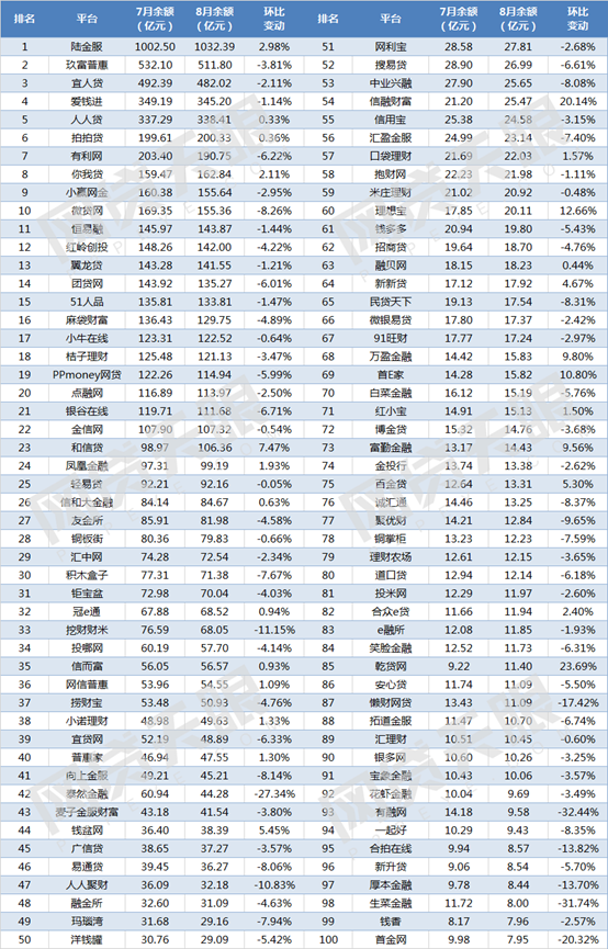 近期,行业发展压力过大,平台生存遇瓶颈,即使客户群体相对较稳定的头部平台也难以幸免,贷款余额与上月相比也出现了一定程度下降。通过整理,8月贷款余额排名前100家平台规模合计达7464.23亿元,占比全国69.82%。较上月环比下降1.84%。