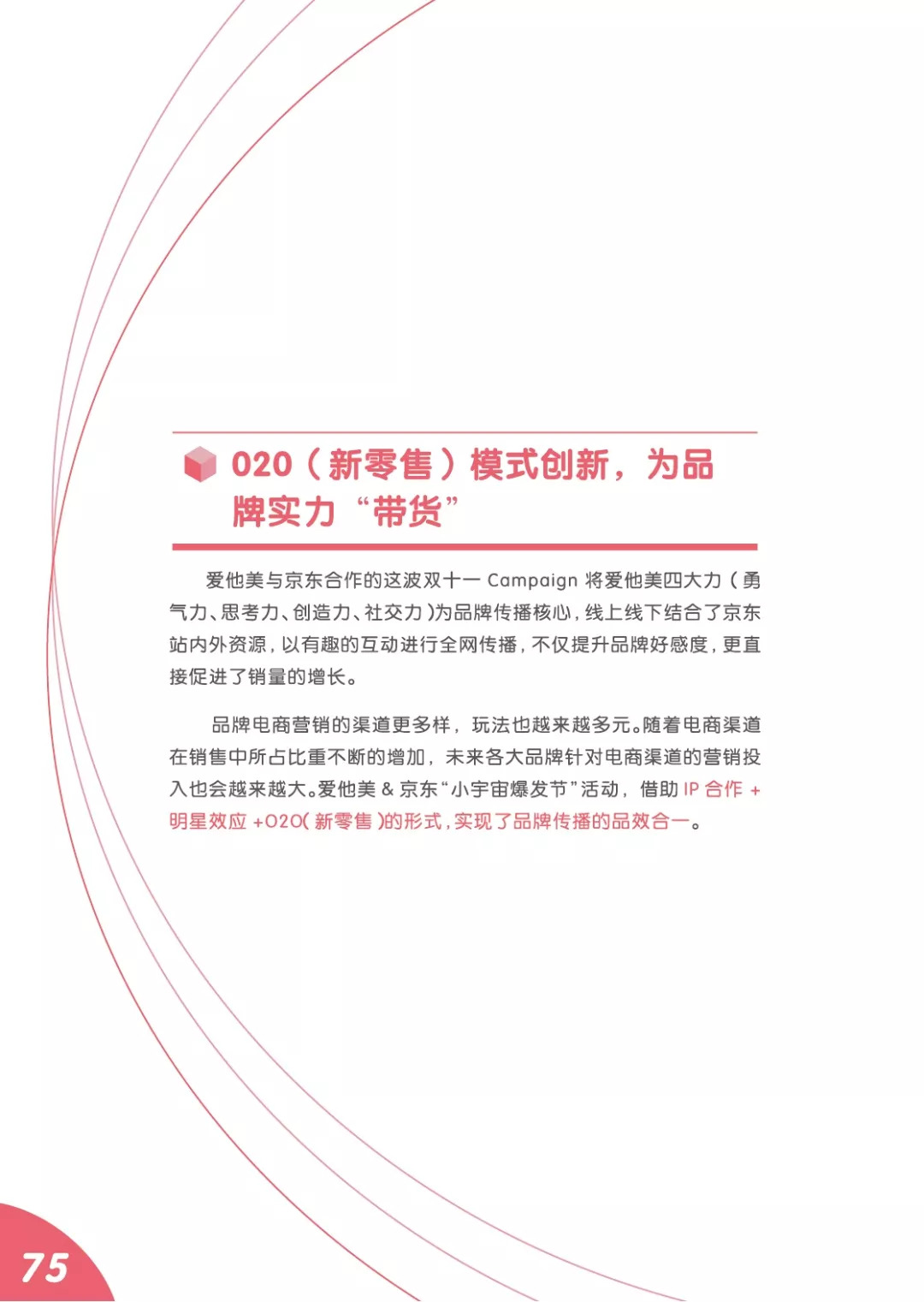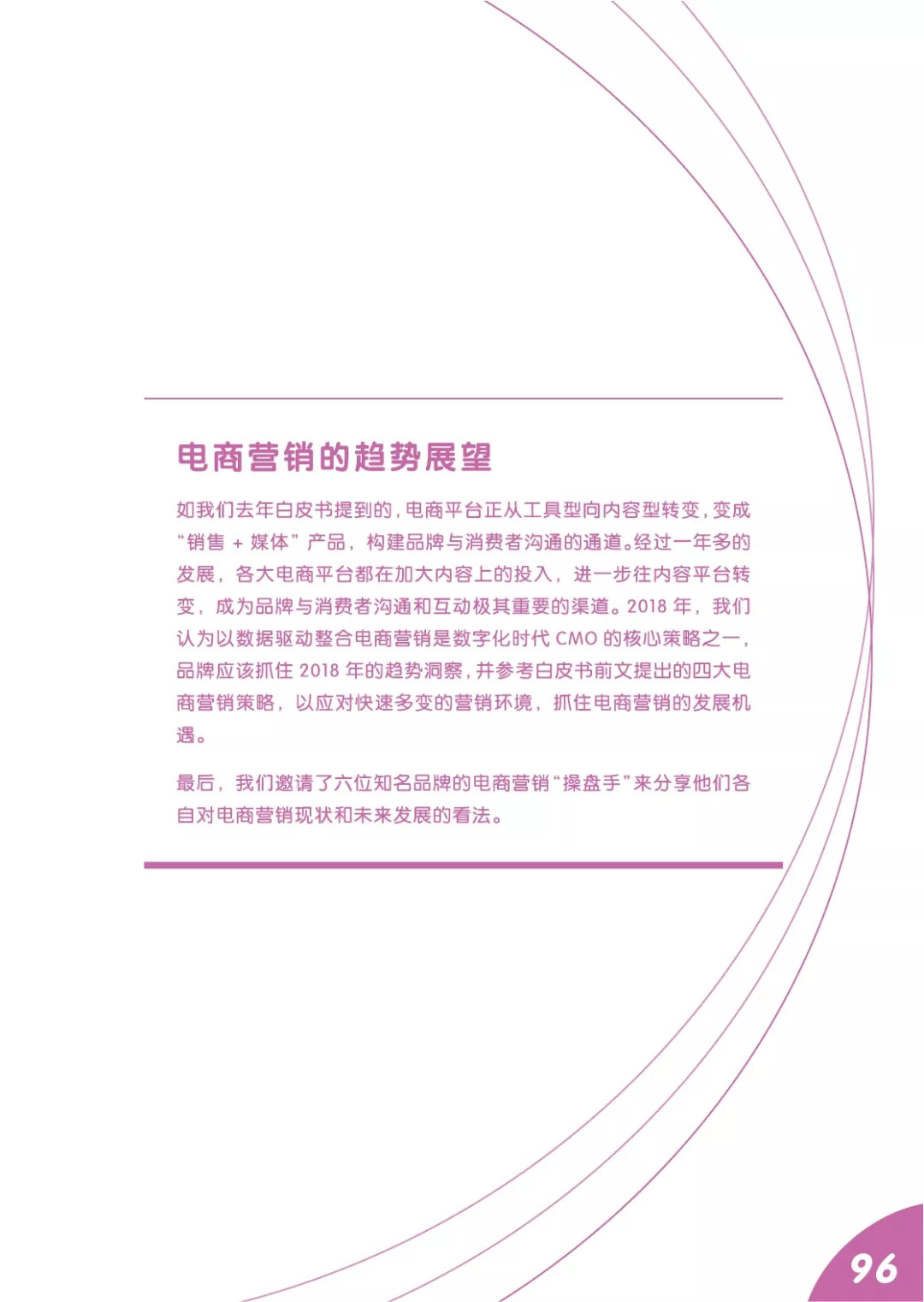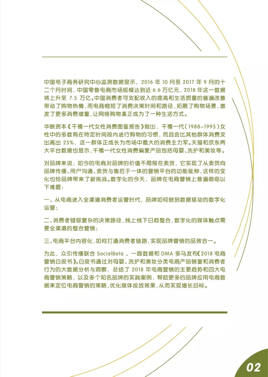众智传播:2018电商营销白皮书 更多阅读:Nanigans:Facebook电商广告数据ClearSaleing:2012年数字营销指南e-tailing group:购物车丢弃营销,电子邮件提醒和重定向广告效果最佳Responsys:2011年全球网络零售商邮件营销现状和趋势Monetate:美国用户20%的情人节礼物将通过线上购买[信息视图]GoodSpy:2021年独立站电商营销报告affiliatewindow:移动设备占电商联盟营销20%的流量电商营销靶向发力 阿里妈妈助力细分市场逆袭kissmetrics:来自1万8千个中小电商网站的分析数据2017微博营销白皮书流量变现白皮书:社交APP如何实现营收闭环CiC:2021年智慧城市白皮书小葫芦:2020直播电商白皮书南方电网:2020年数字电网白皮书中国公路学会:2020交通运输区块链白皮书