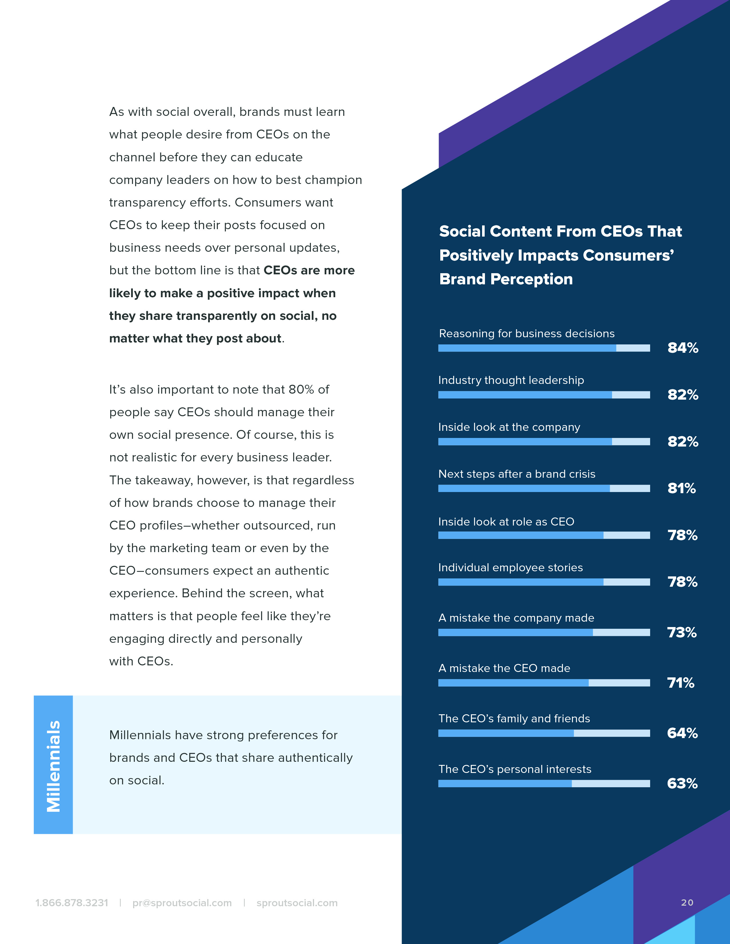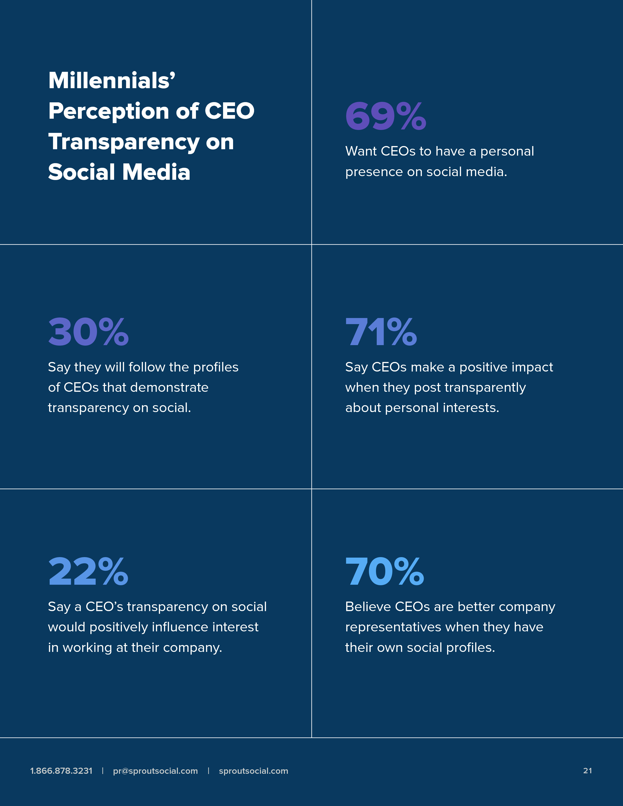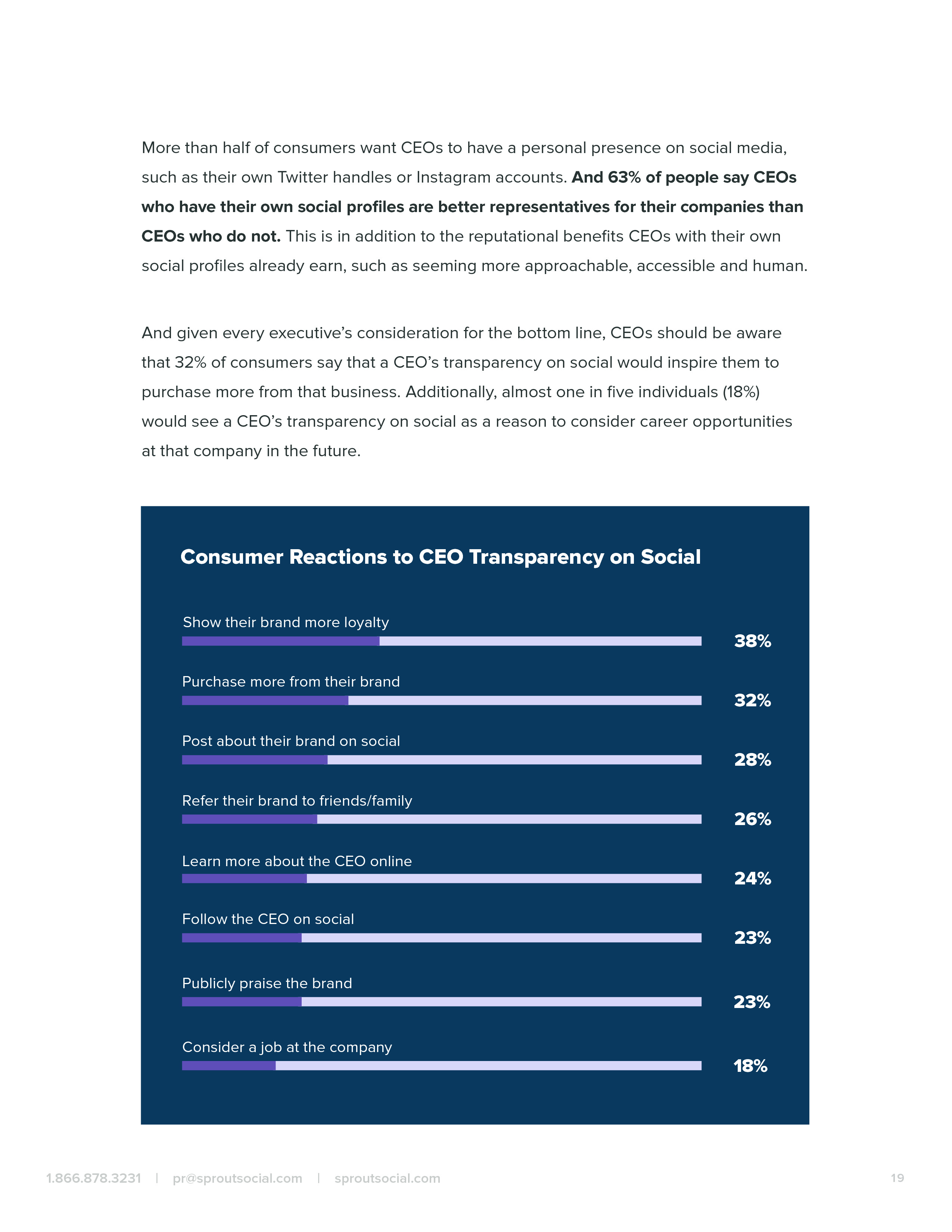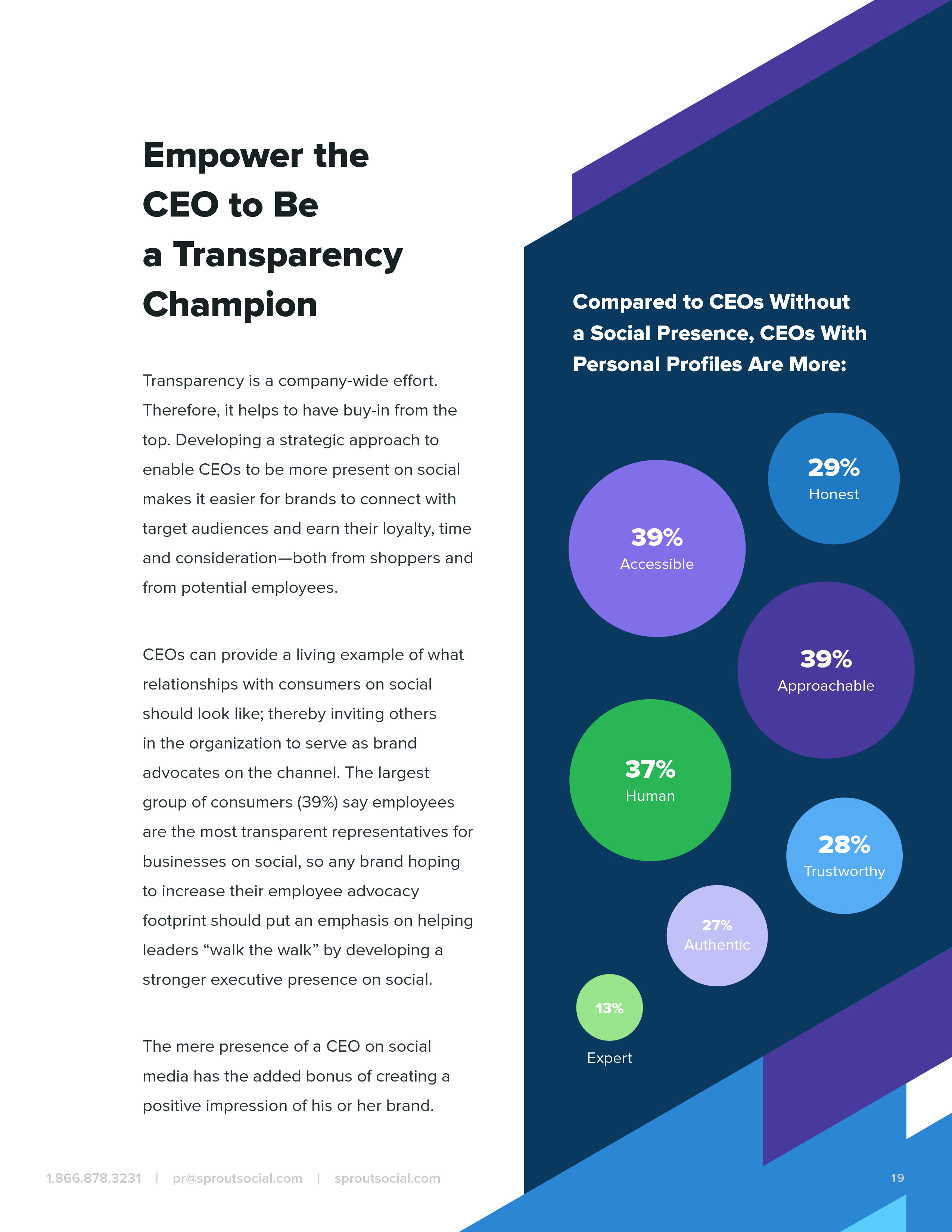 CEO拥有独特的权力来加强社交媒体上的透明度。1/3的消费者表示他们会从首席执行官表现出社交透明度的品牌购买更多产品。通过树立透明度的榜样,首席执行官可以带领员工在社交上分享和提升品牌的真实性。