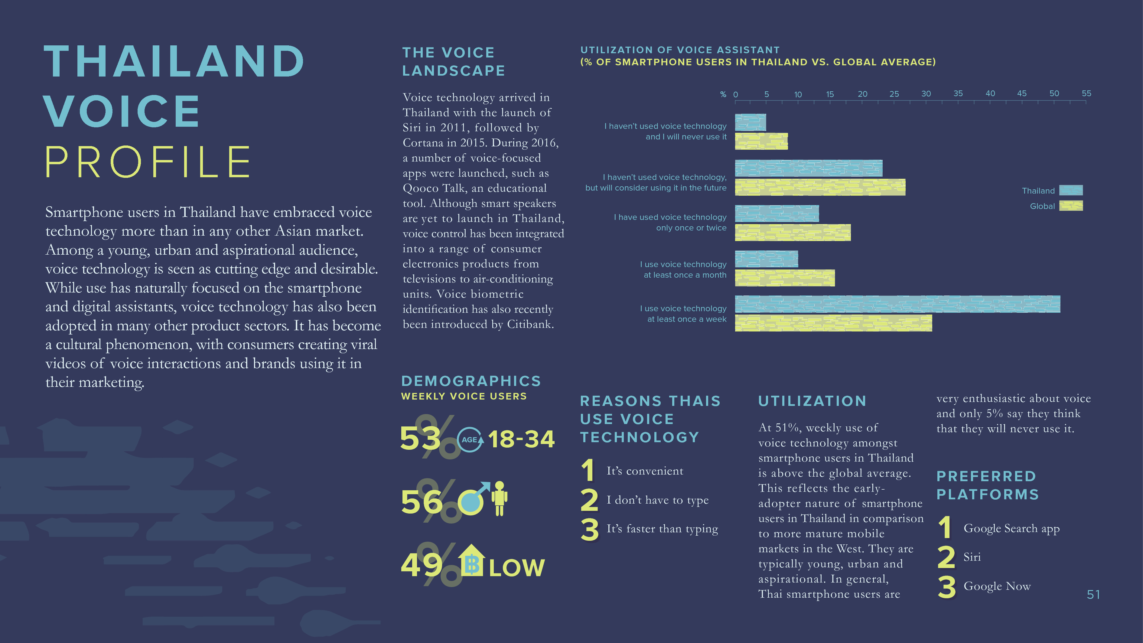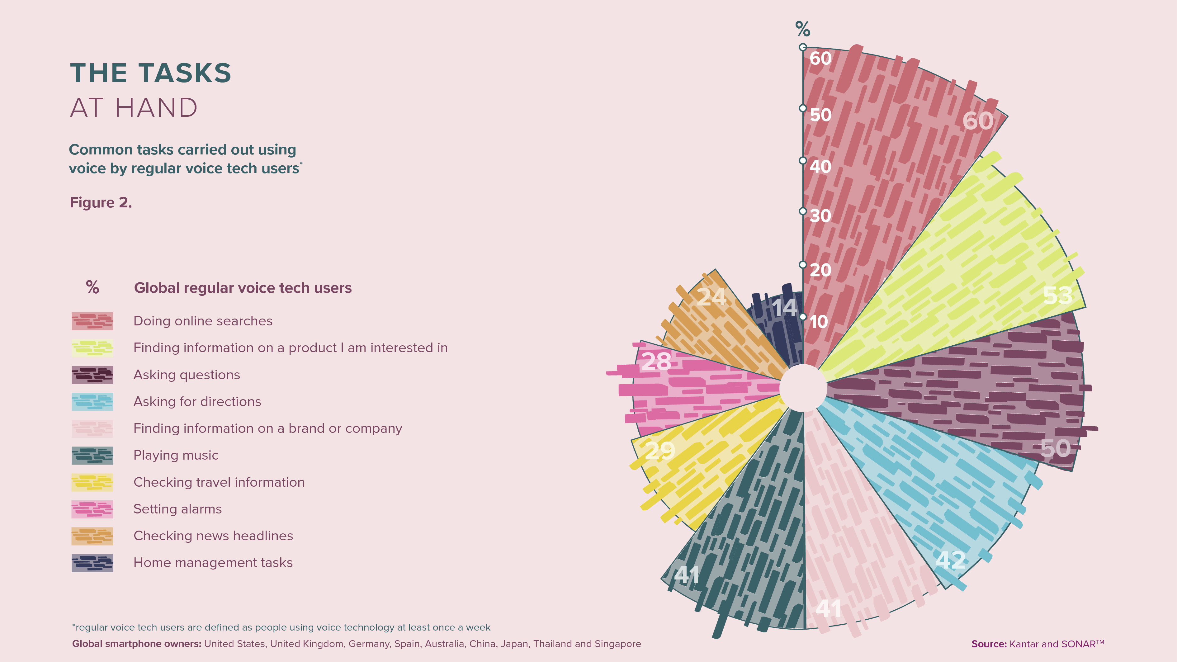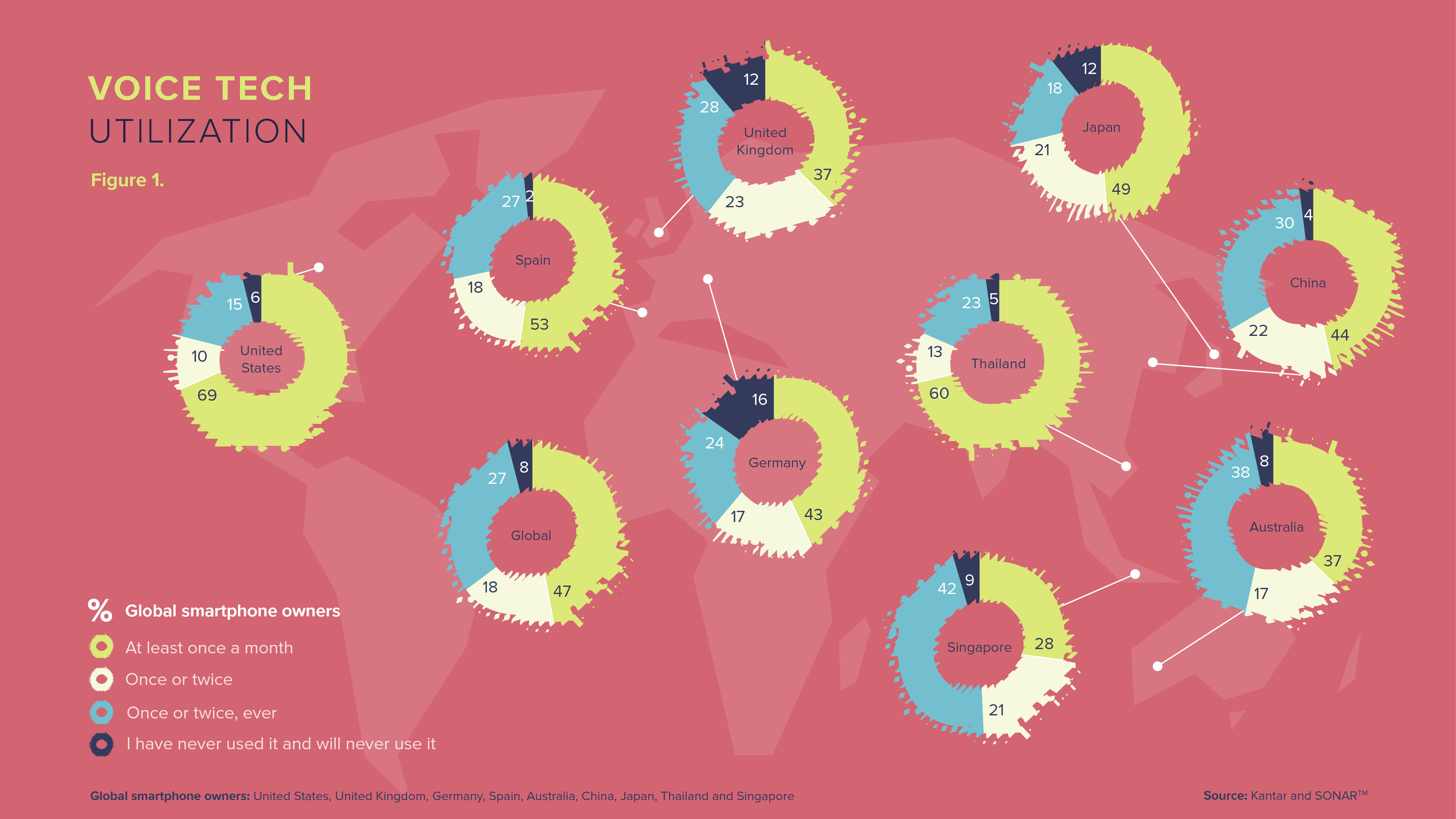 在调查的九个国家中(澳大利亚、中国、德国、日本、新加坡、西班牙、泰国、英国和美国),平均47%的智能手机用户每个月使用语音助手来完成一些任务。31%的受访者每周使用语音助手,这相当于6亿人。