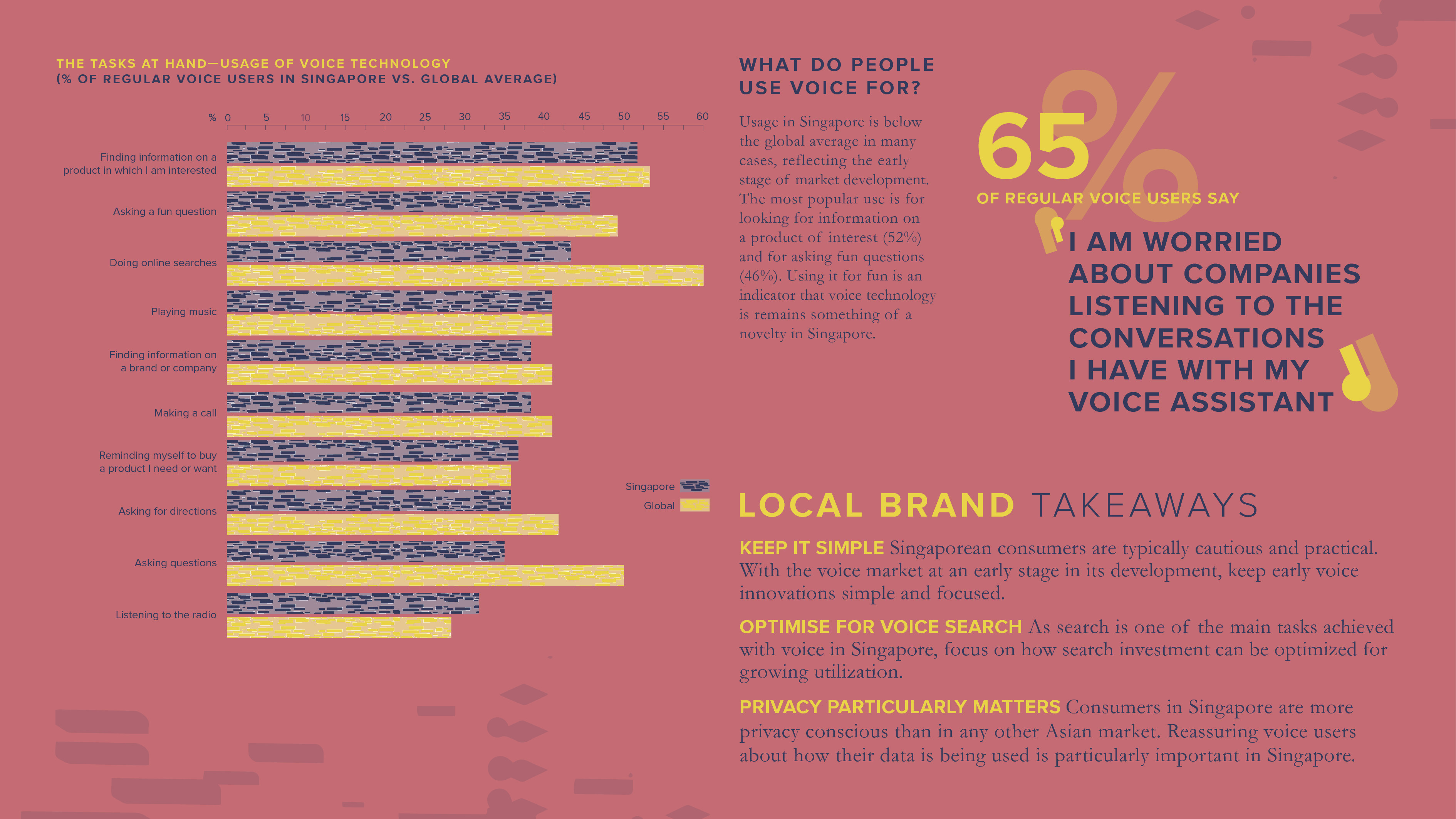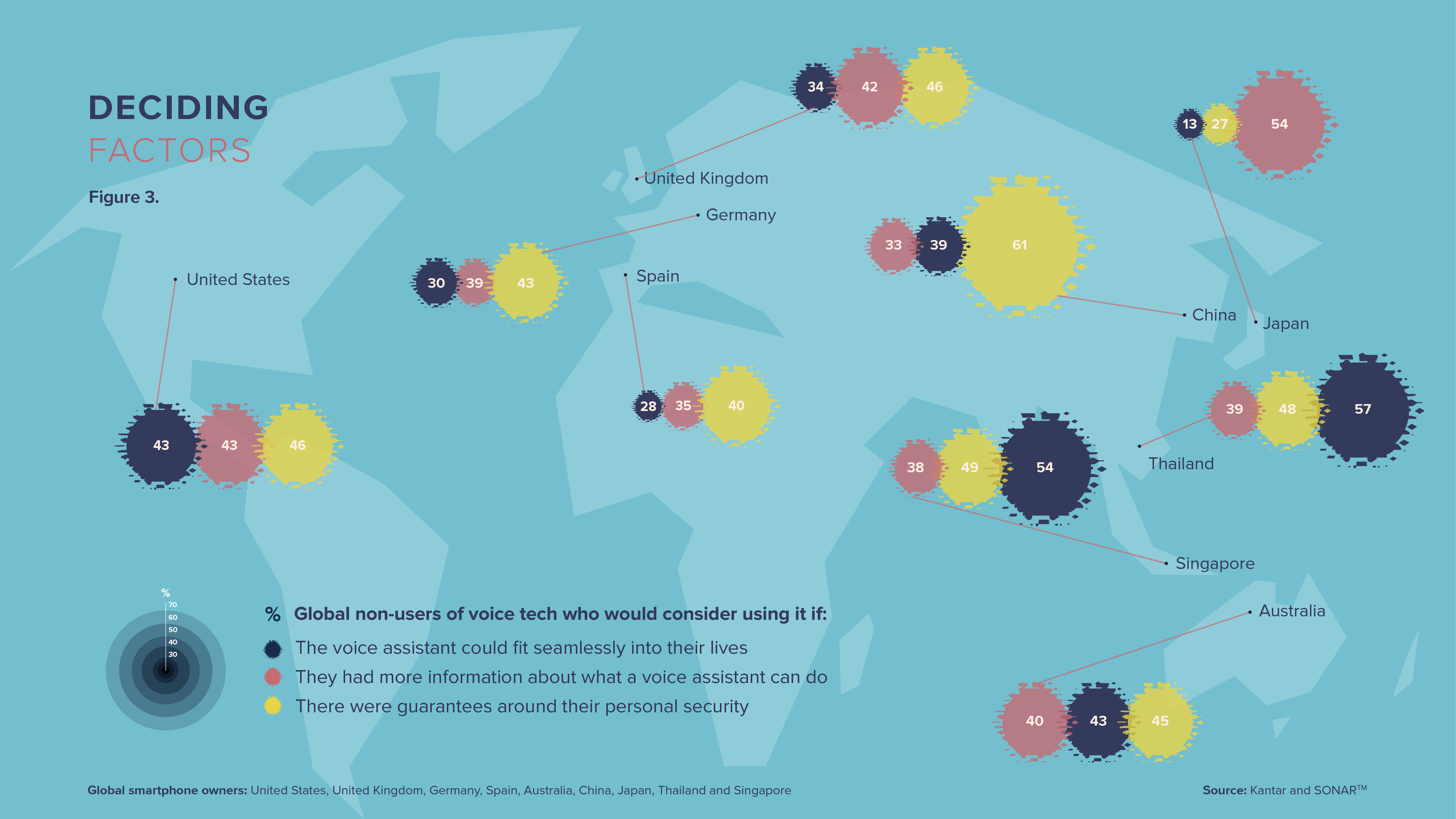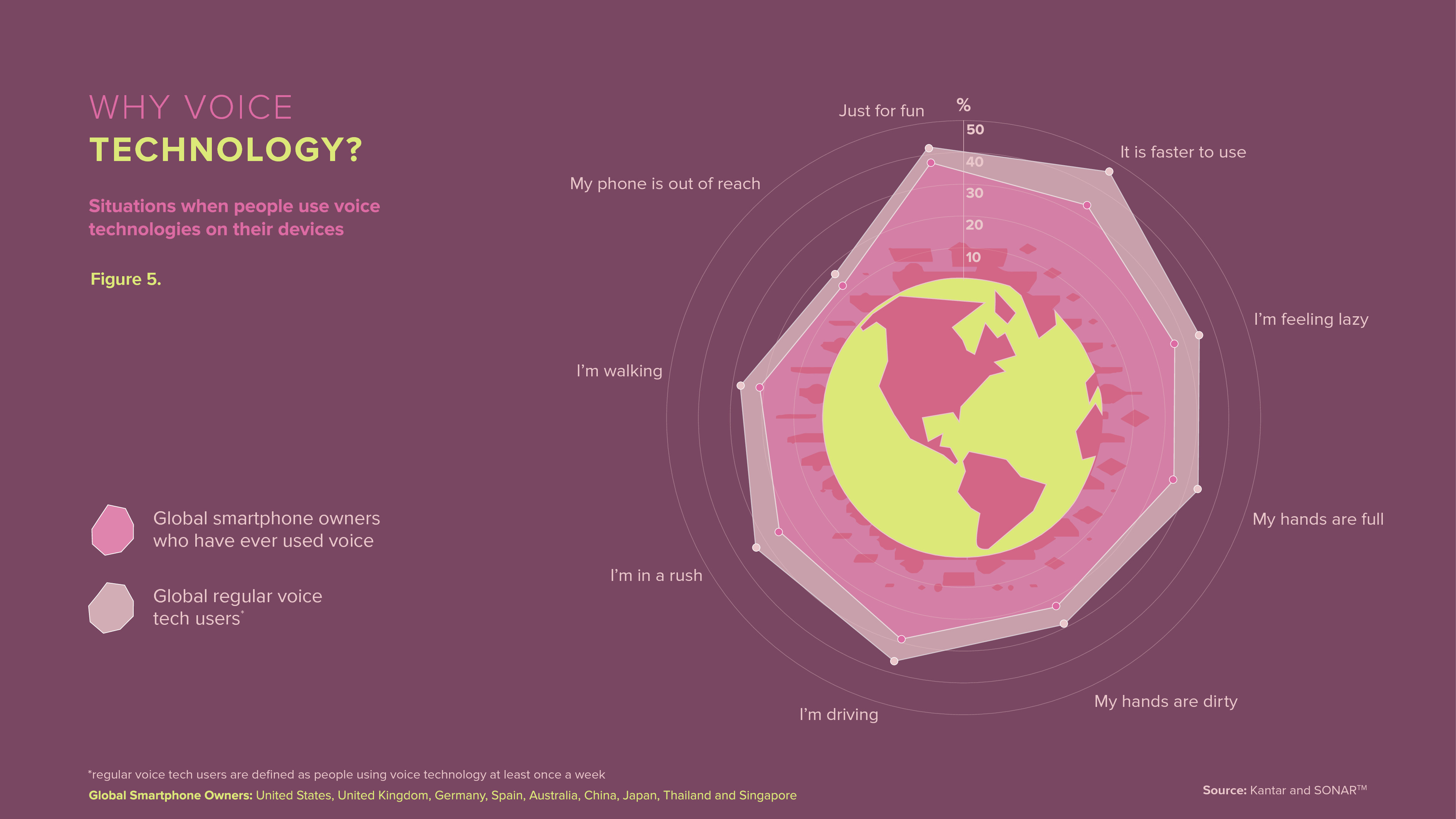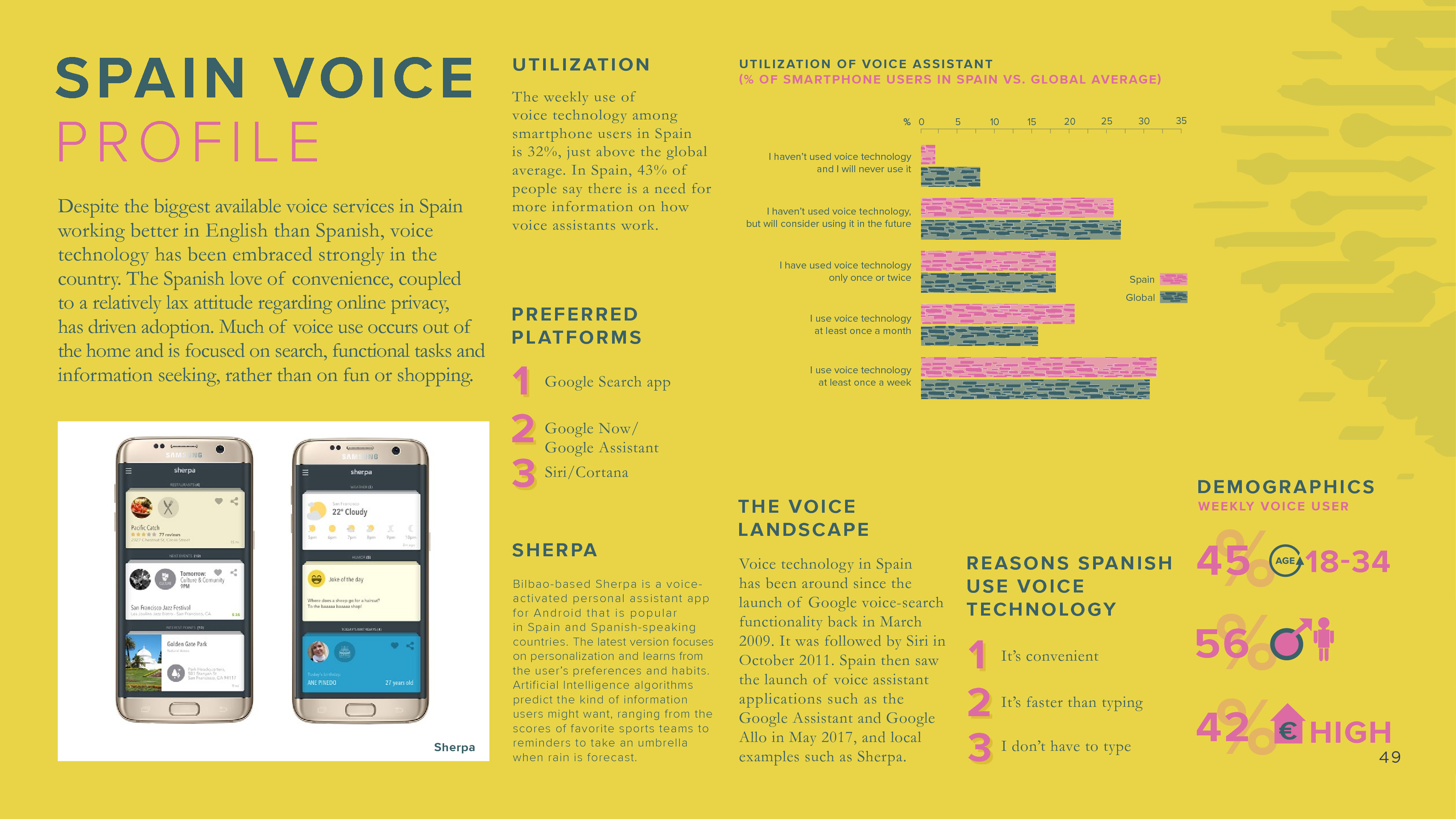 在调查的九个国家中(澳大利亚、中国、德国、日本、新加坡、西班牙、泰国、英国和美国),平均47%的智能手机用户每个月使用语音助手来完成一些任务。31%的受访者每周使用语音助手,这相当于6亿人。