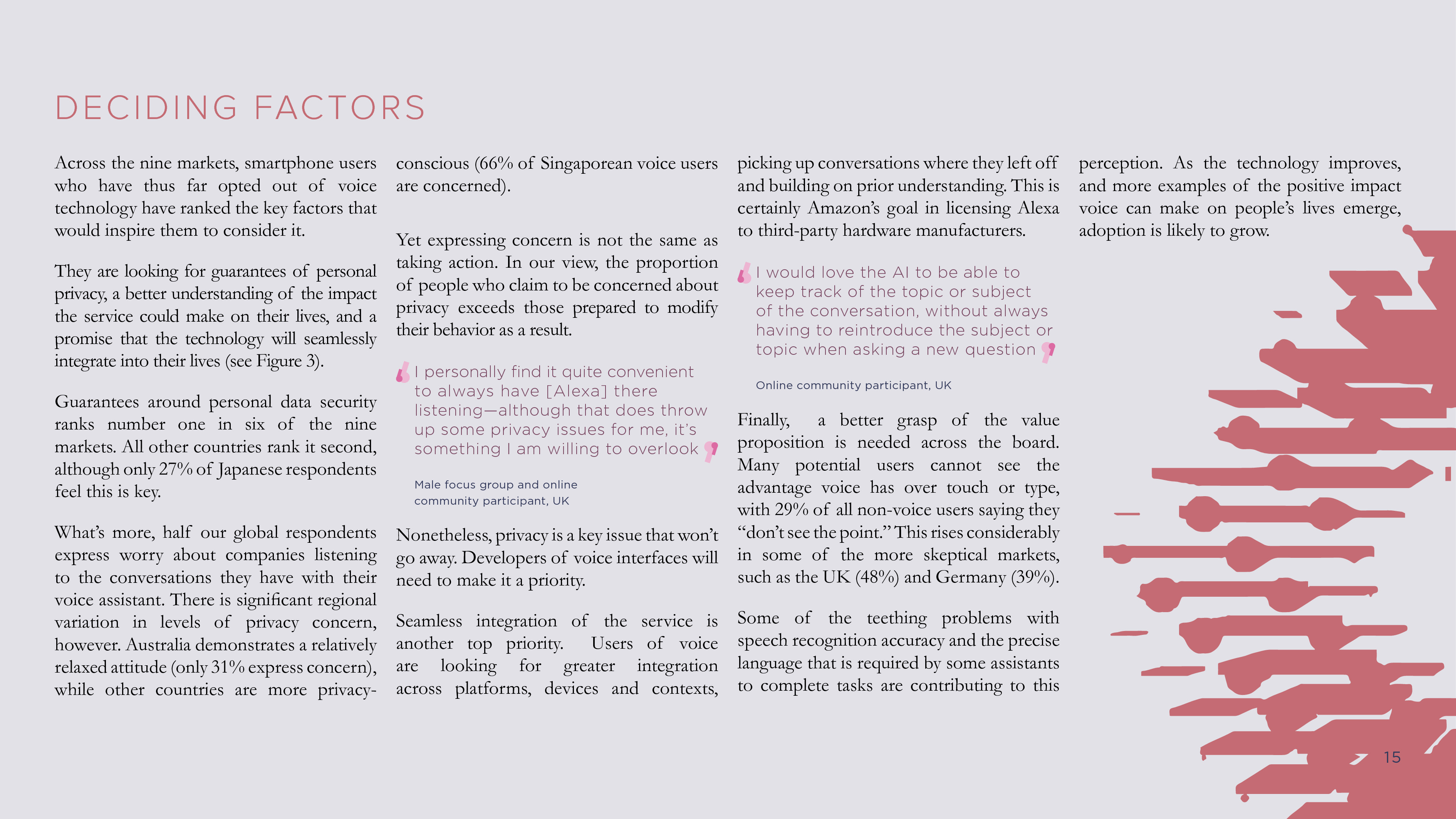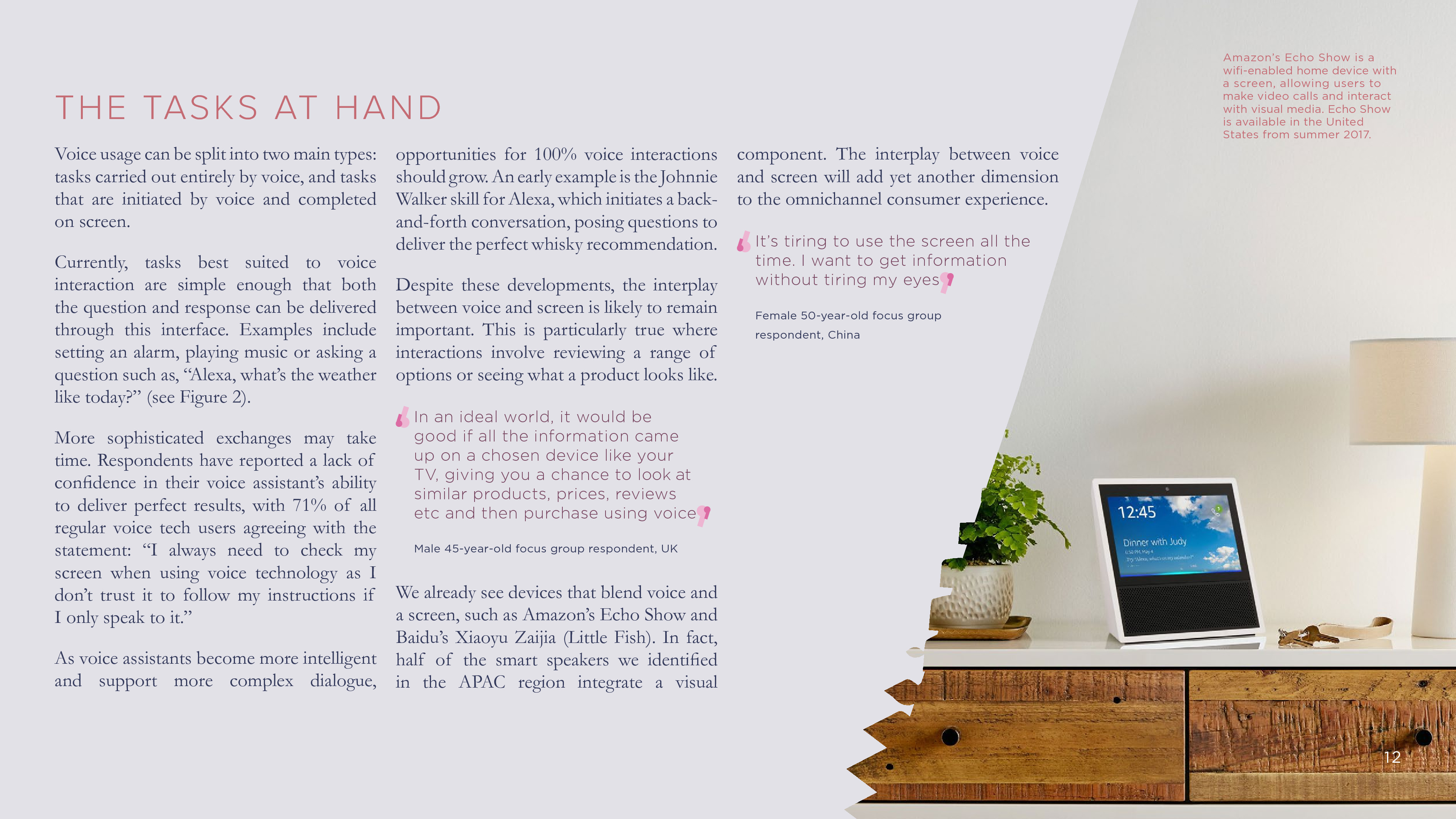 值得注意的是,18%的受访者只用过语音技术一两次,这反映了一些问题,例如,难以理解的口音、方言和少数民族语言是使用语音技术的一个主要障碍,而且不够聪明和不能理解上下文也是个问题。尽管如此,只有8%的受访者表示他们不会再使用语音助手。