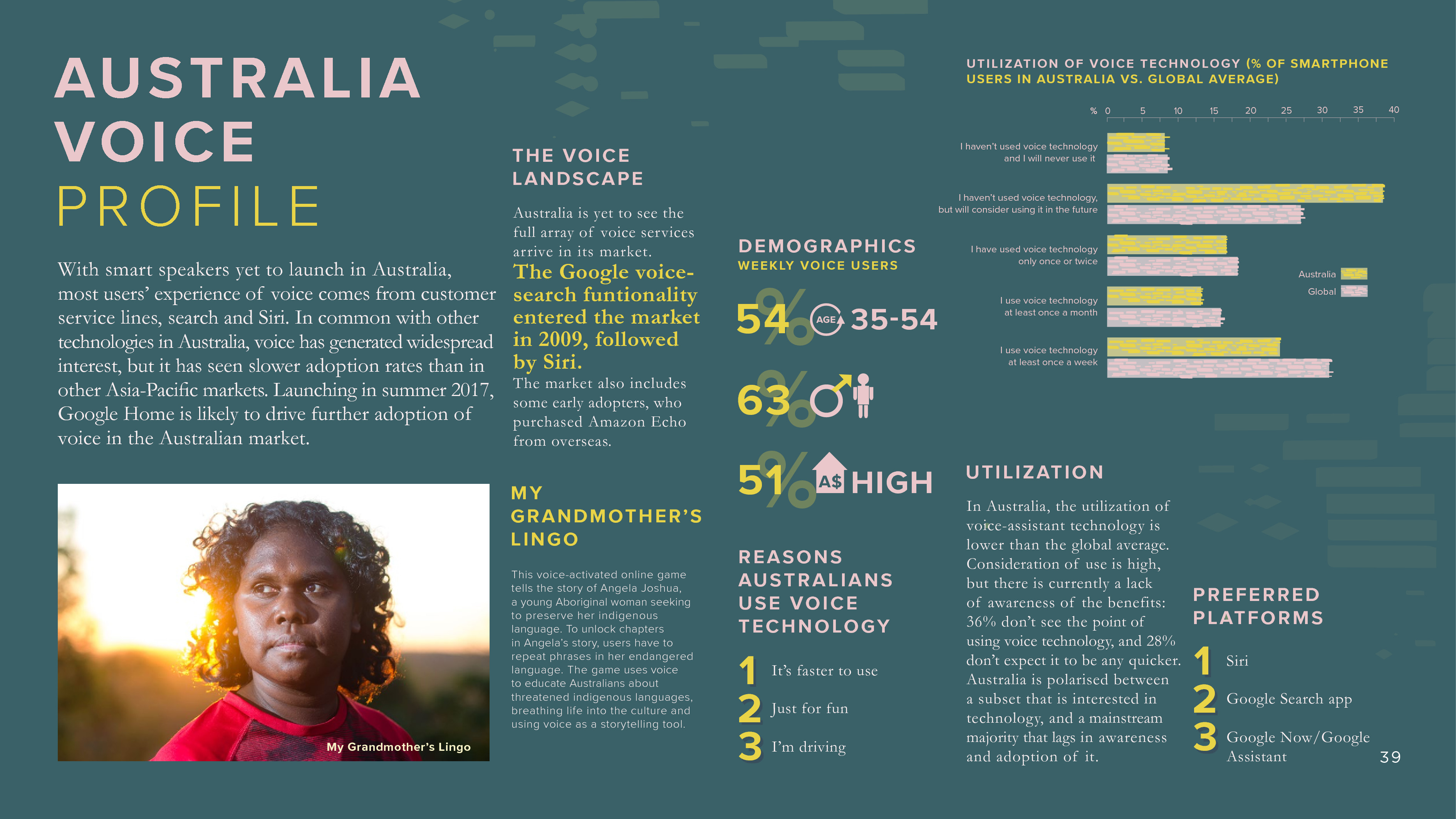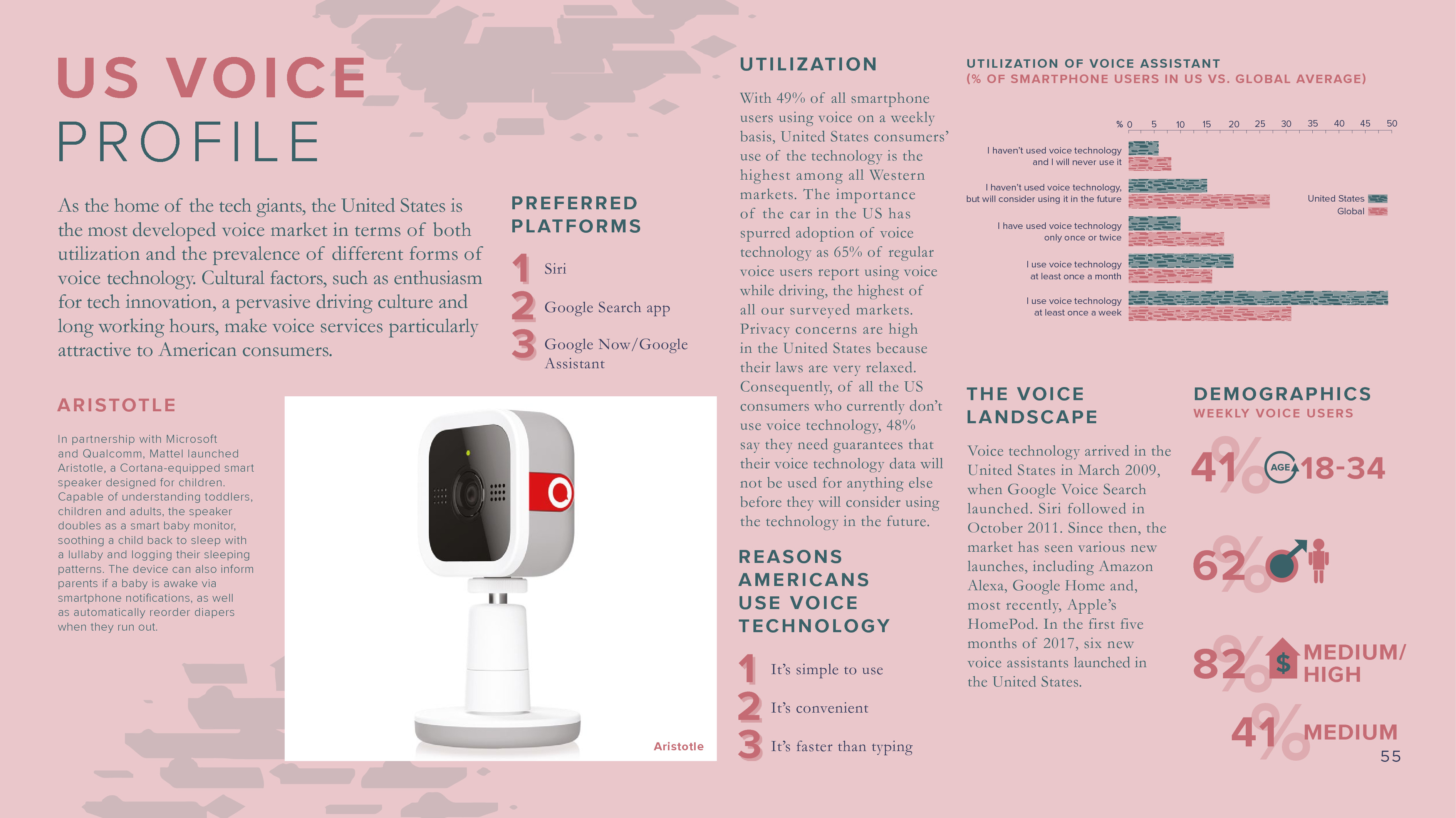 目前,每周使用语音助手的用户更倾向于年轻人(18-34岁占38%),男性(58%),这反映了语音科技还处于早期采用的阶段。