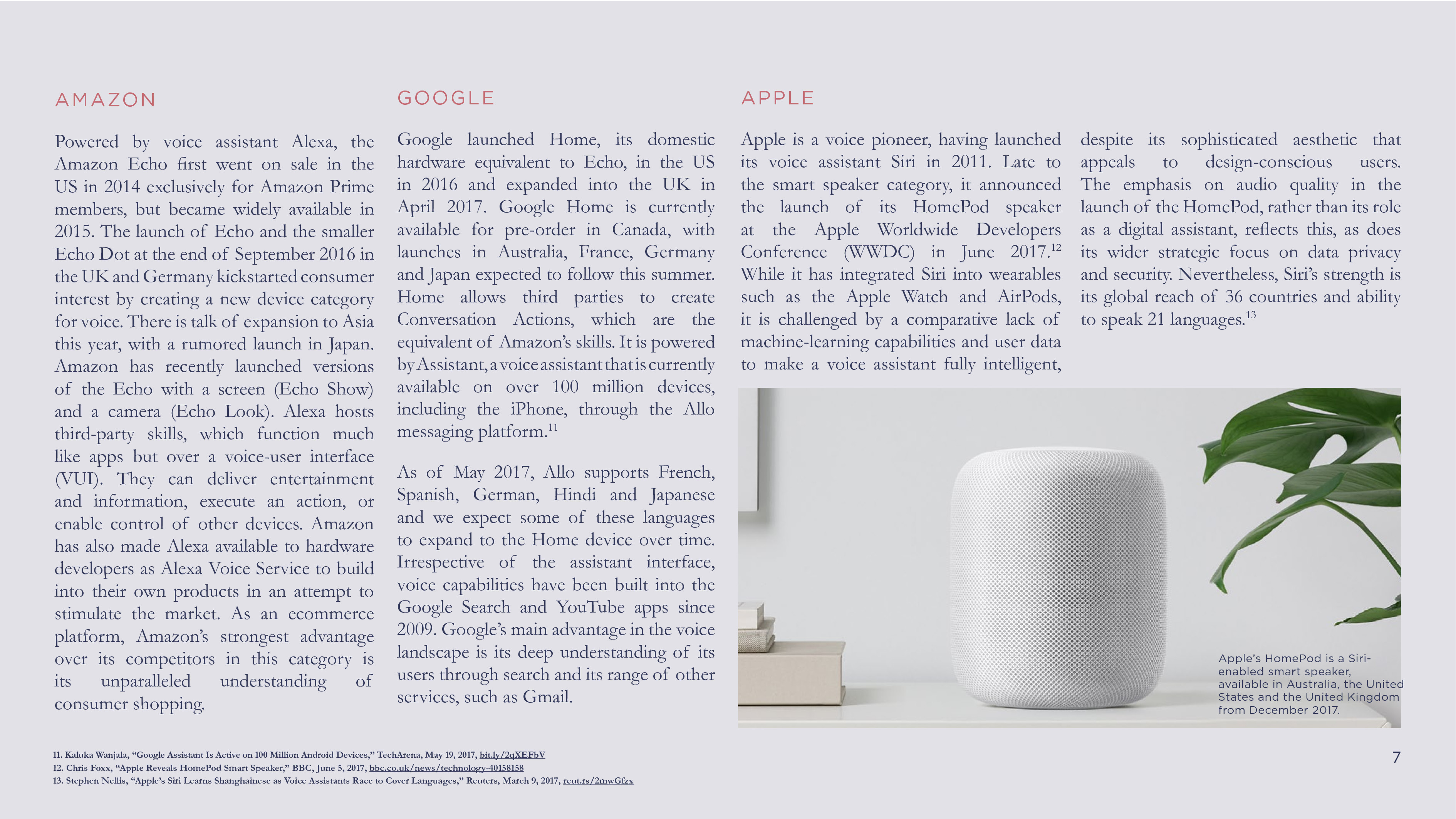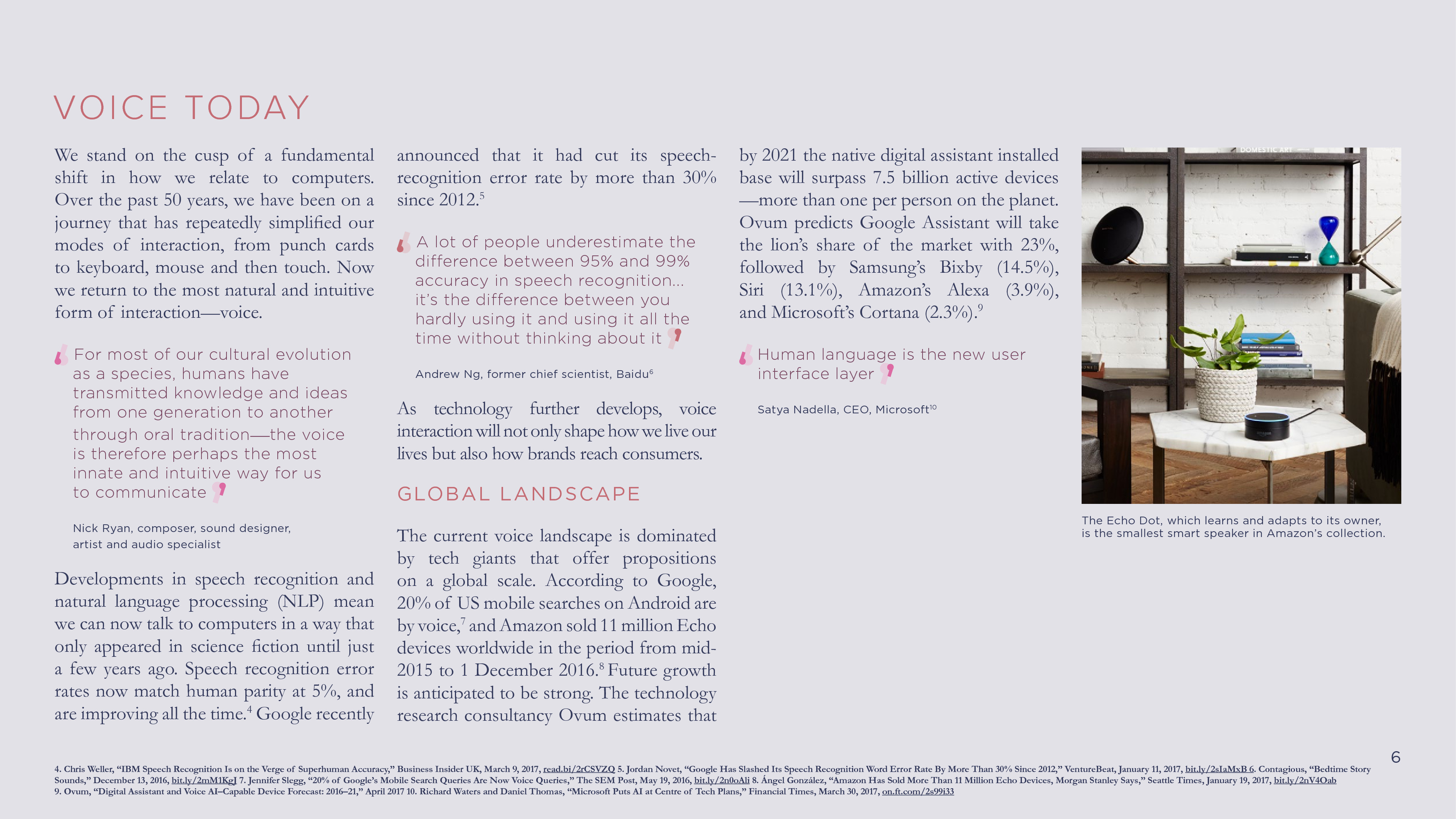 目前,全球语音科技市场由科技巨头主宰。根据谷歌的报道,20%的美国移动搜索量(Android设备)是由声音驱动的。从2015年到2016年12月,亚马逊共销售了1100万台Echo。未来的增长将更强劲。Ovum预计,到2021年内置语音助手的设备数量将超过75亿,超过全球人口总数。Google Assistant占有最大份额(23%),其次是三星的Bixby(14.5%),苹果的Siri(13.1%),亚马逊的Alexa(3.9%)和微软的Cortana(2.3%)。