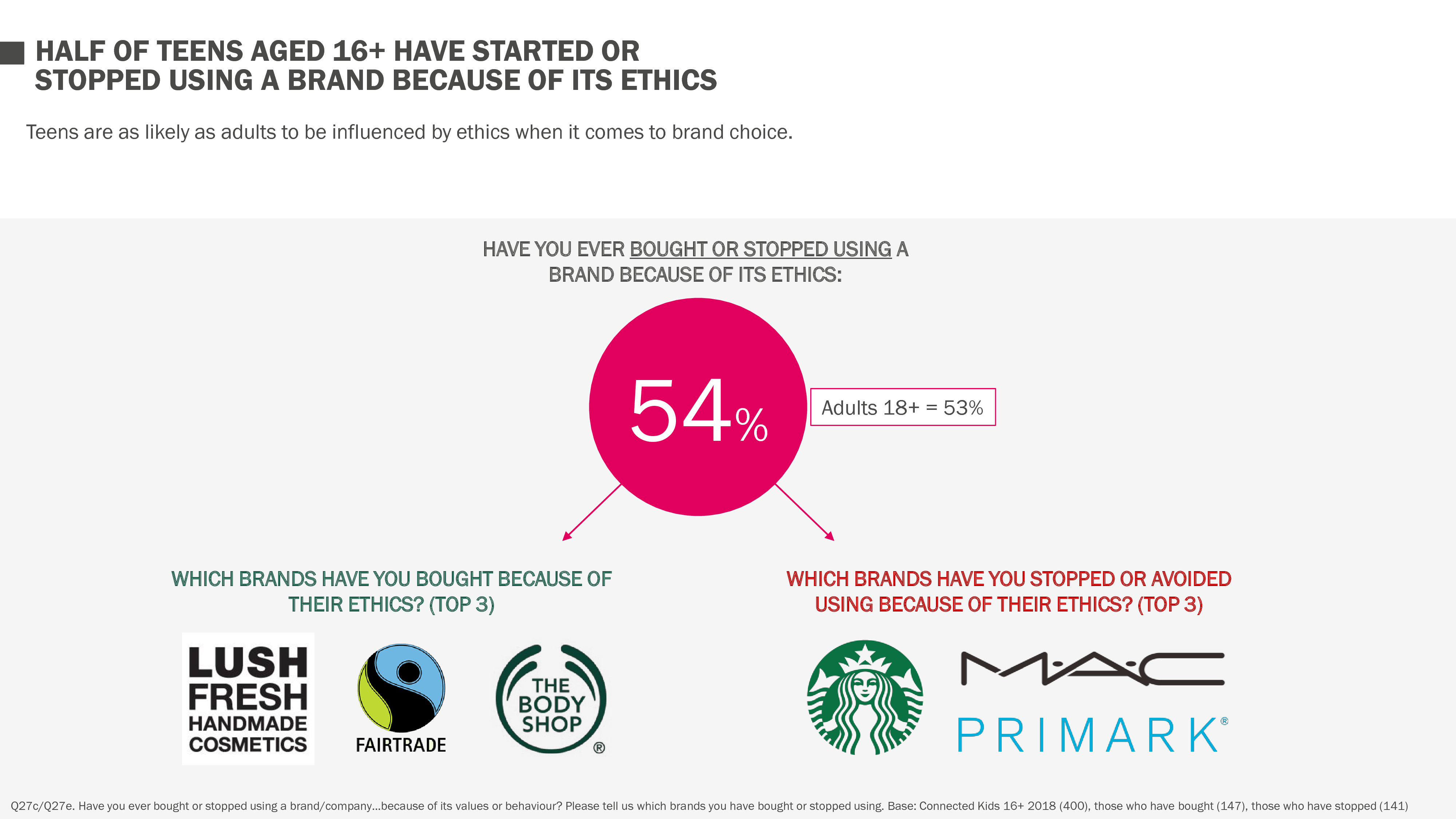 正是因为道德立场,青少年经常购买Lush、The Body Shop和Fairtrade的商品。另一方面,青少年也因为道德原因停止在星巴克、MAC和Primark消费。