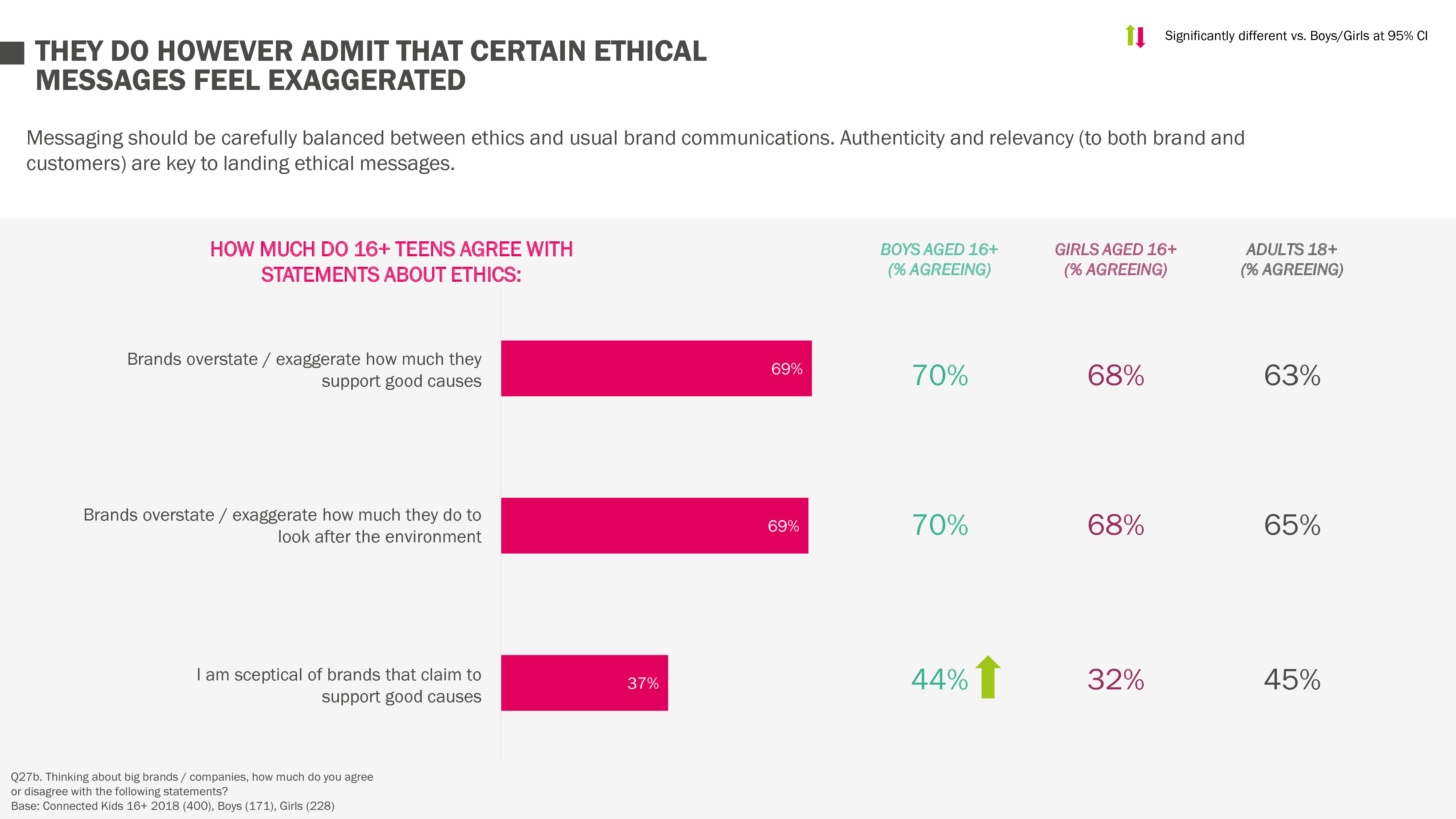 还有一小部分青少年(37%)对那些支持良好事业的品牌持怀疑态度。大多数人认为,品牌夸大了其对这些事业的支持程度(69%)以及对环境的影响(69%)。